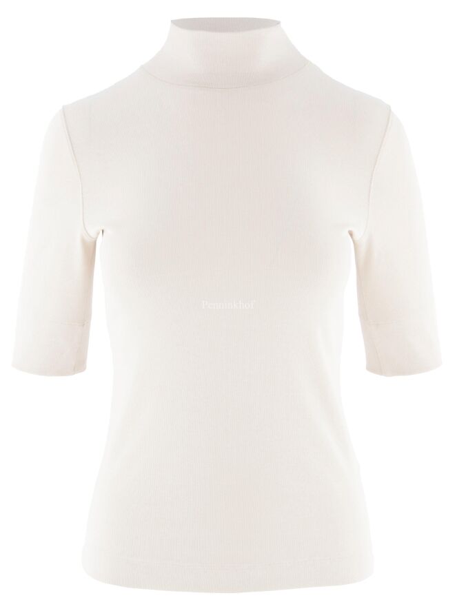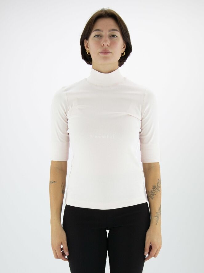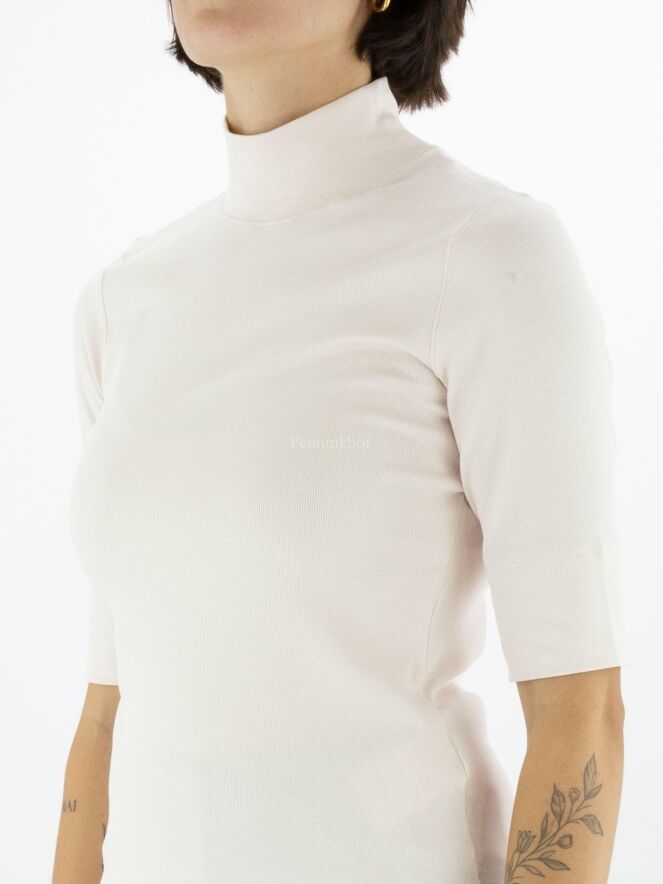 Un T shirt de Marc Cain dans la couleur nude. ce shirt a des manches courtes et un col roulé. Ce T shirt peut être lavée à 30 degrés.