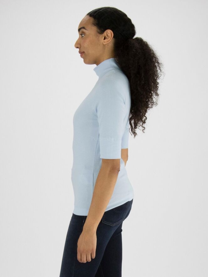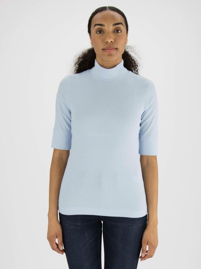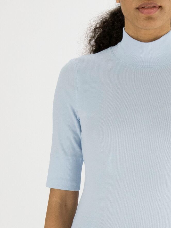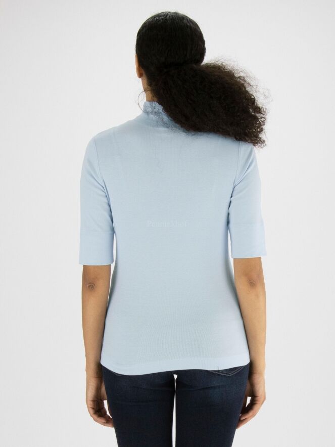 Tee-shirt de la marque Marc Cain de couleur bleu pastel. Manches mi-longues et col montant. Lavage à 30 degrés.