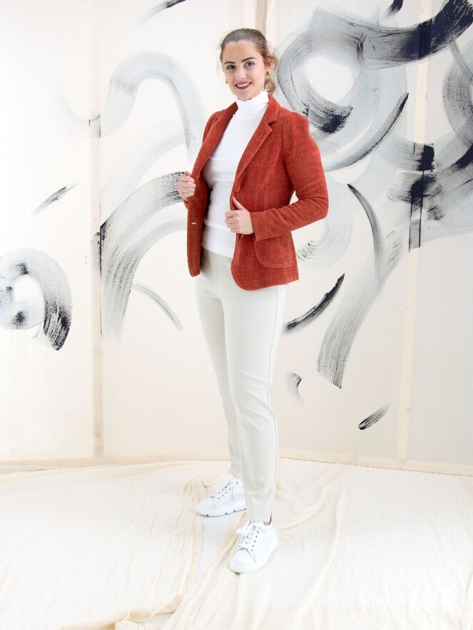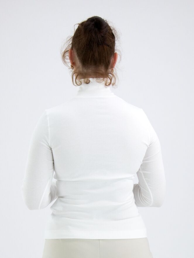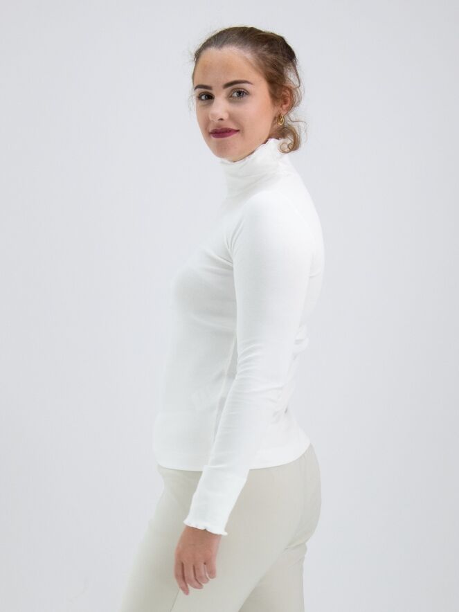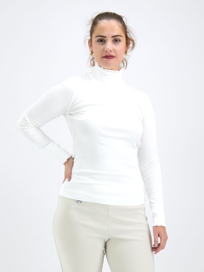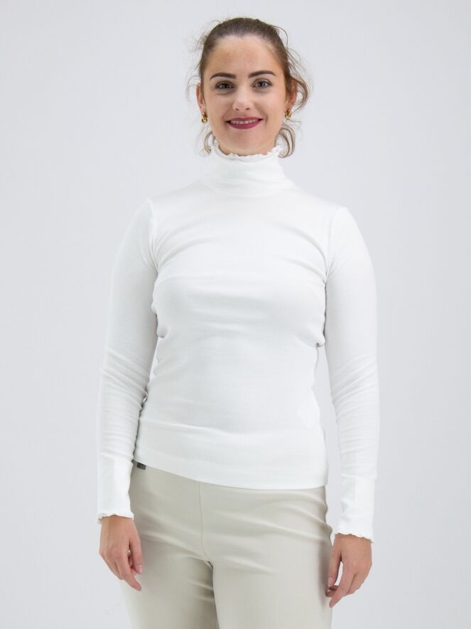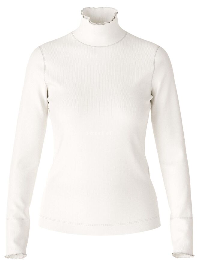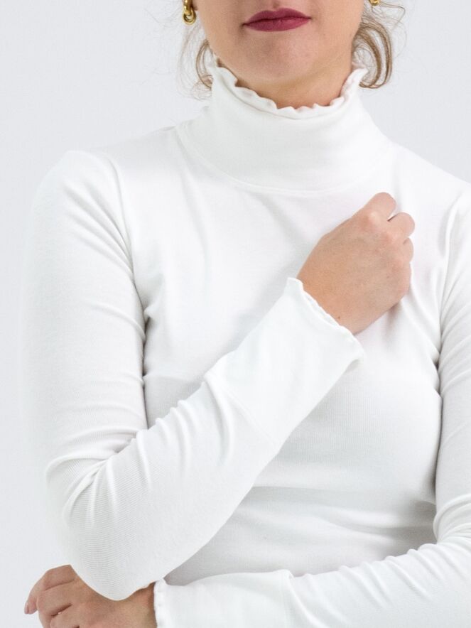 T shirt finement côtelée de Marc Cain en blanc crème. La - shirt a un col roulé avec un bord ondulé. Ce détail revient à l'extrémité des manches longues. Cette chemise peut être lavée à 30 degrés.