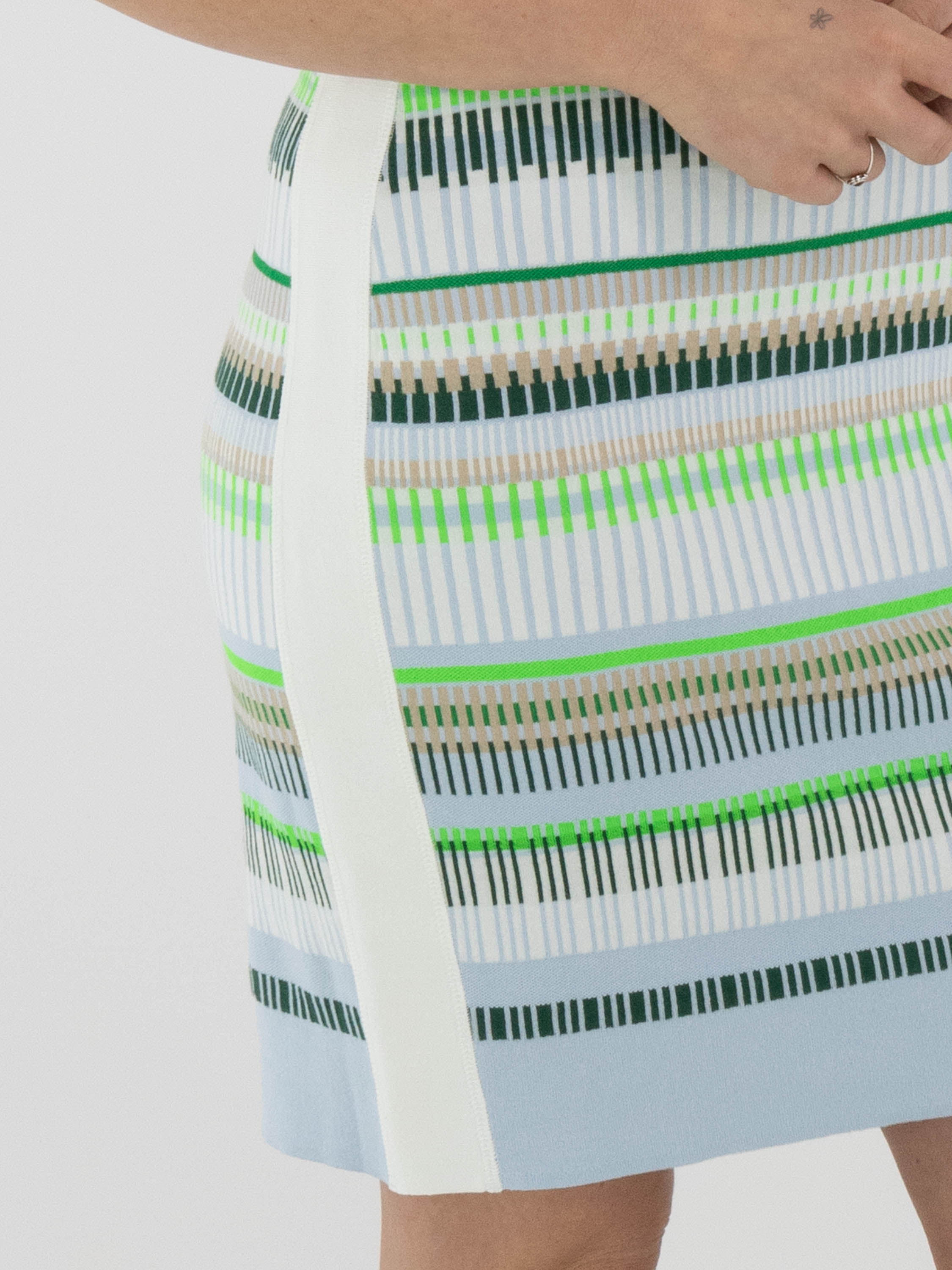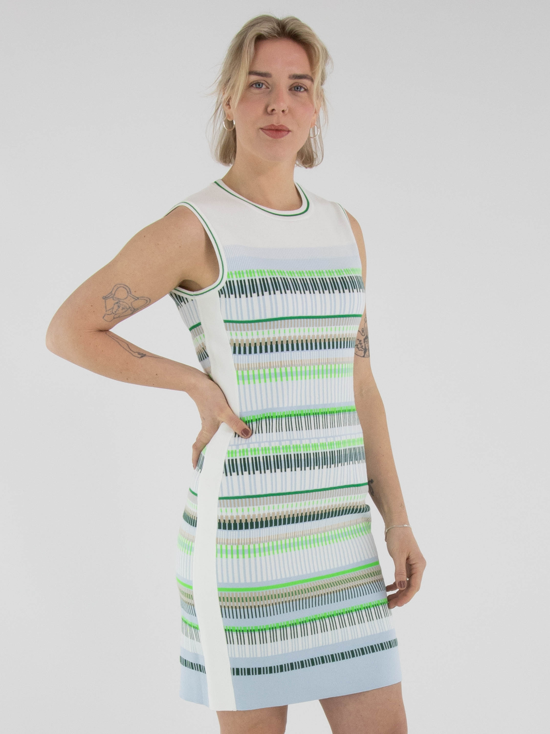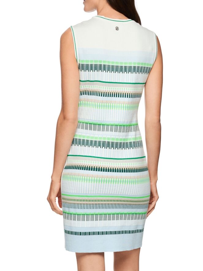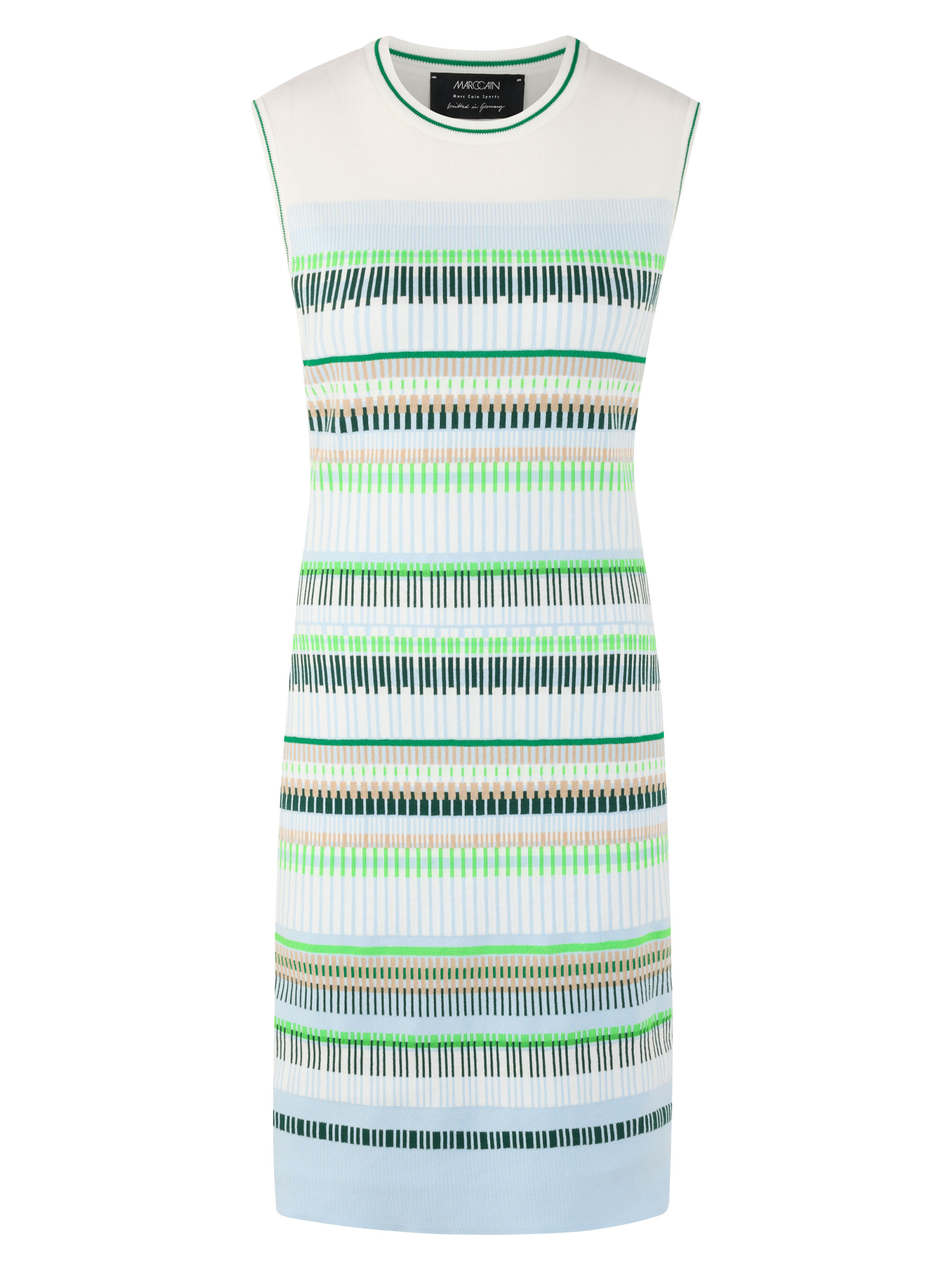 Une robe de Marc Cain avec un motif à rayures dans les tons bleu, sable, vert clair et foncé et blanc. Le long de l’encolure ronde et des emmanchures se trouve une bordure en tricot finement côtelé à rayures blanc crème et vert. De larges bandes blanc crème longent les côtés. Cette robe peut être lavée à 30 degrés.
