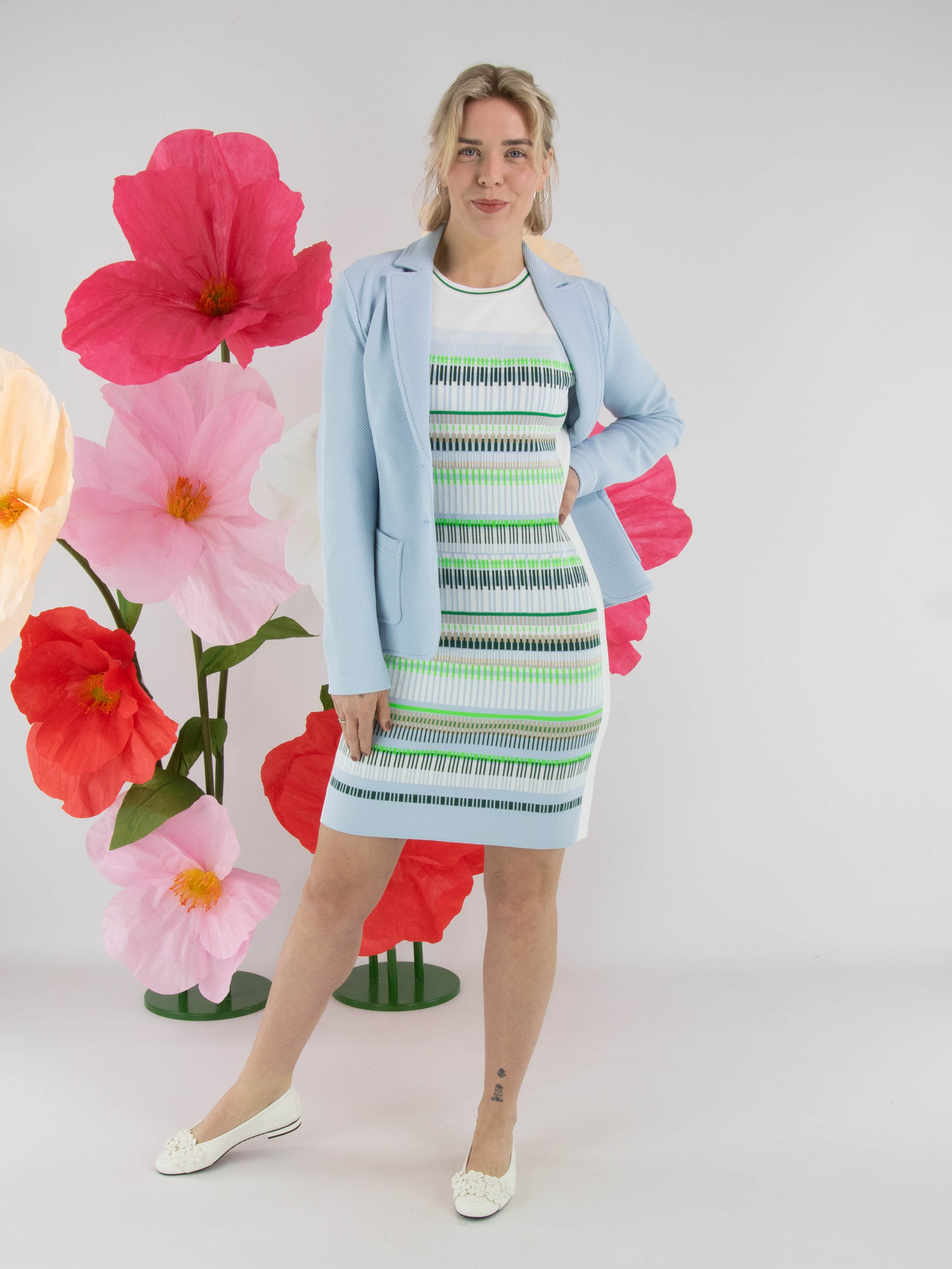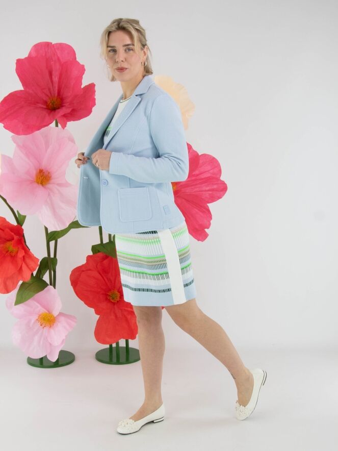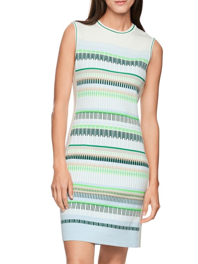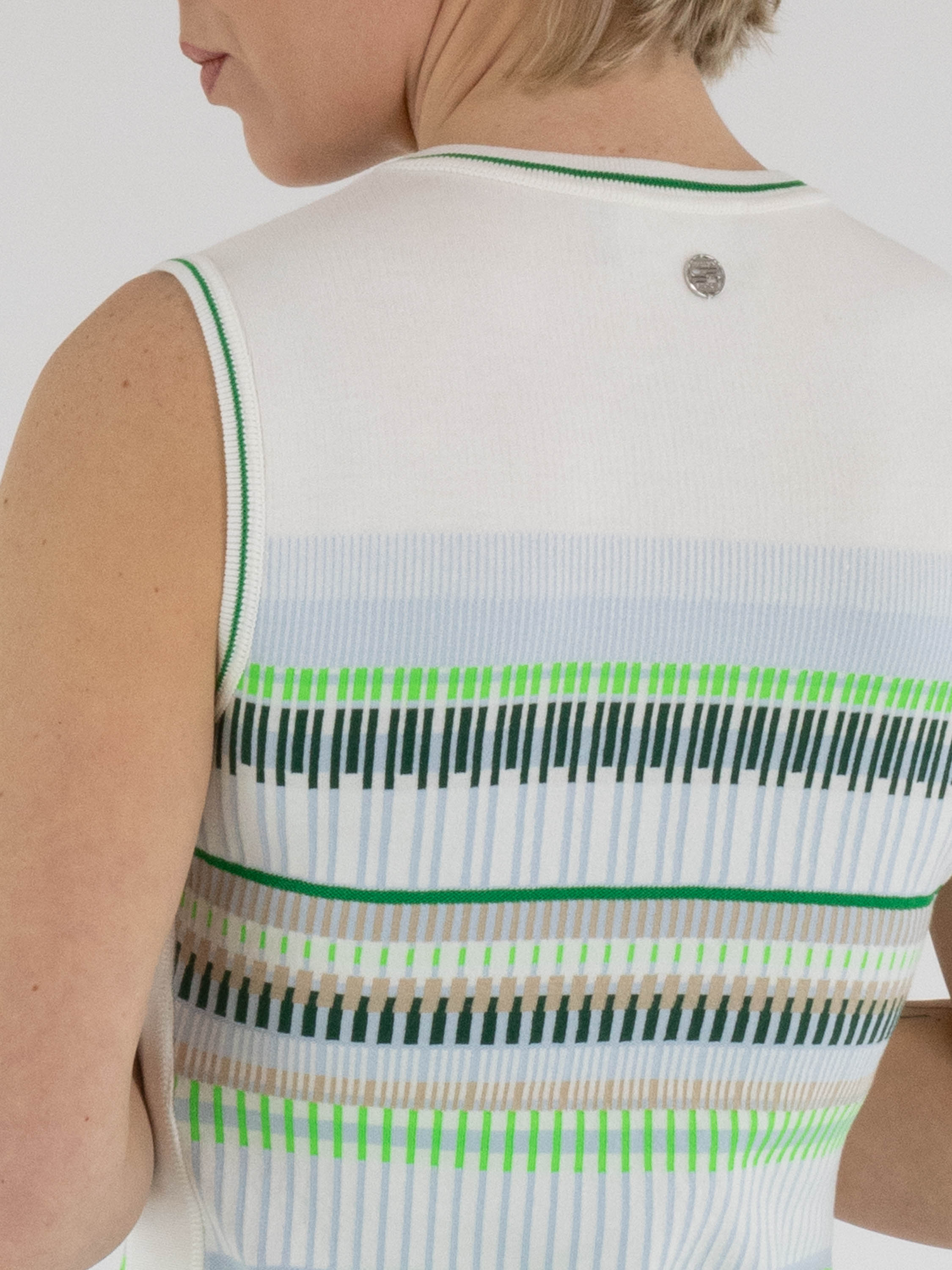 Une robe de Marc Cain avec un motif à rayures dans les tons bleu, sable, vert clair et foncé et blanc. Le long de l’encolure ronde et des emmanchures se trouve une bordure en tricot finement côtelé à rayures blanc crème et vert. De larges bandes blanc crème longent les côtés. Cette robe peut être lavée à 30 degrés.