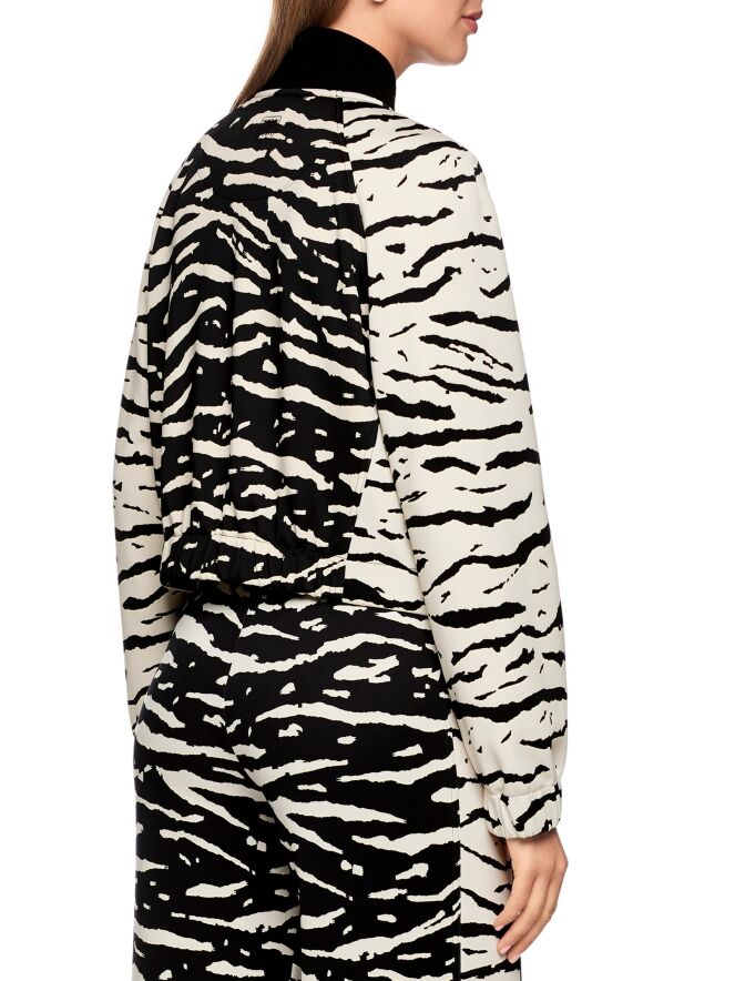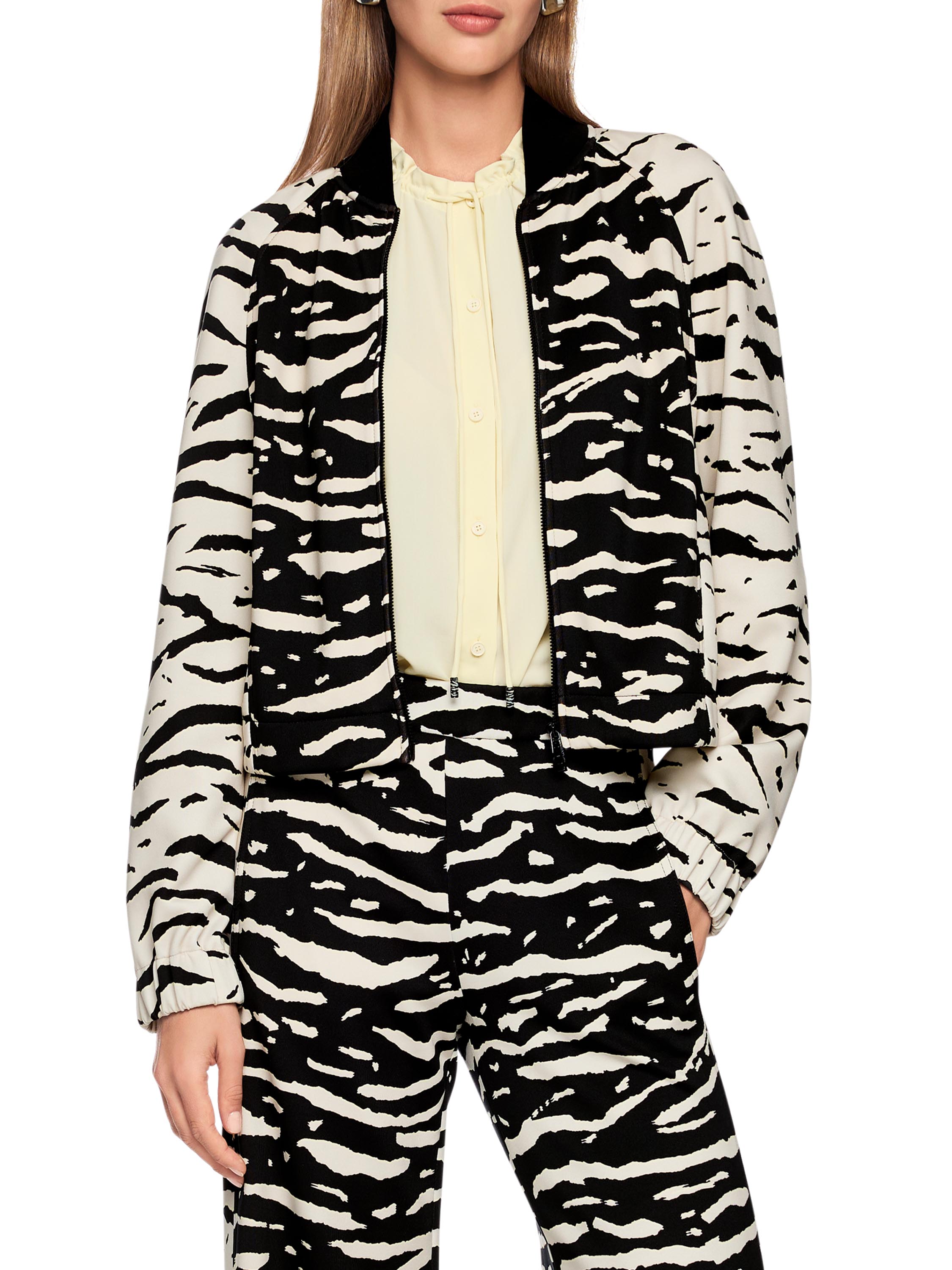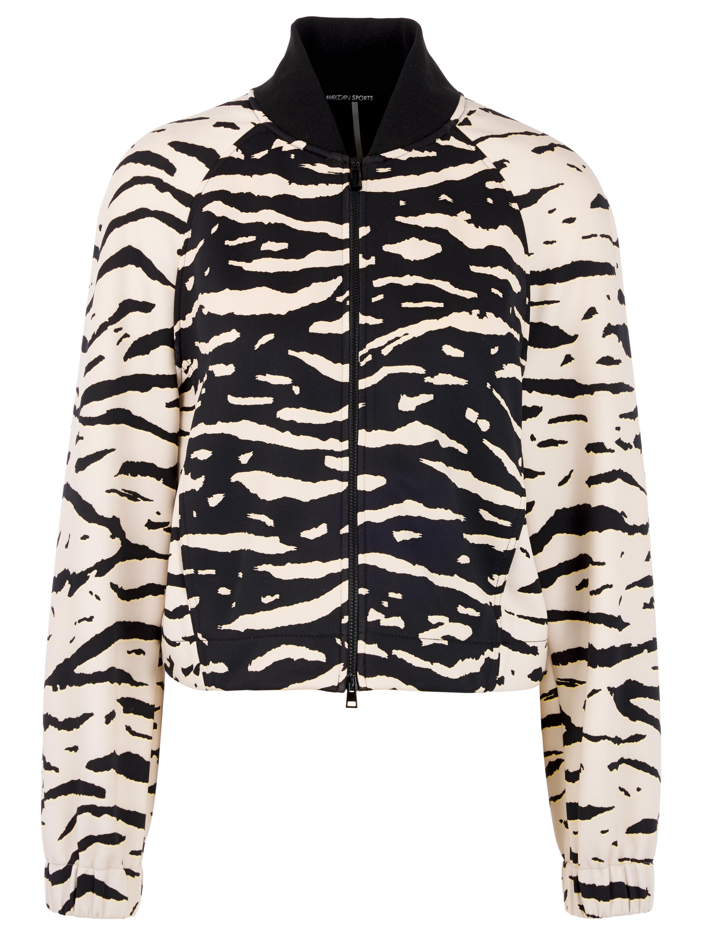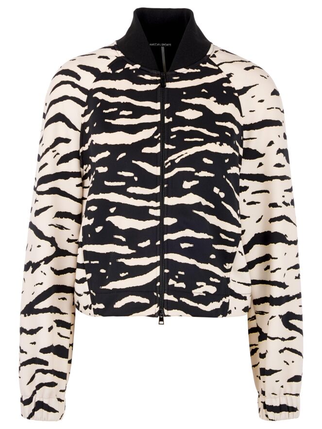Un cardigan de Marc Cain à imprimé zèbre en noir et beige. L’encolure est bordée d’une maille noire finement côtelée. Aux extrémités des manches longues se trouve un large poignet élastique dont les bords sont délicatement plissés. Le cardigan possède une fermeture zippée et peut être lavé à 30 degrés.