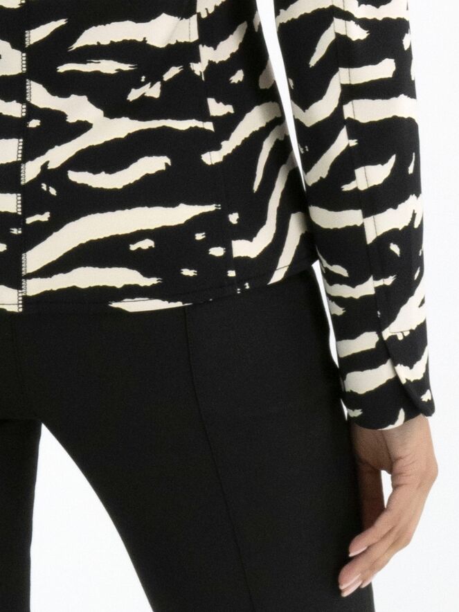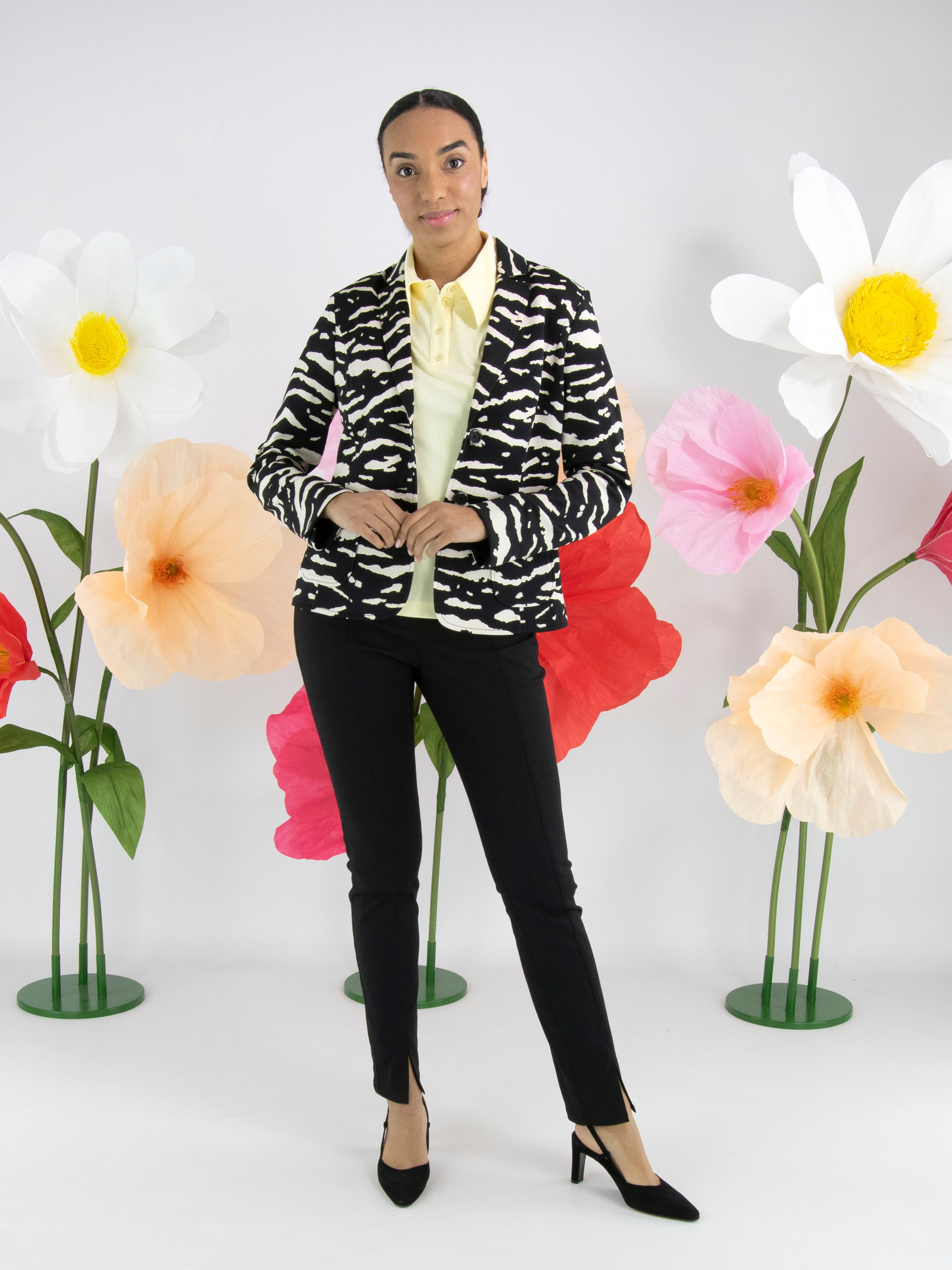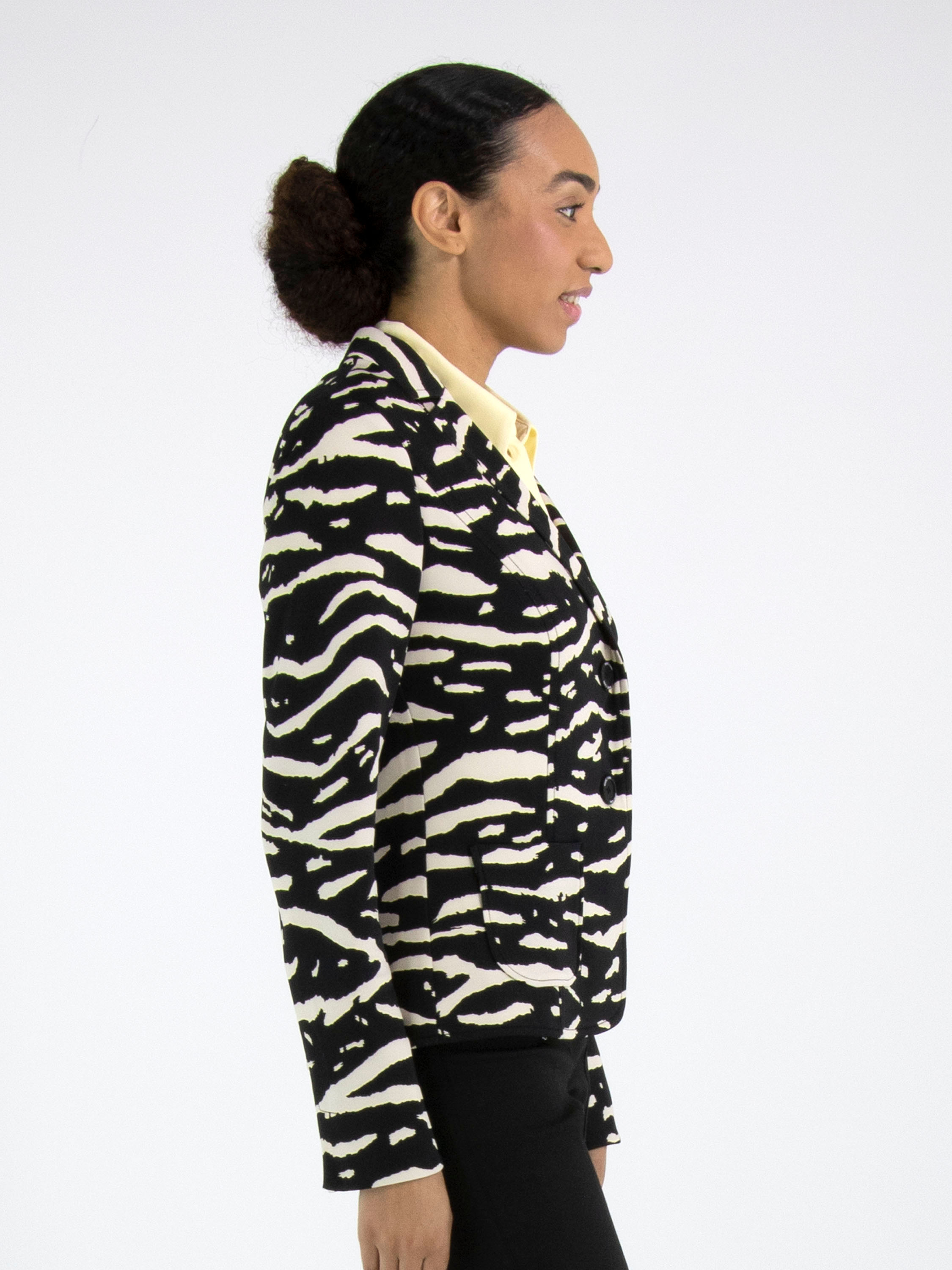 Un blazer de Marc Cain à imprimé zèbre en noir et beige. Le blazer est en matière scuba et possède une fermeture à 2 boutons. Ce blazer peut être lavé à 30 degrés.