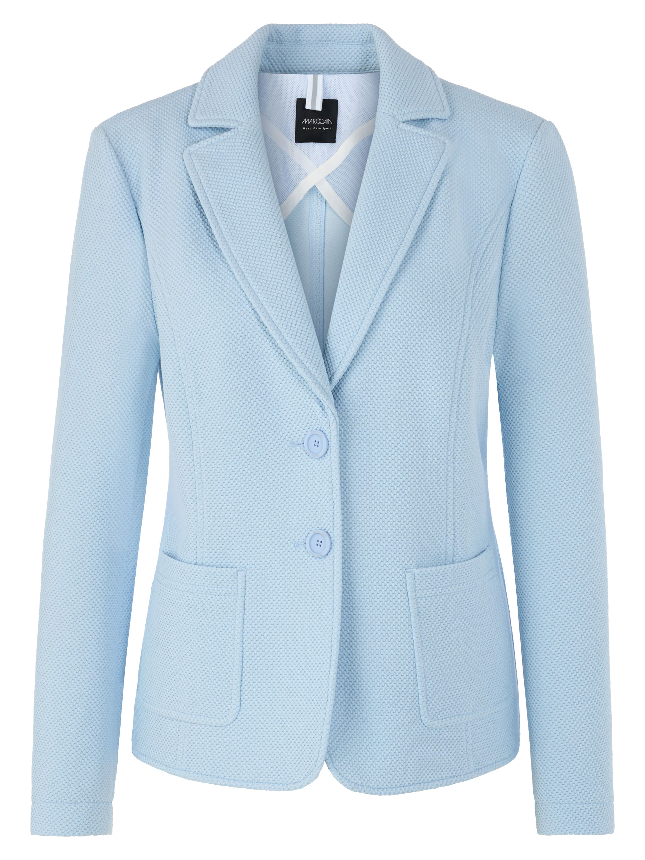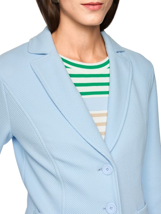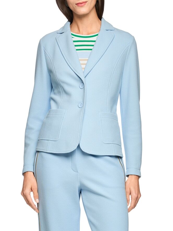 Un blazer de Marc Cain avec une structure grainée de couleur bleue. Le blazer est légèrement cintré et se ferme à l’aide de deux boutons. Ce blazer peut être lavé à 30 degrés.