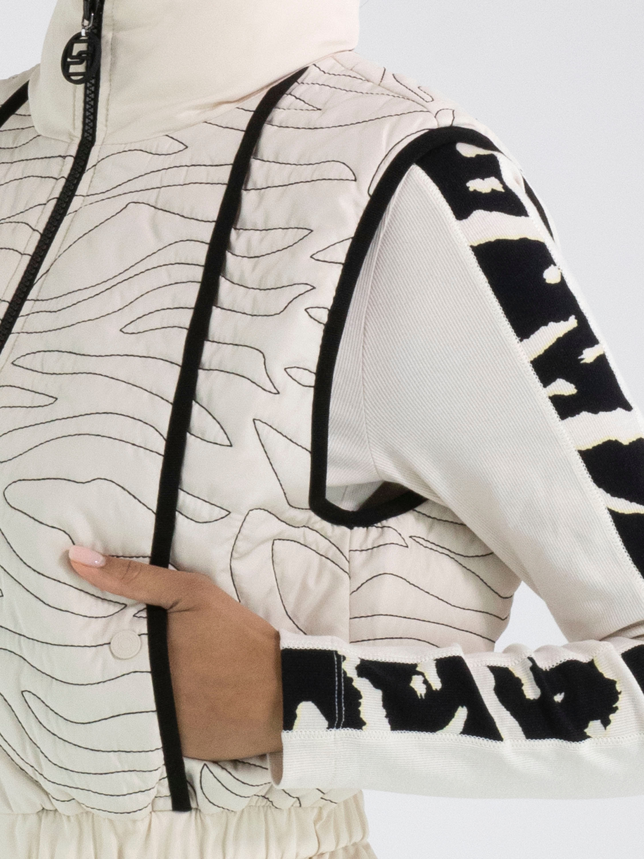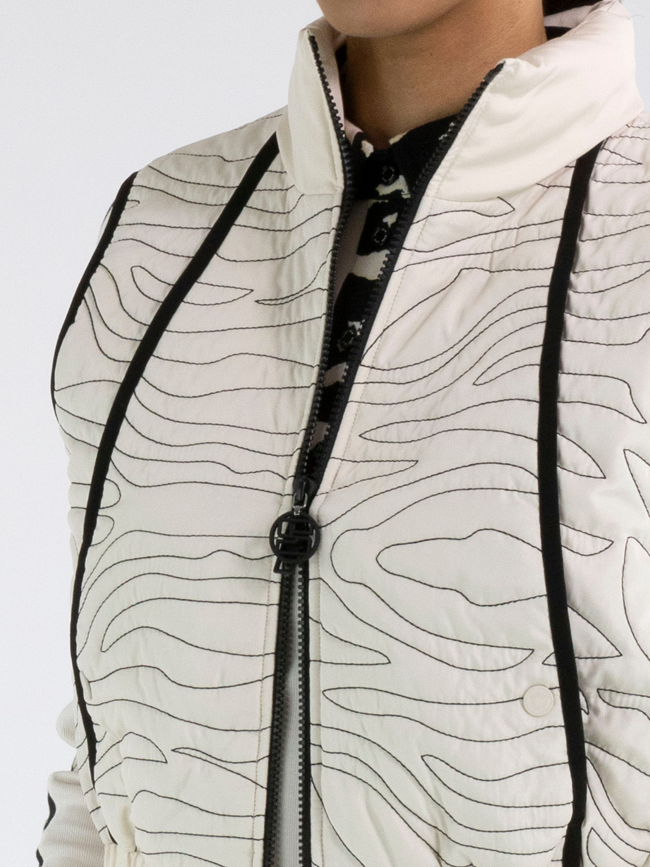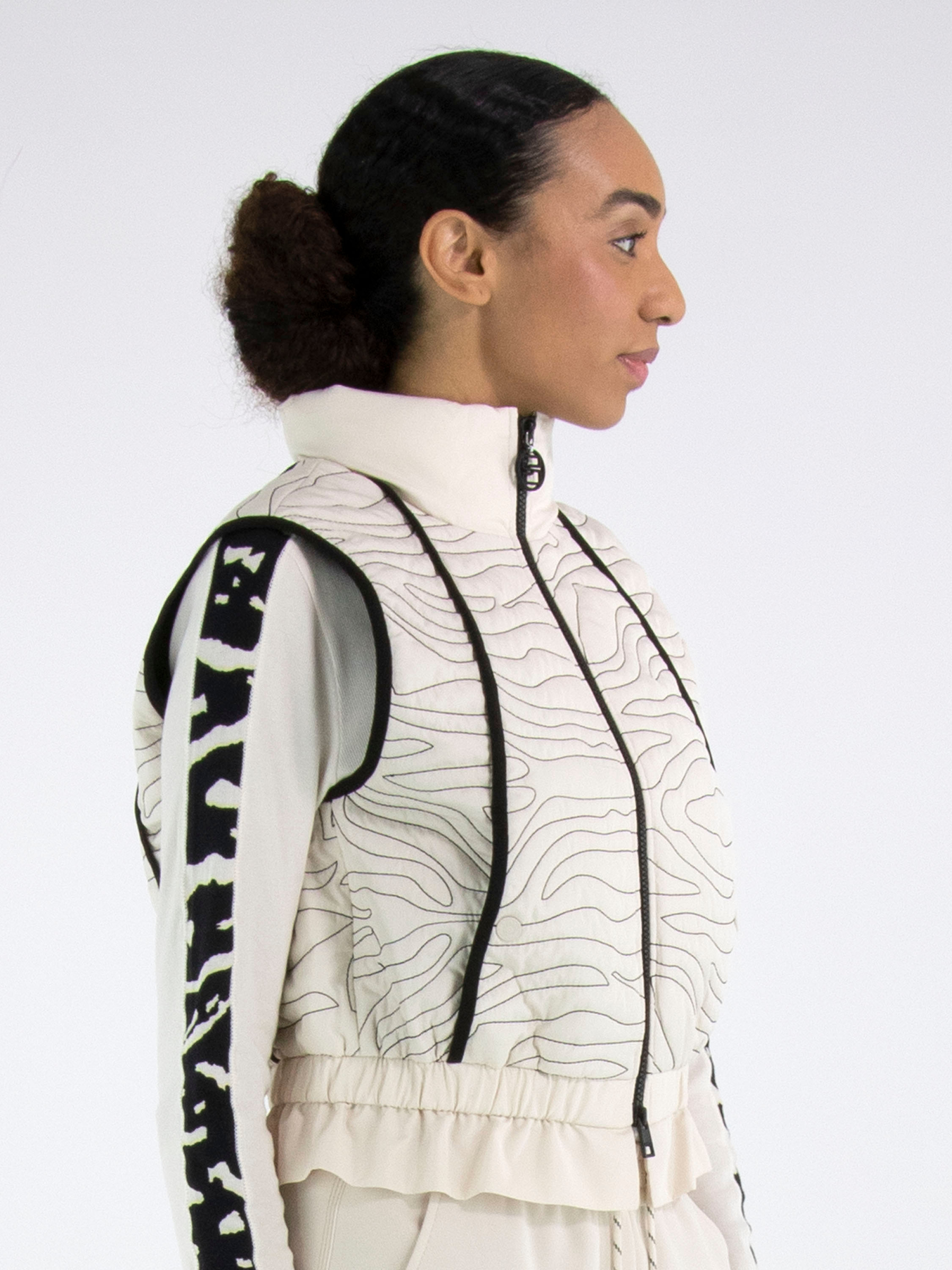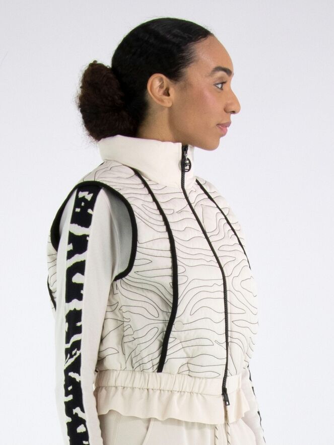 Un bodywarmer de Marc Cain en beige avec des coutures décoratives ondulées. À l’avant et à l’arrière se trouvent des bandes verticales noires. Le col et le bas sont en satin mat, avec un plissé fin le long de la couture inférieure. Au-dessus de cette couture se trouve une bande plissée élastique. Ce bodywarmer peut être lavé à 30 degrés.