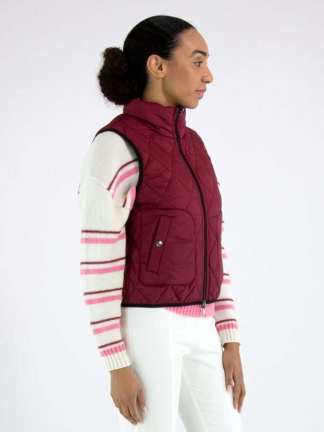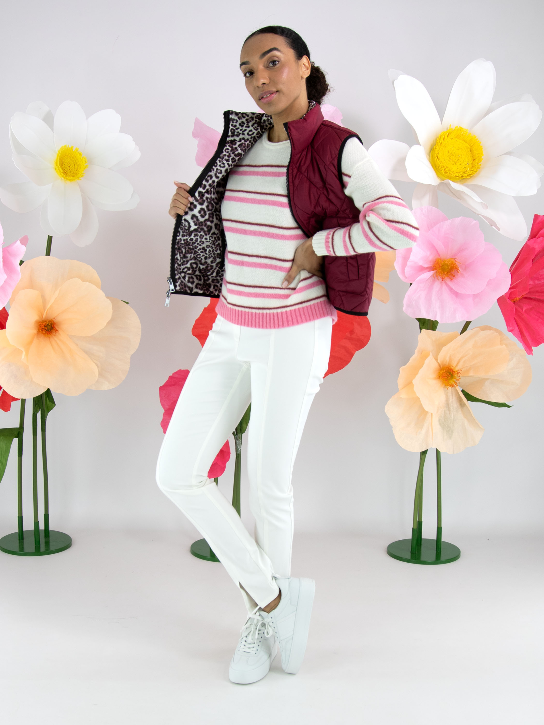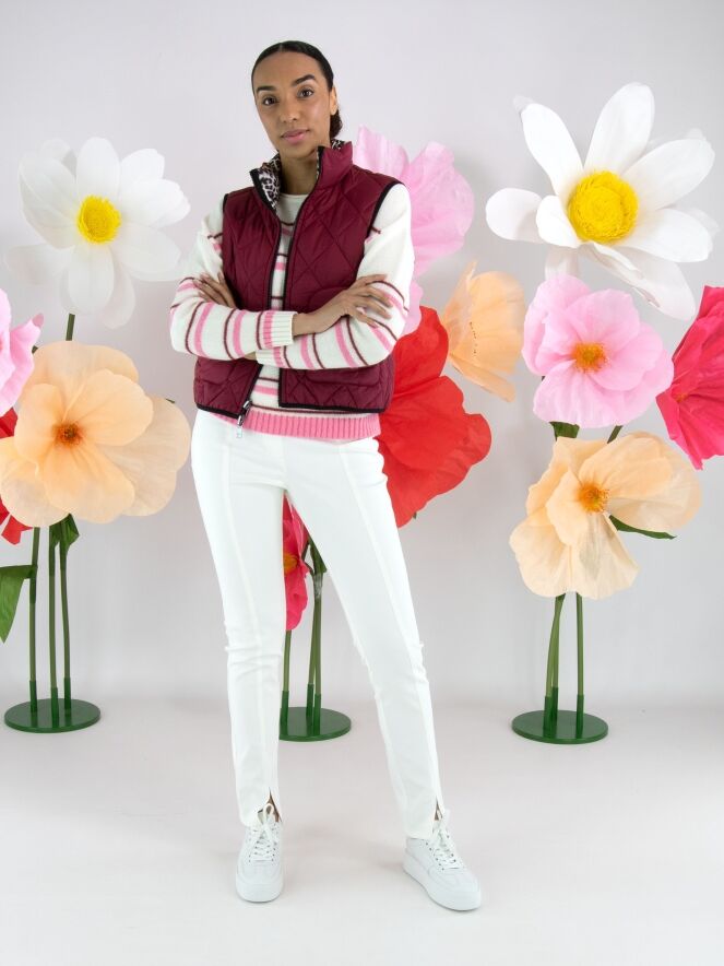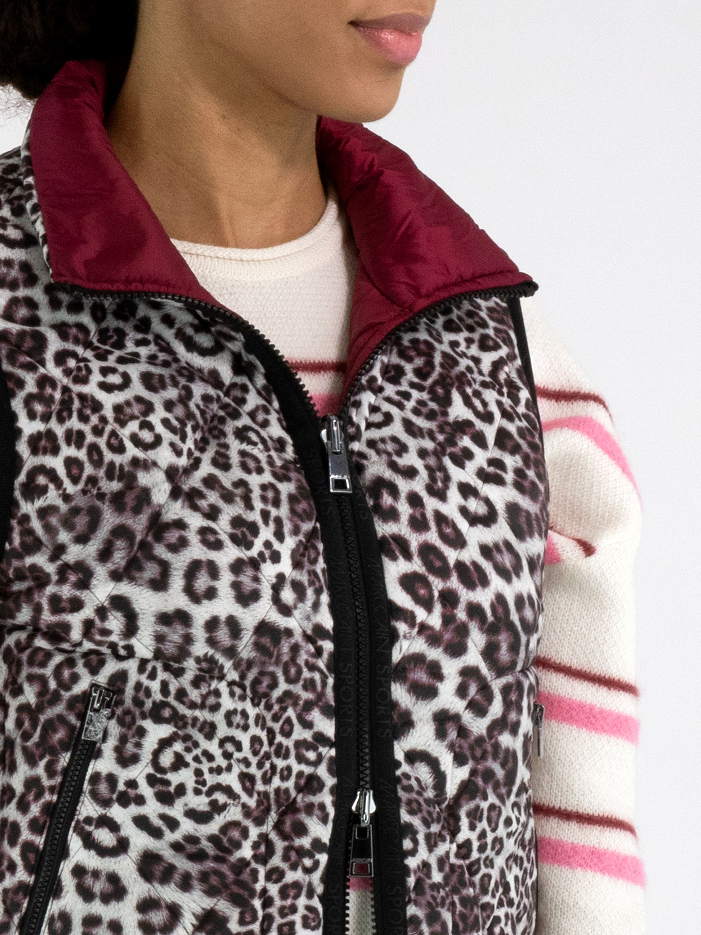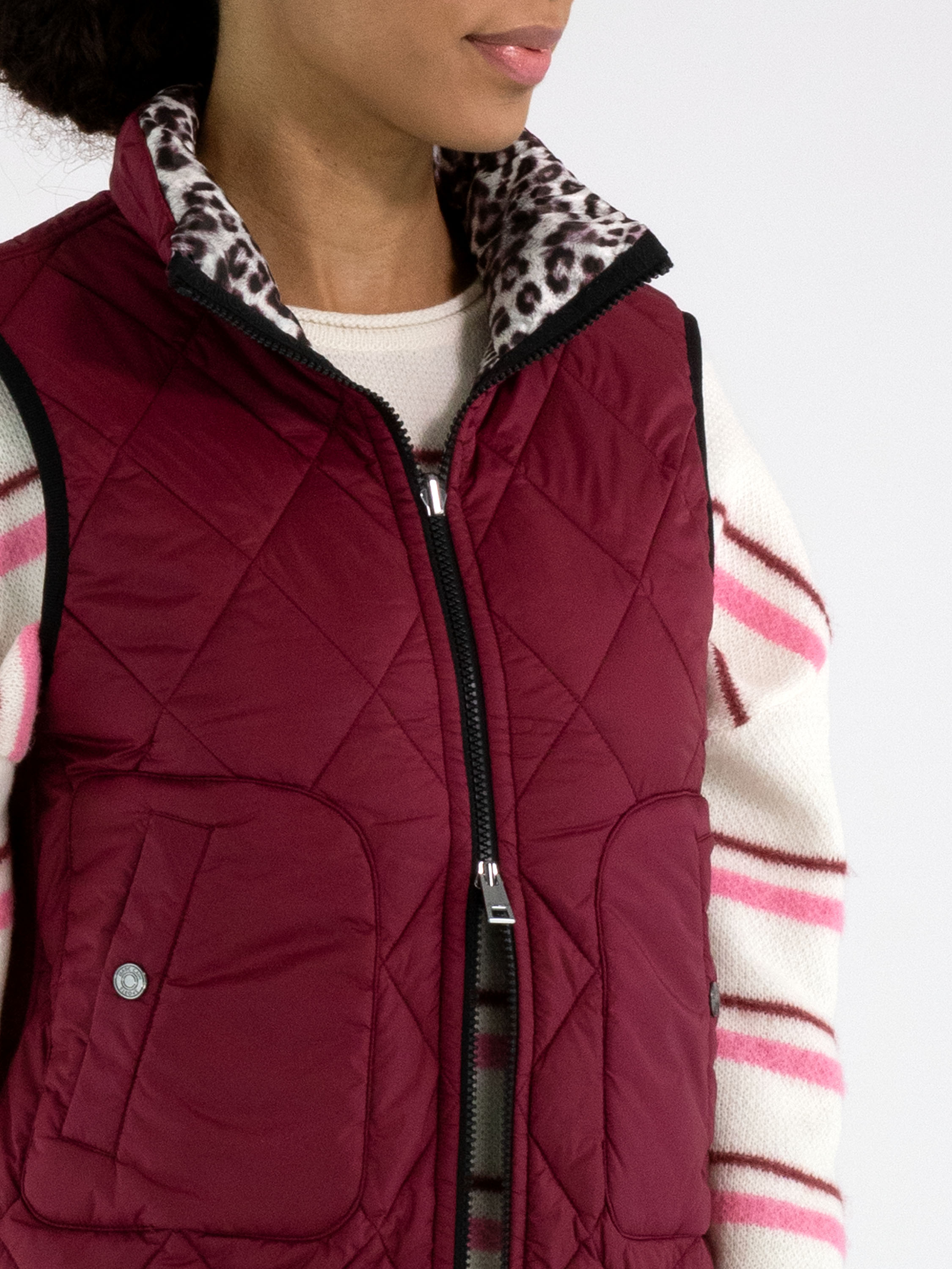 Un gilet matelassé réversible avec, d’un côté, une couleur bordeaux unie et, de l’autre, un imprimé léopard dans plusieurs nuances de gris, bordeaux et blanc cassé. De chaque côté de la fermeture éclair se trouve un liseré noir. Les bords des emmanchures et du bas sont également soulignés d’un liseré noir. Les poches à hauteur de taille sont dotées d’une fermeture zippée. Ce gilet peut être lavé à 30 degrés.