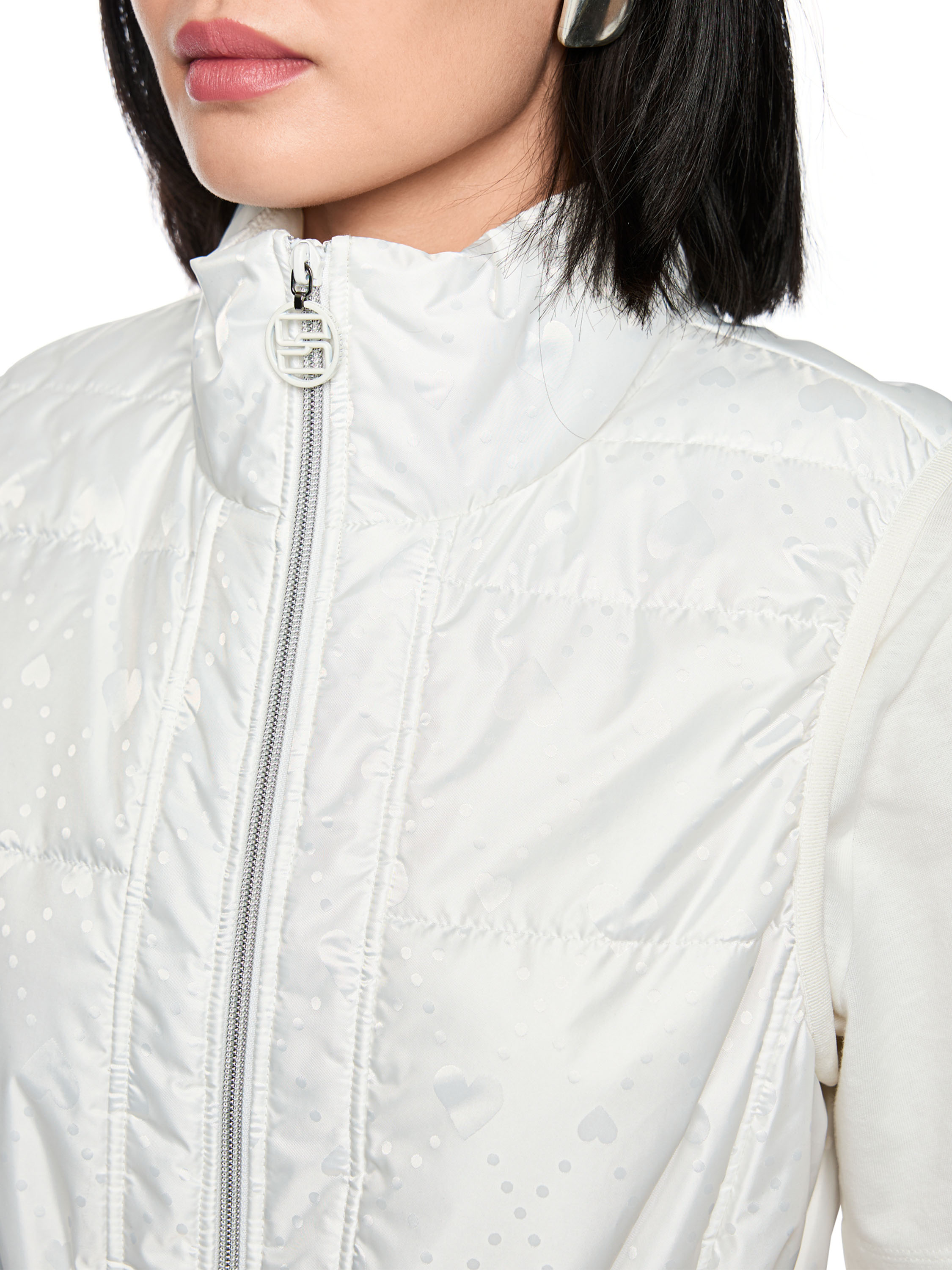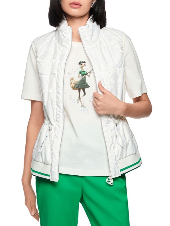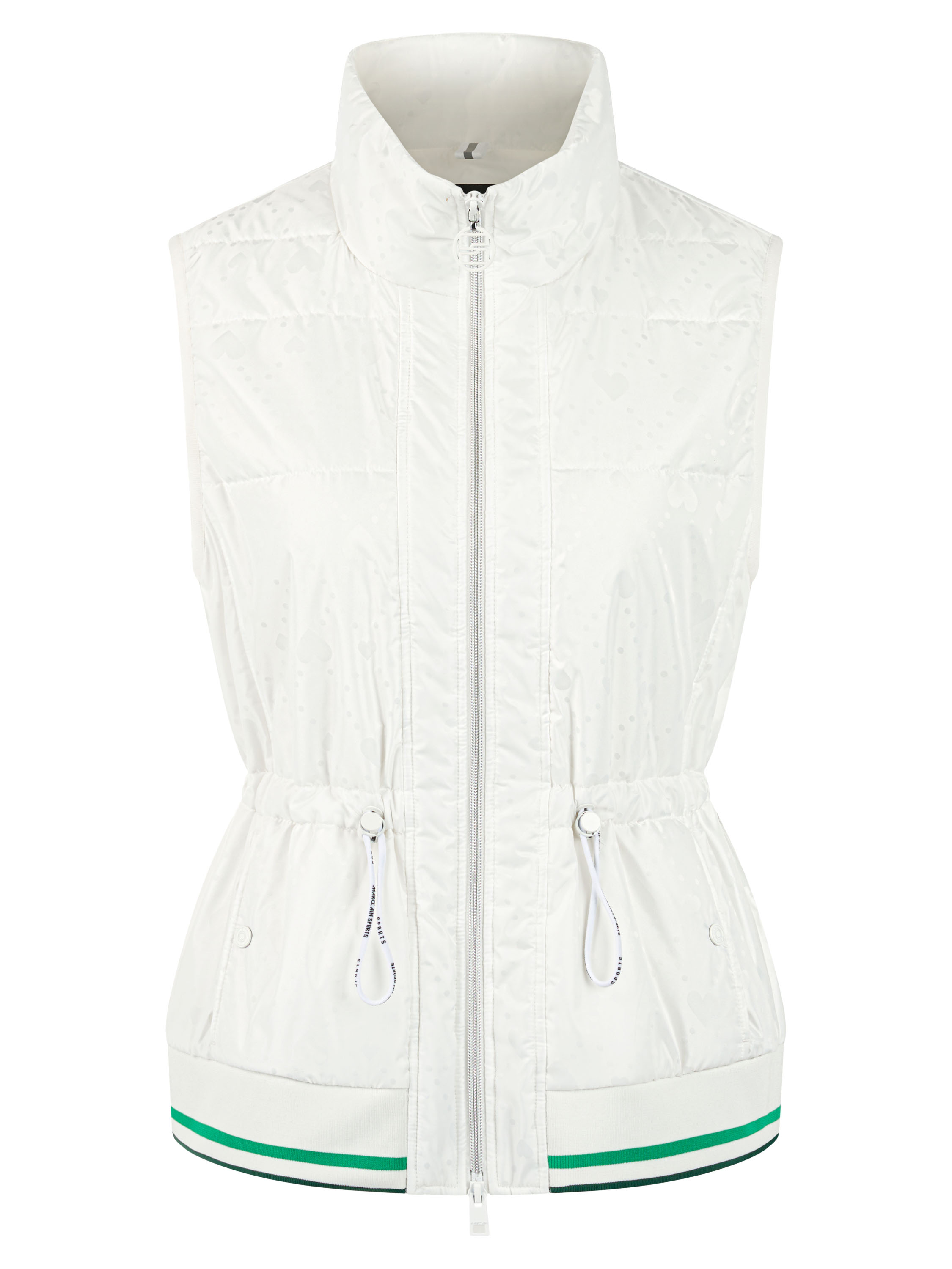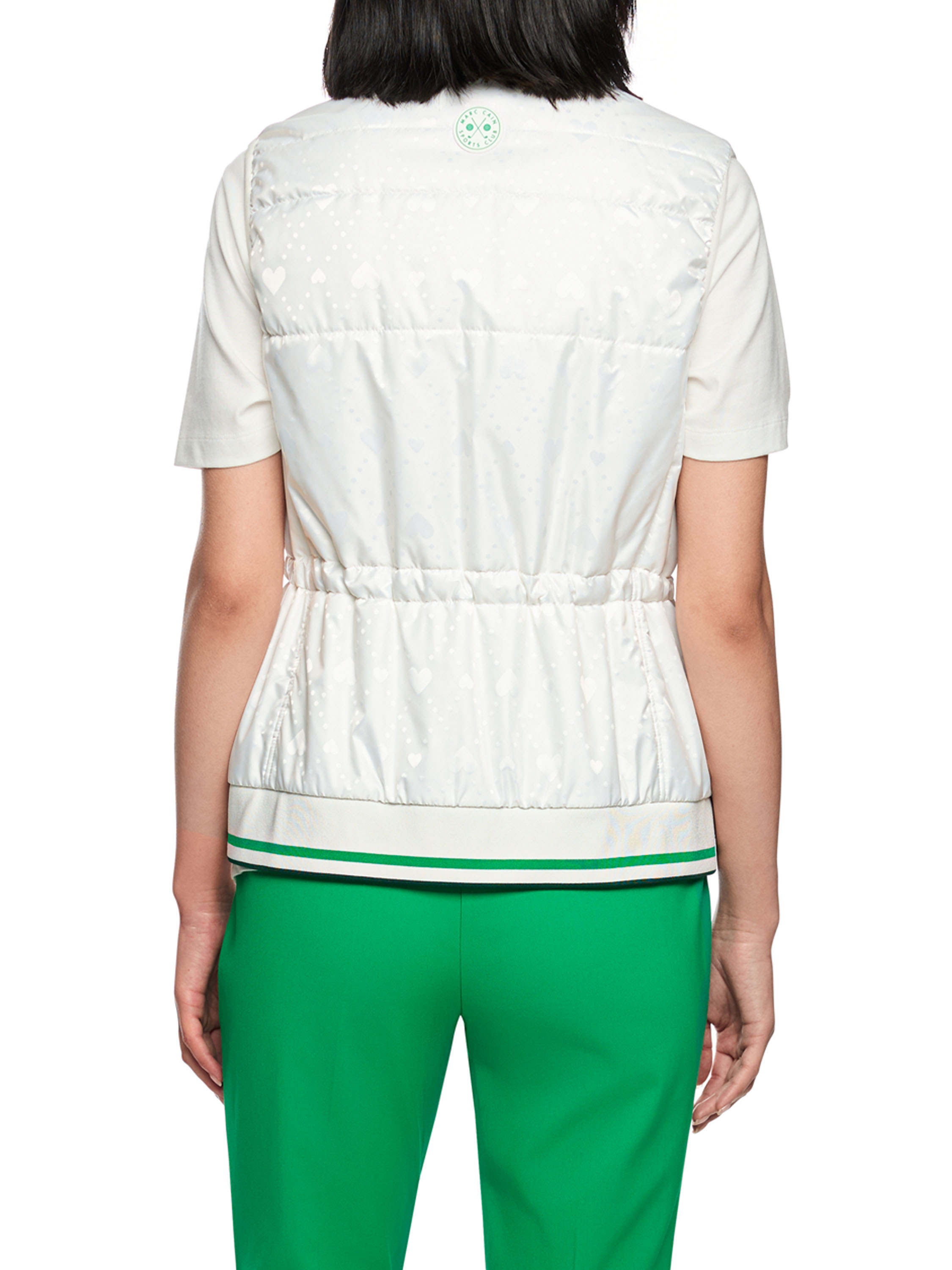 Un gilet sans manches de Marc Cain en blanc crème. Des motifs de cœurs ton sur ton sont découpés au laser dans le tissu. À la taille, un cordon inséré dans un tunnel permet de créer un effet plissé. Les poches latérales sont fermées par des boutons-pression. Le bas est fini par une bordure en tricot finement côtelé à motif rayé dans les tons vert vif, blanc et vert foncé. Le gilet est doté d’une fermeture éclair et peut être lavé à 30 degrés.