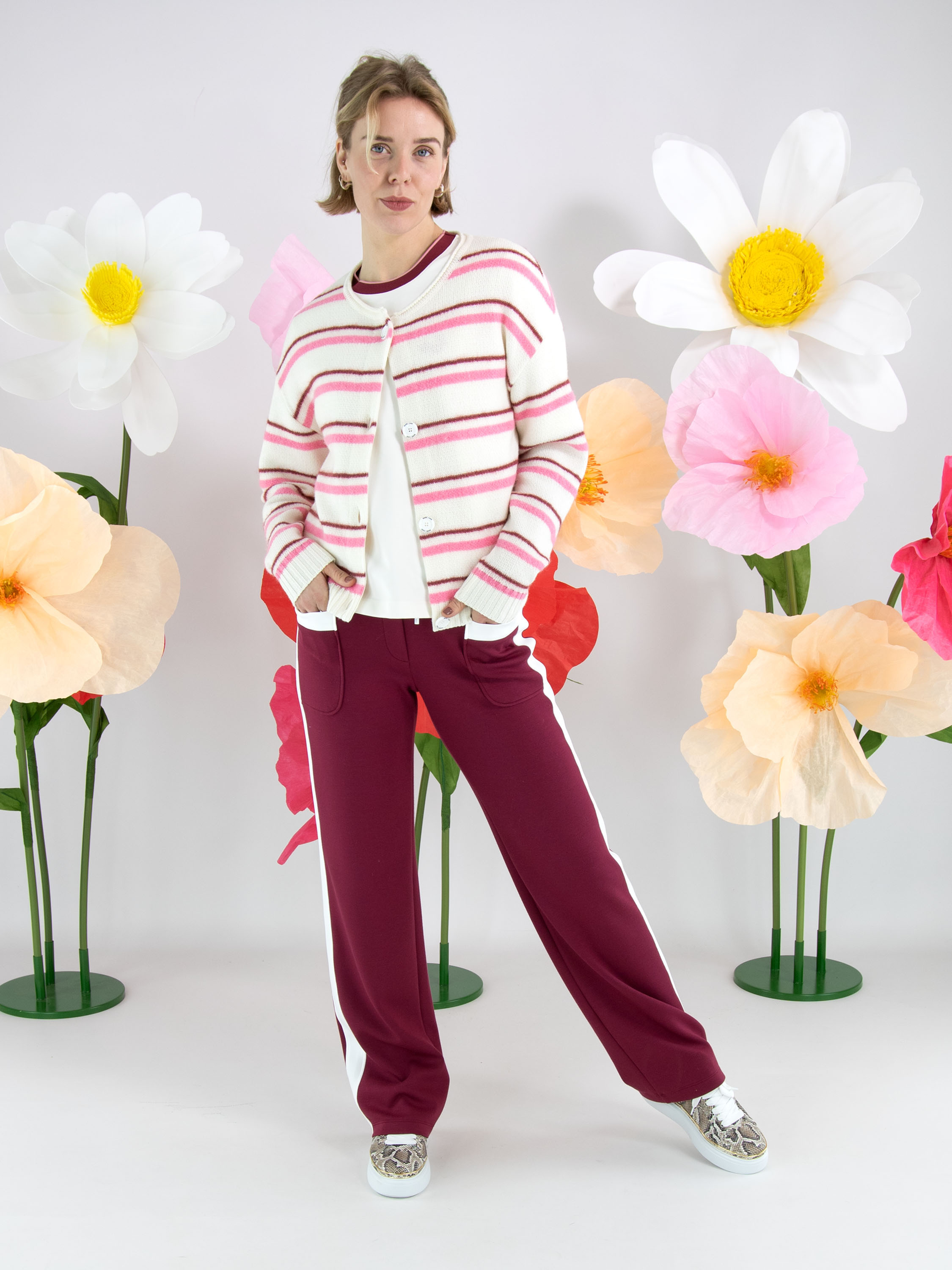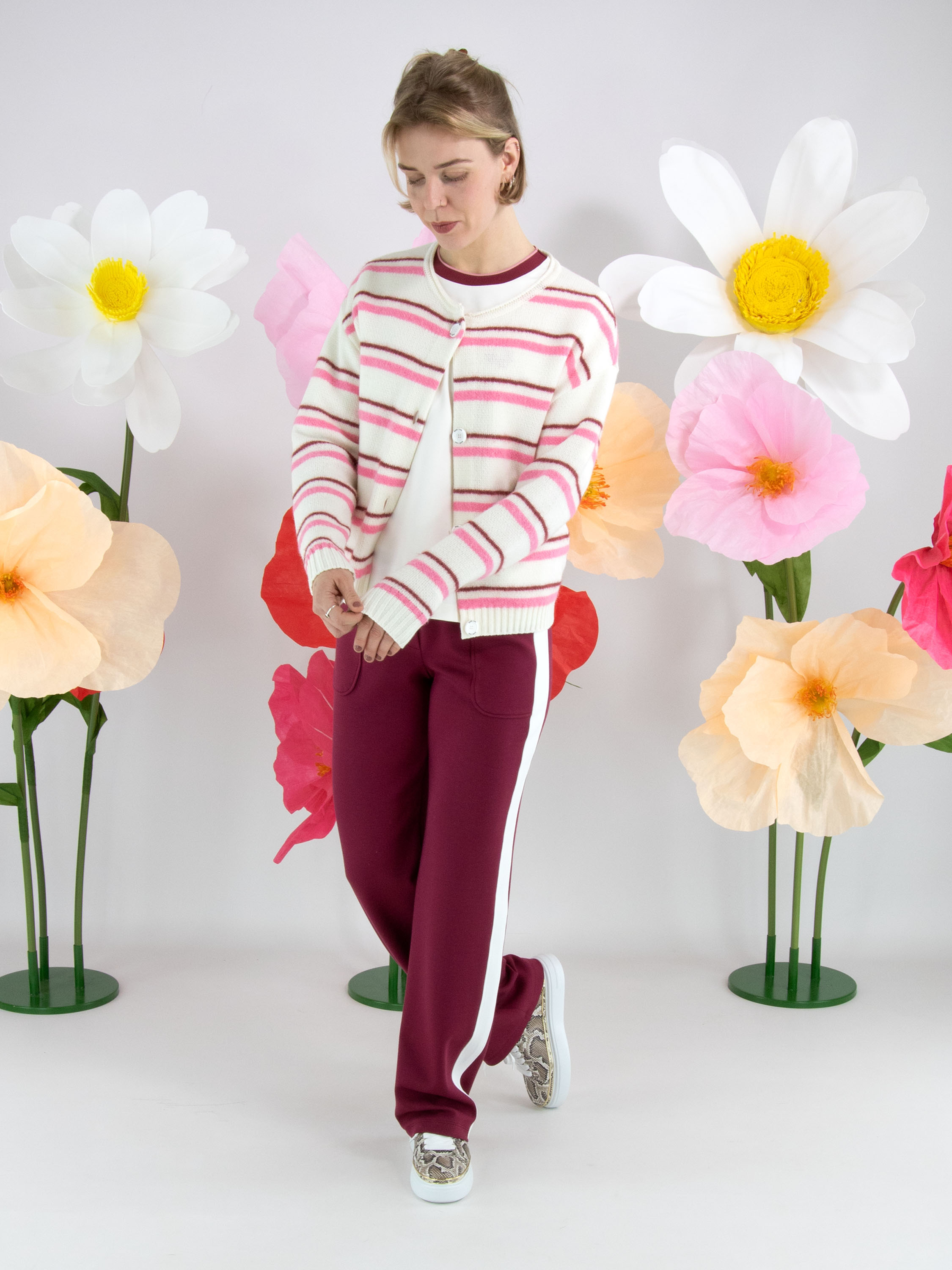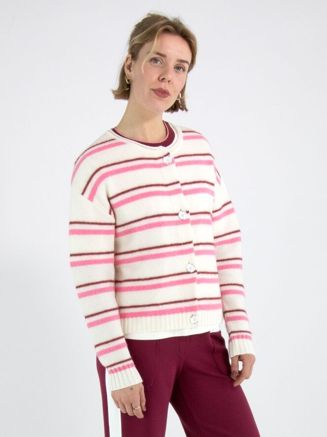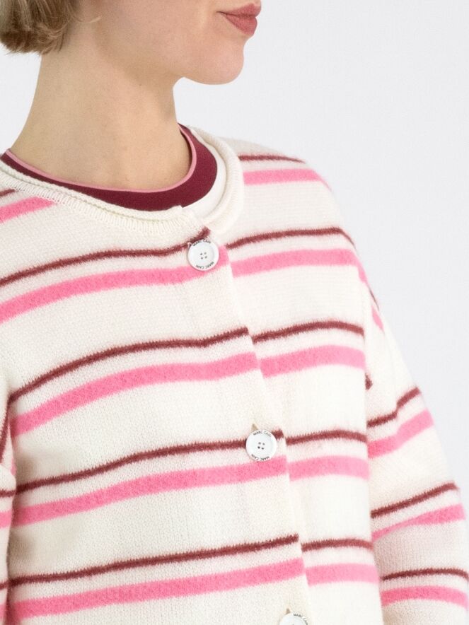 Un gilet de Marc Cain à motif rayé horizontal en rose saumon et bordeaux sur fond blanc cassé. Le gilet possède un col rond et se ferme par quatre boutons blancs. Le bas est fini par une bordure côtelée en blanc cassé. Les poignets des manches longues sont côtelés en blanc cassé. Ce gilet peut être lavé à la main.