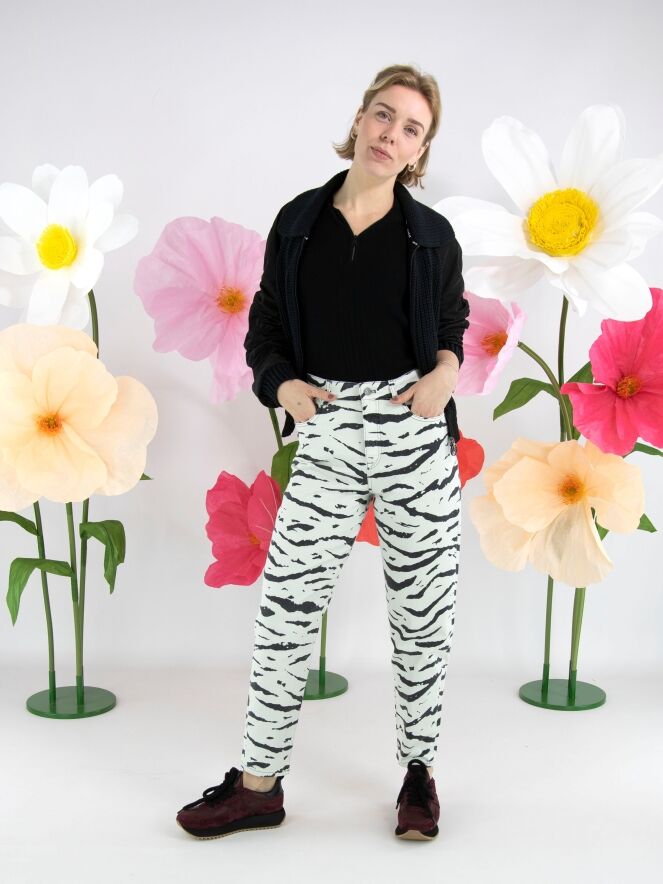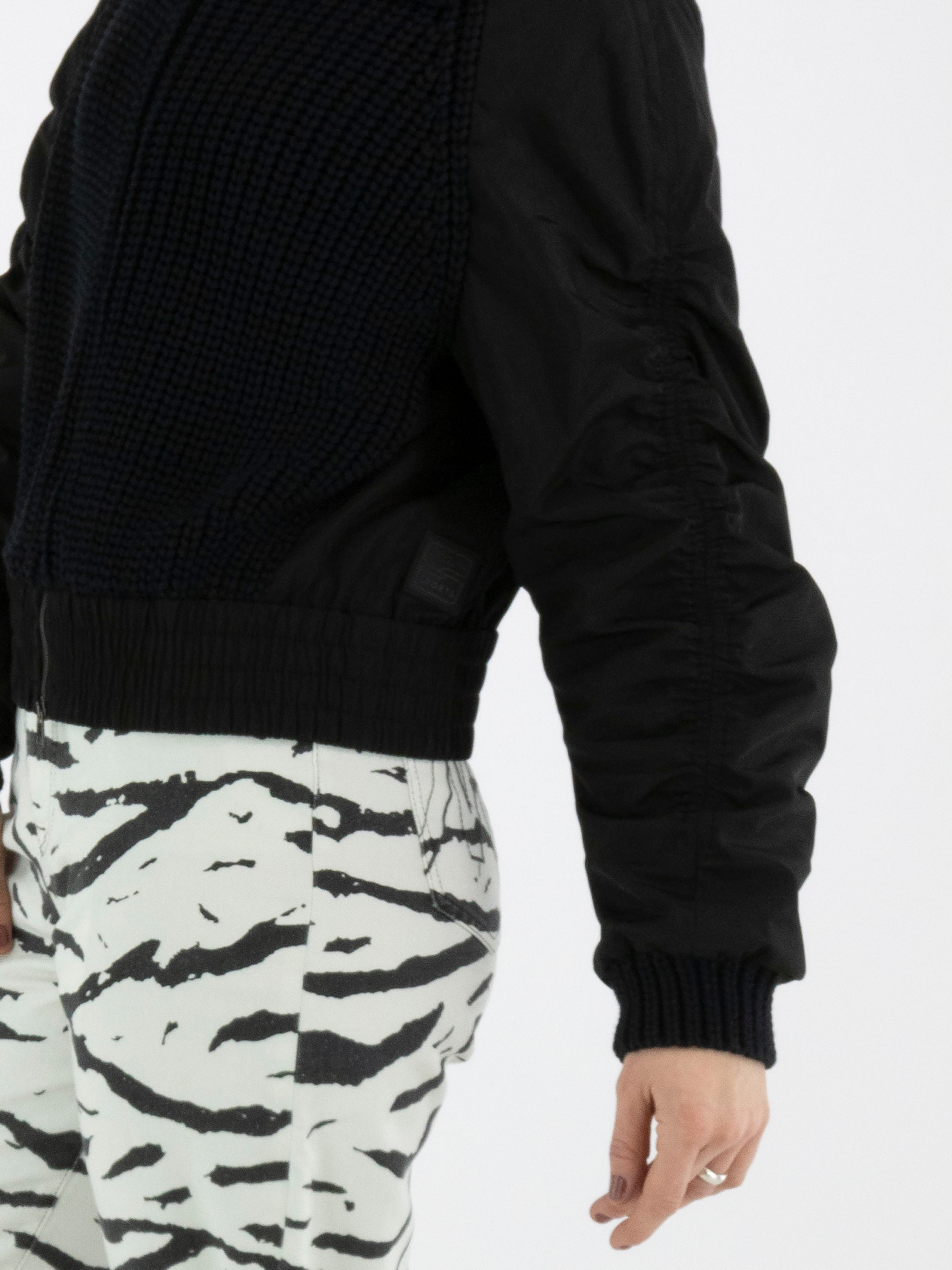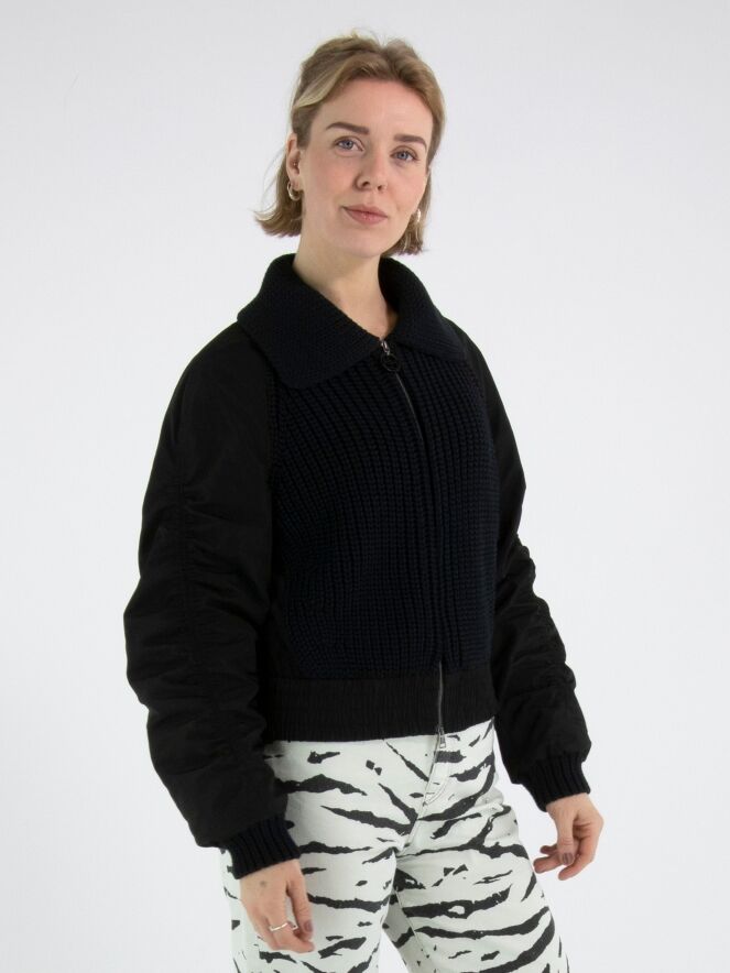Un cardigan de Marc Cain en noir. L’avant du cardigan, les poignets et le col sont tricotés en point patent, tandis que le dos et les manches sont en tissu parachute. La couture sur le dessus des manches longues est finement plissée des deux côtés. Au bas se trouve une large bande finement plissée. Le cardigan possède une fermeture zippée et peut être lavé à 30 degrés.