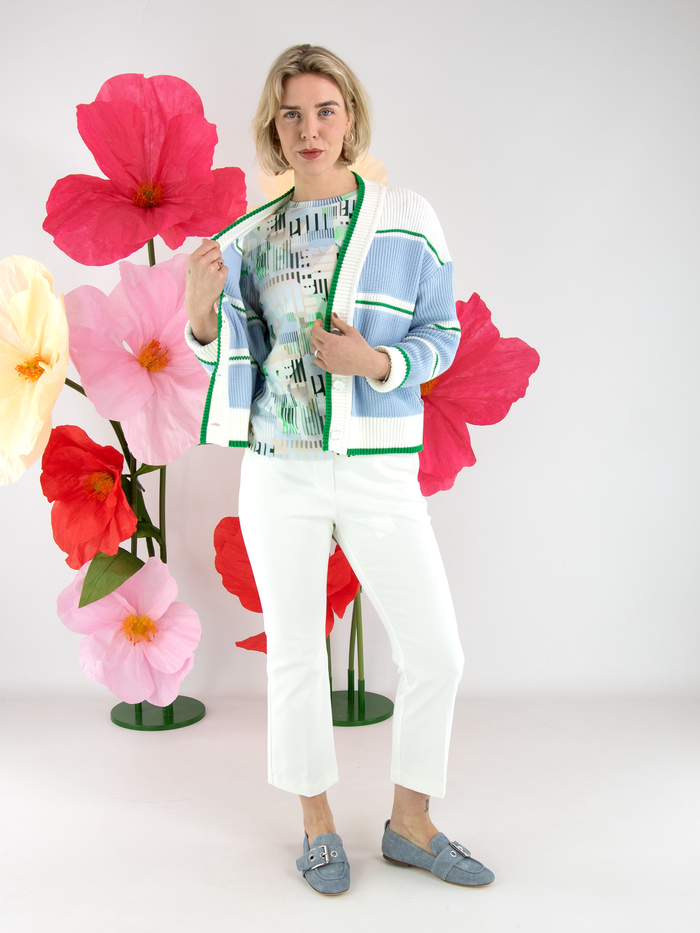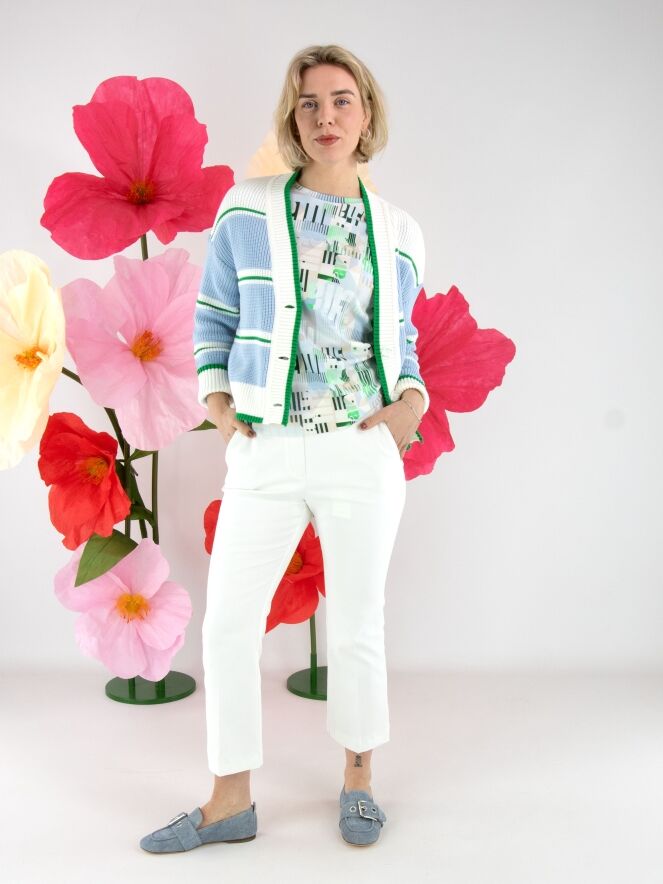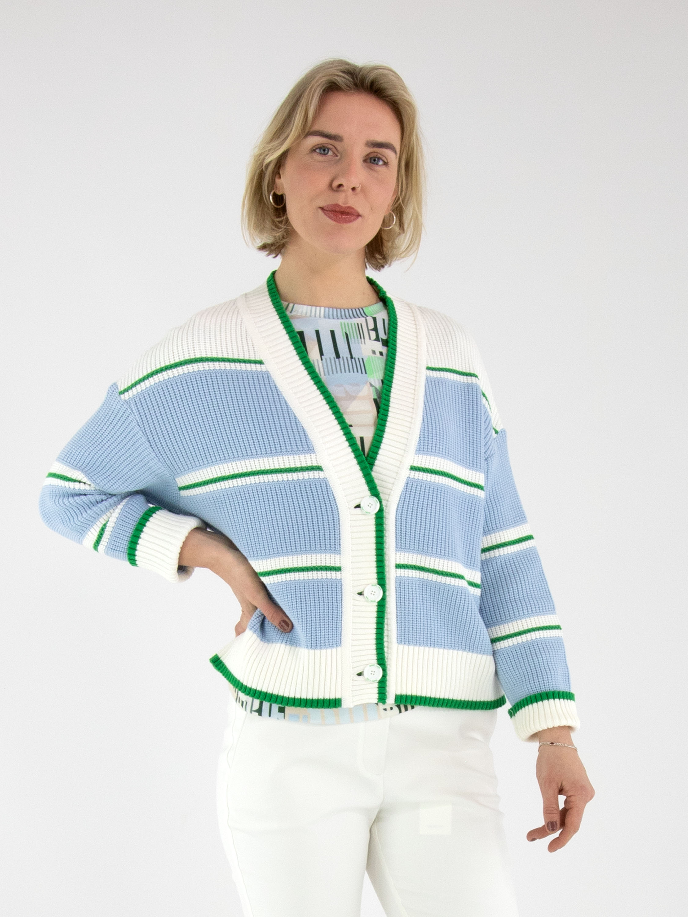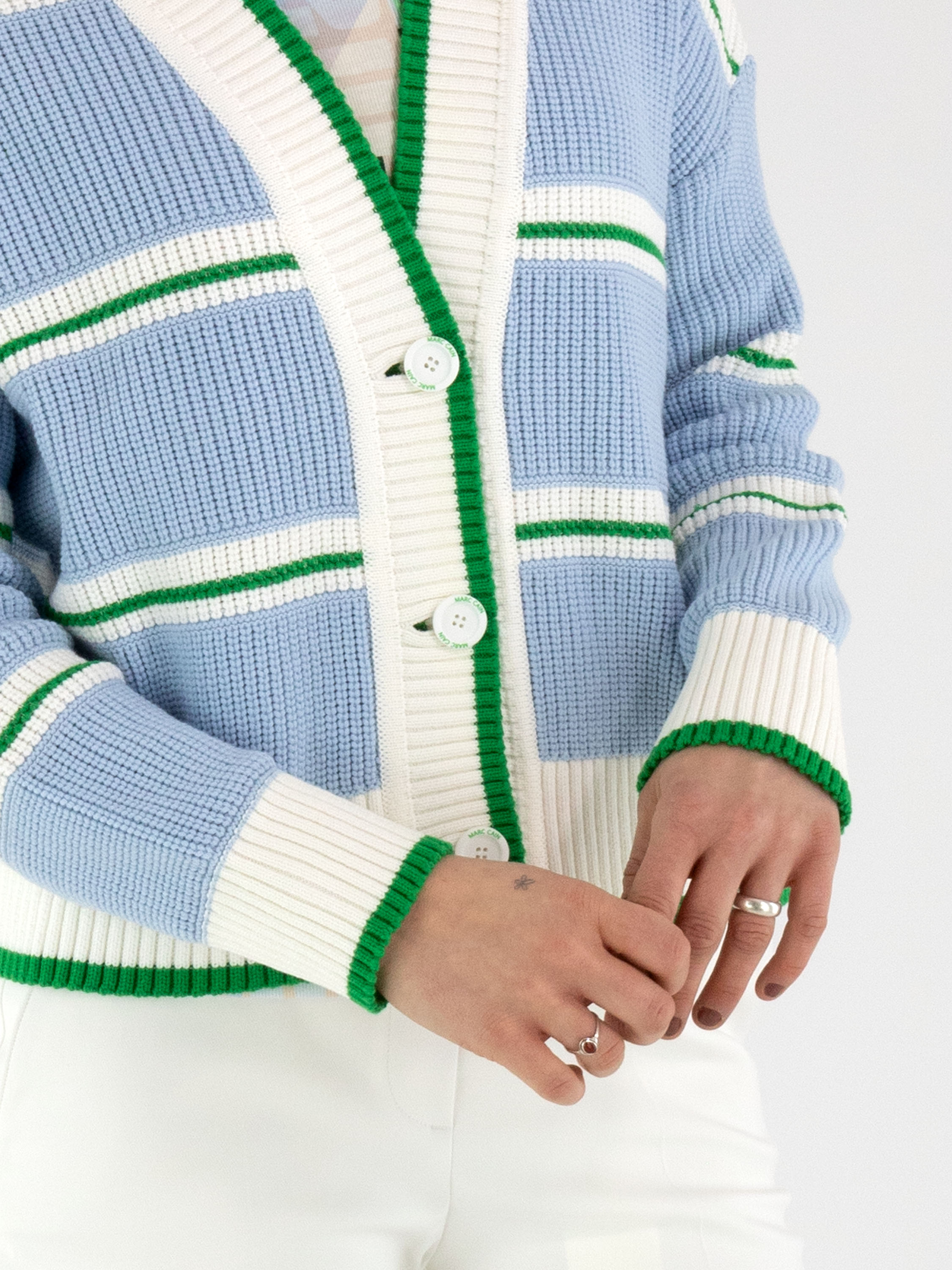 Un gilet en maille de Marc Cain avec des panneaux bleu clair, séparés par des bordures rayées dans les tons vert et blanc crème. Depuis le col, une large bordure en tricot côtelé blanc avec un liseré vert longe la patte de boutonnage jusqu’à l’ourlet. Les extrémités des manches longues et le bas du modèle sont également finis par une bordure en tricot côtelé avec liseré vert. Ce gilet peut être lavé à 30 degrés.