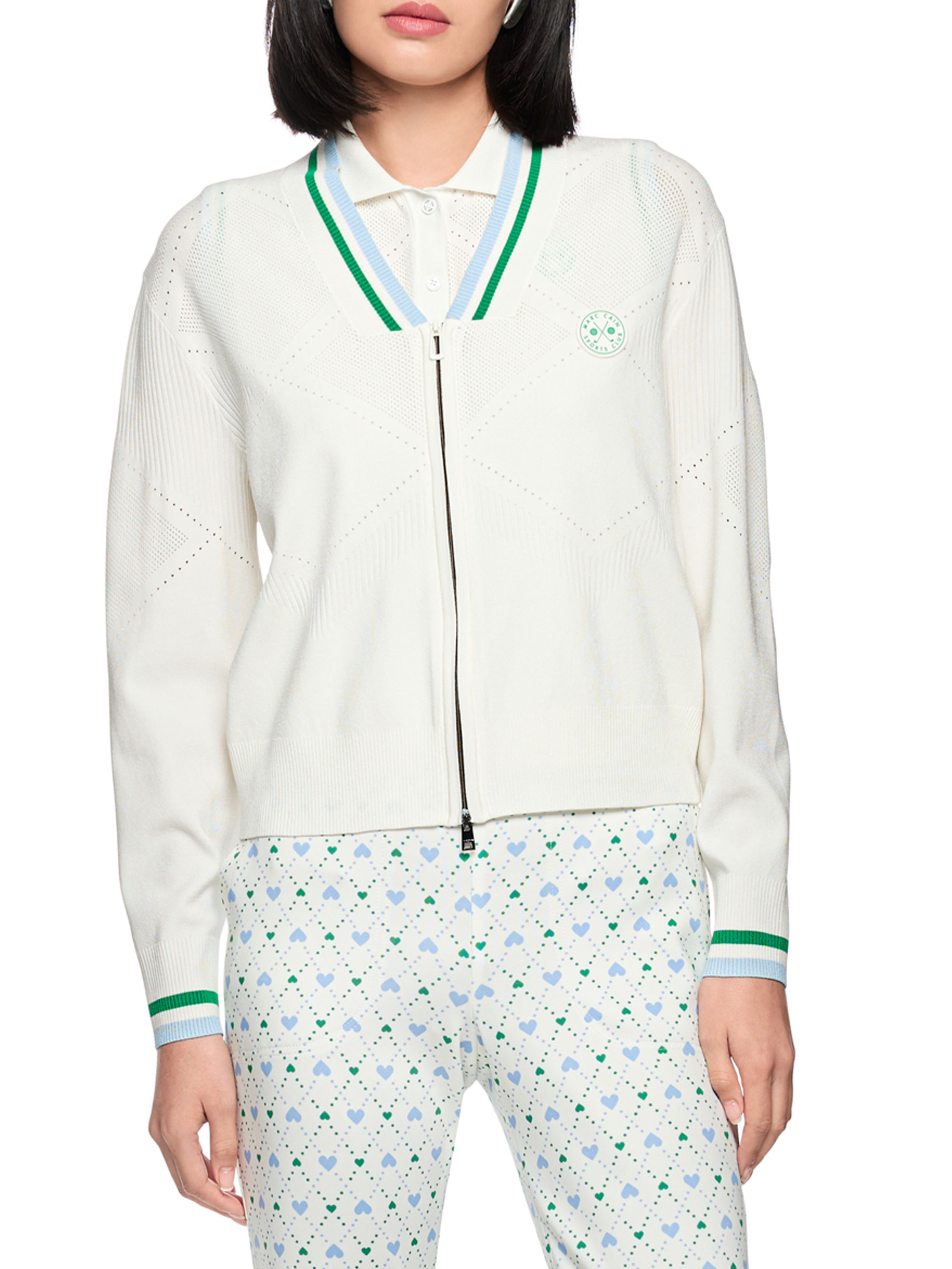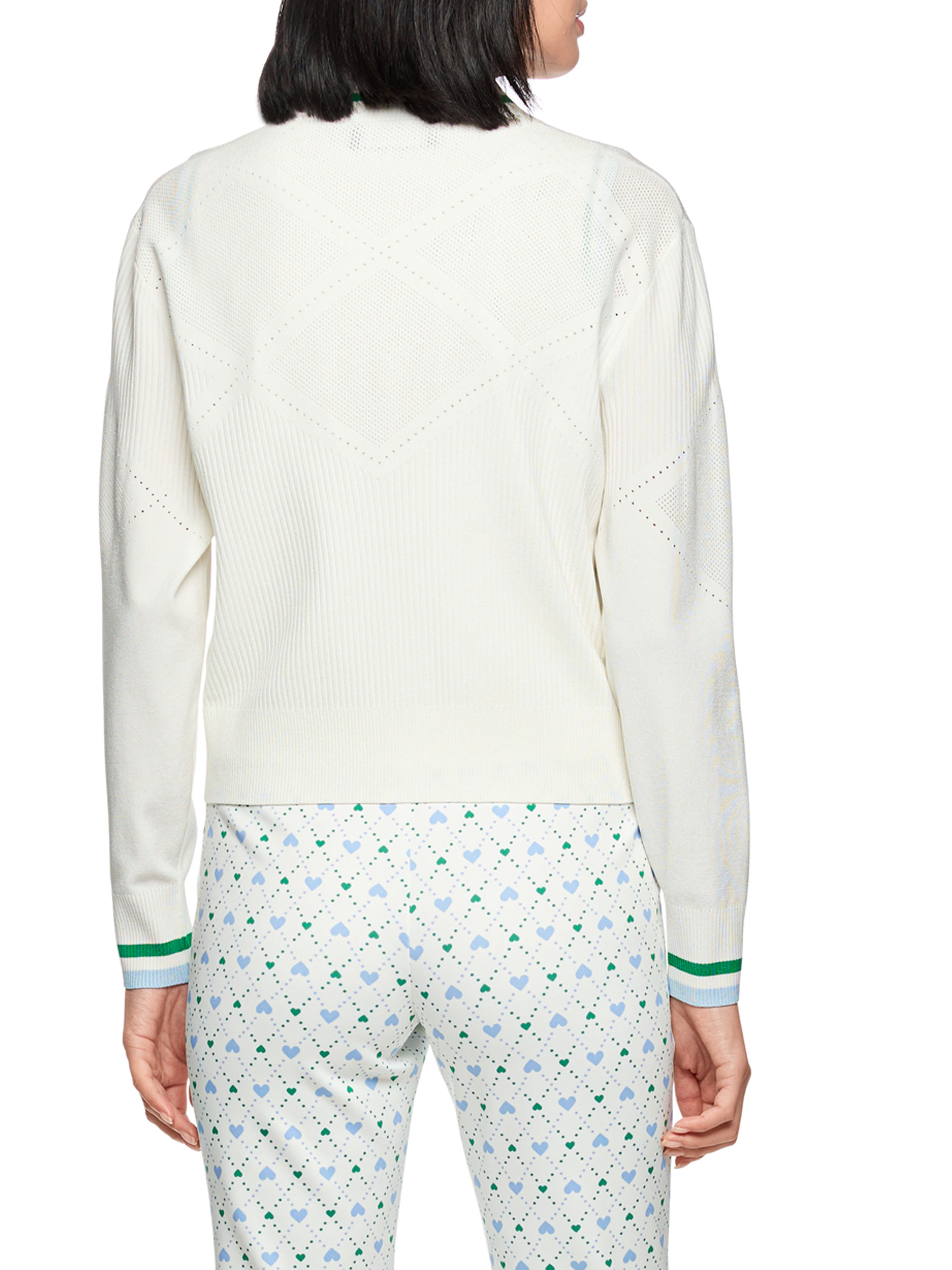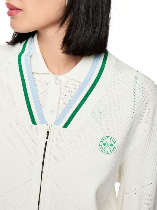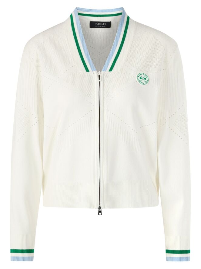 Un gilet de Marc Cain en blanc crème. Le bord du décolleté en V et les extrémités des manches longues sont finis par une bordure en tricot finement côtelé à motif rayé dans les tons vert, bleu et blanc. Le tissu présente un motif ajouré à carreaux avec des parties finement perforées. Le gilet est doté d’une fermeture éclair argentée et peut être lavé à la main.
