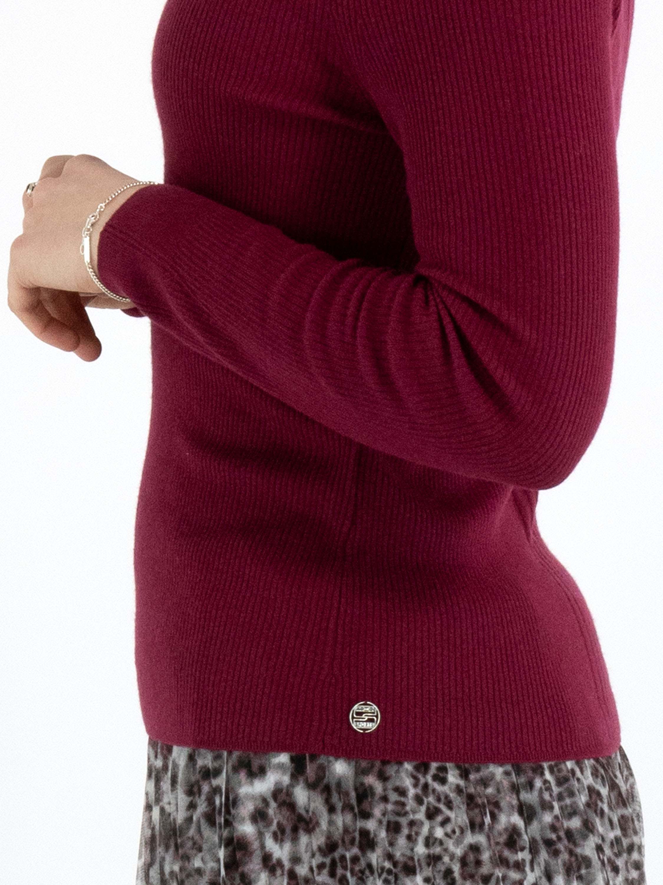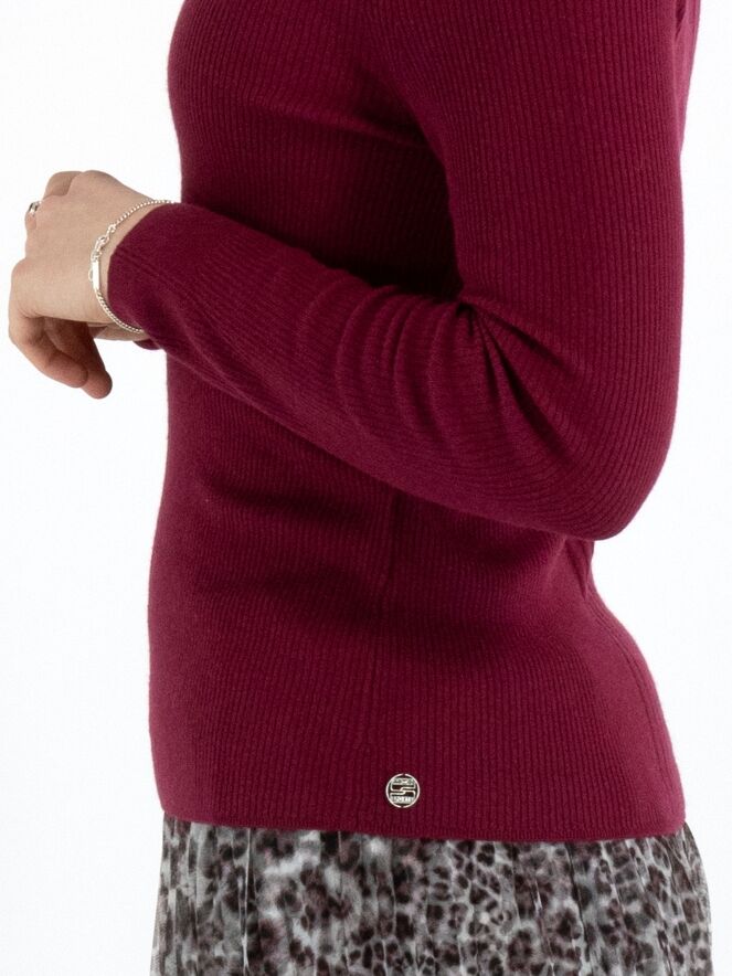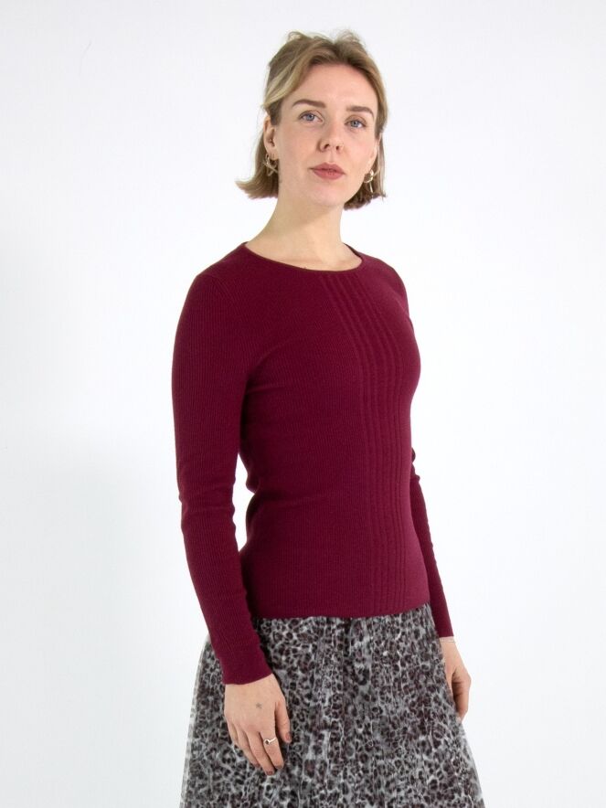 Un pull de Marc Cain en bordeaux. Le tissu est finement côtelé, avec à l’avant une large bande où les côtes sont plus marquées. Le pull possède un col rond et des manches longues. Ce pull peut être lavé à la main.