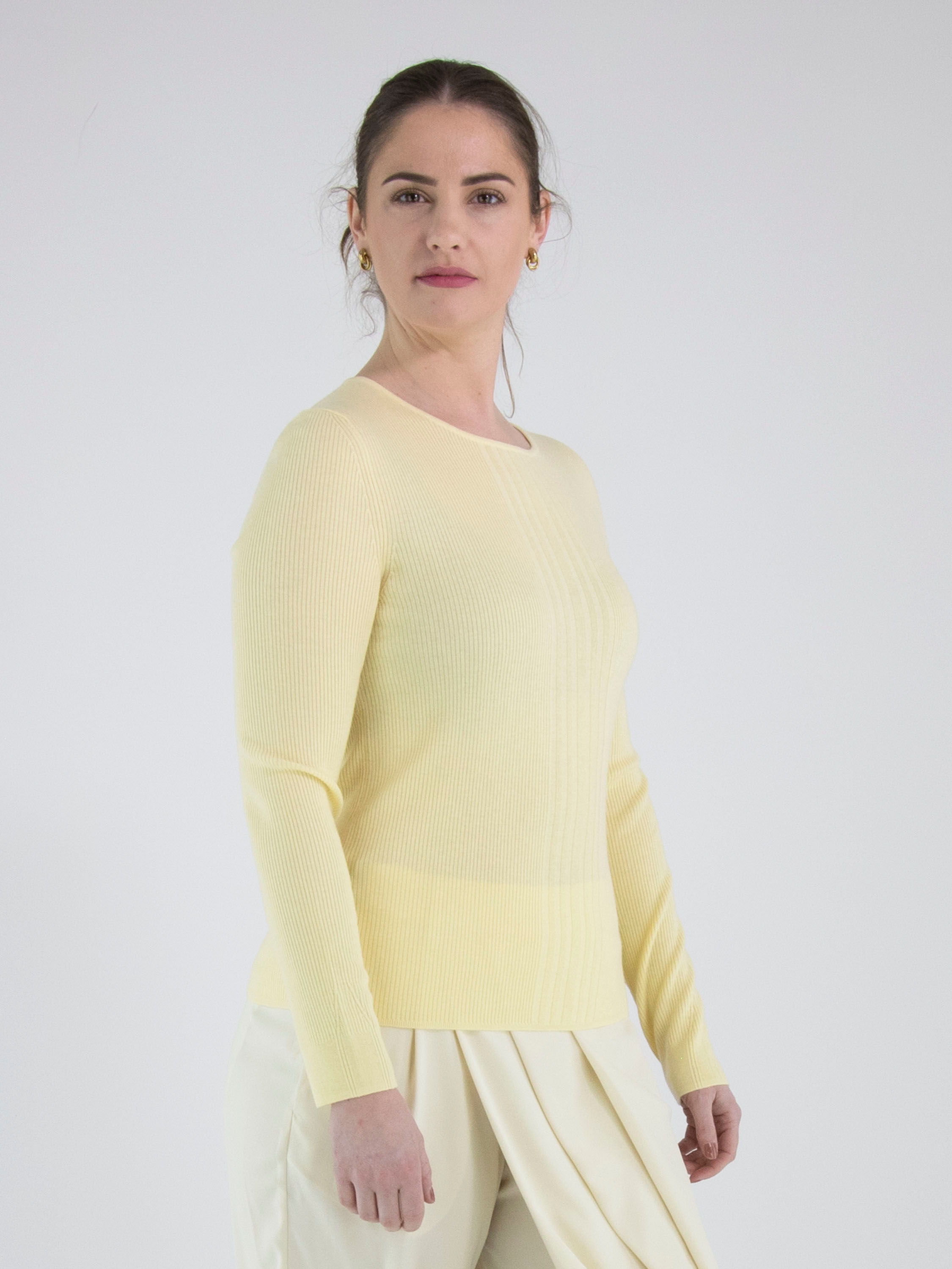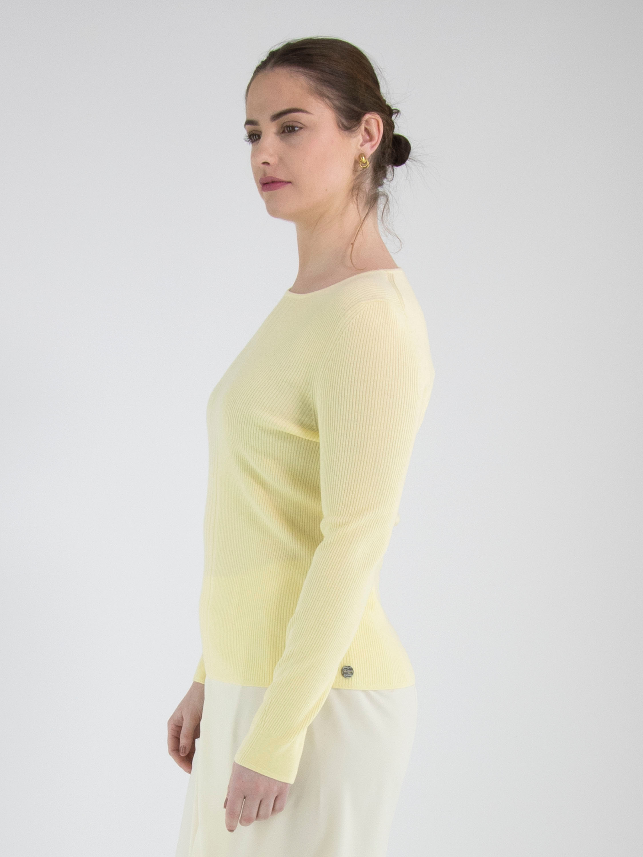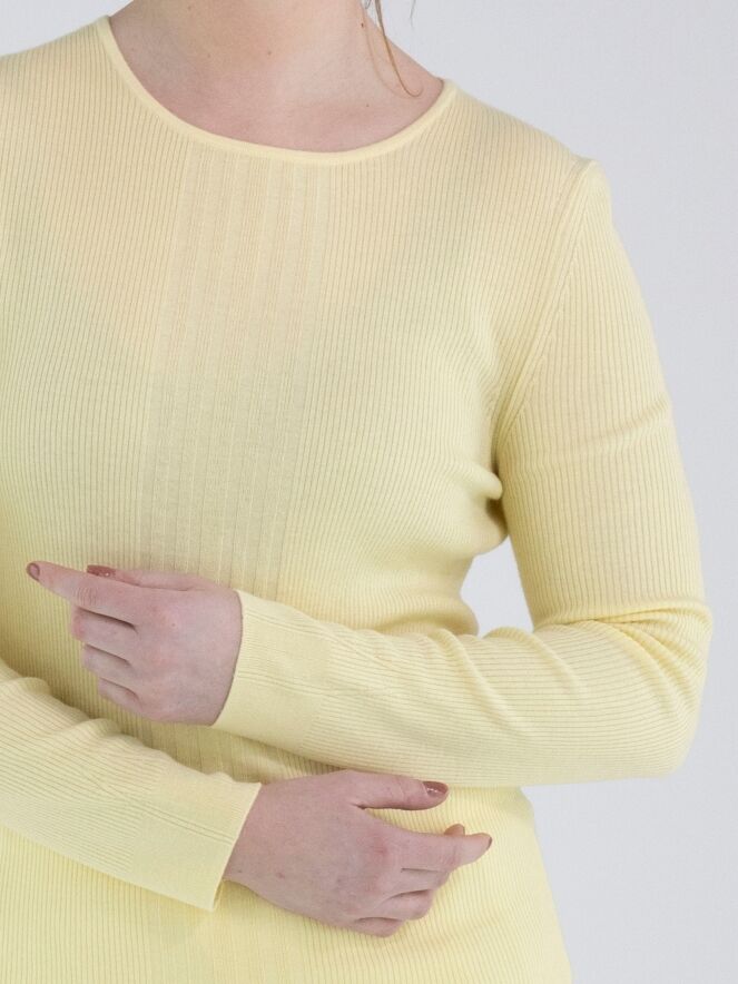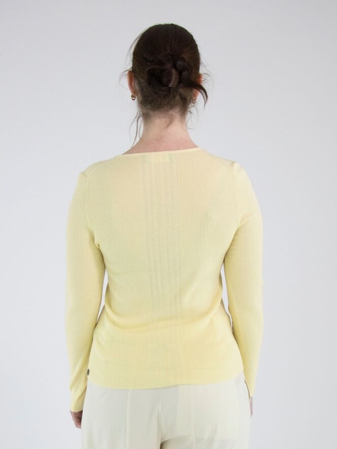Un pull de Marc Cain en jaune. Le tissu est finement côtelé avec, au centre du devant, une large bande où les côtes sont plus larges. Le pull possède un col rond et des manches longues. Ce pull peut être lavé à la main.