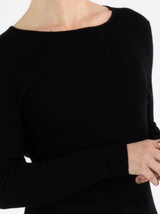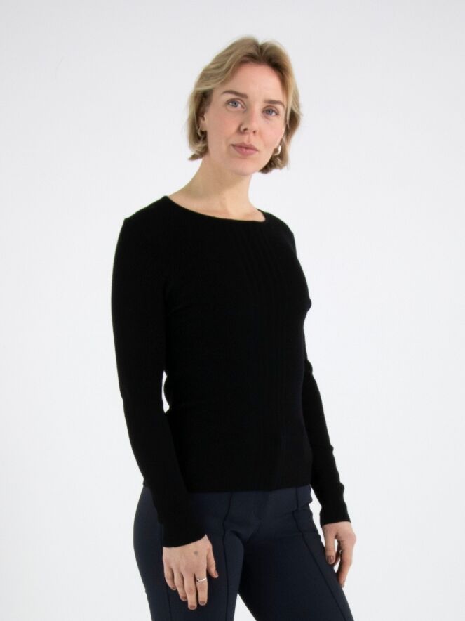 Un pull de Marc Cain en noir. Le tissu est finement côtelé, avec au centre du devant une large bande où les côtes sont plus larges. Le pull possède une encolure ronde et des manches longues. Ce pull peut être lavé à la main.