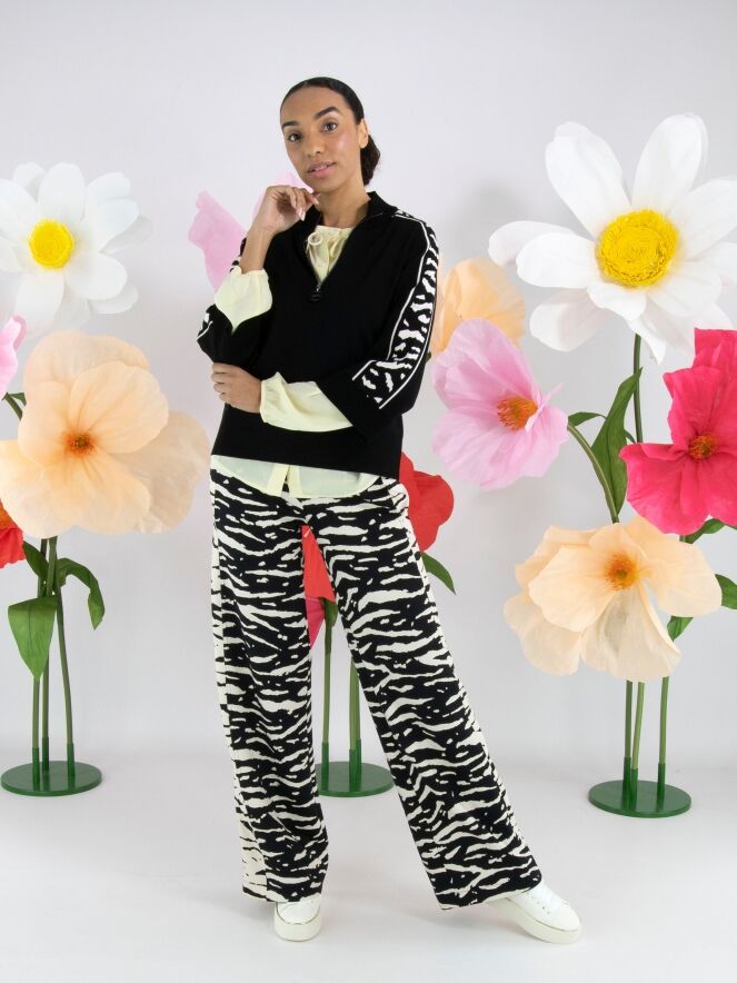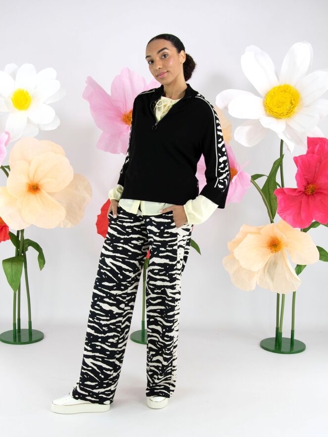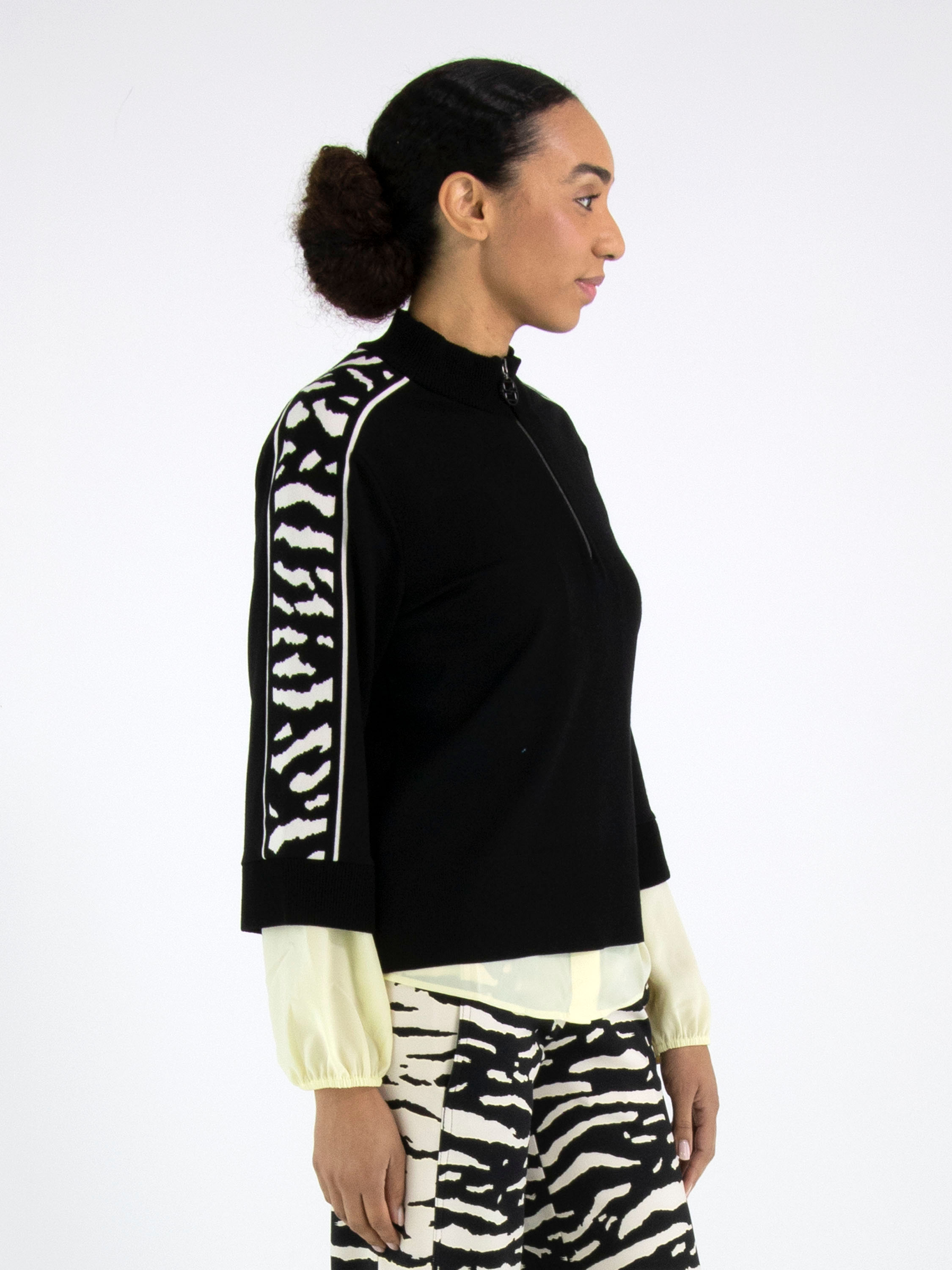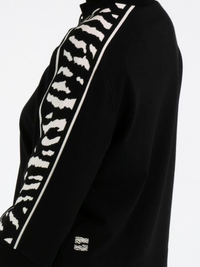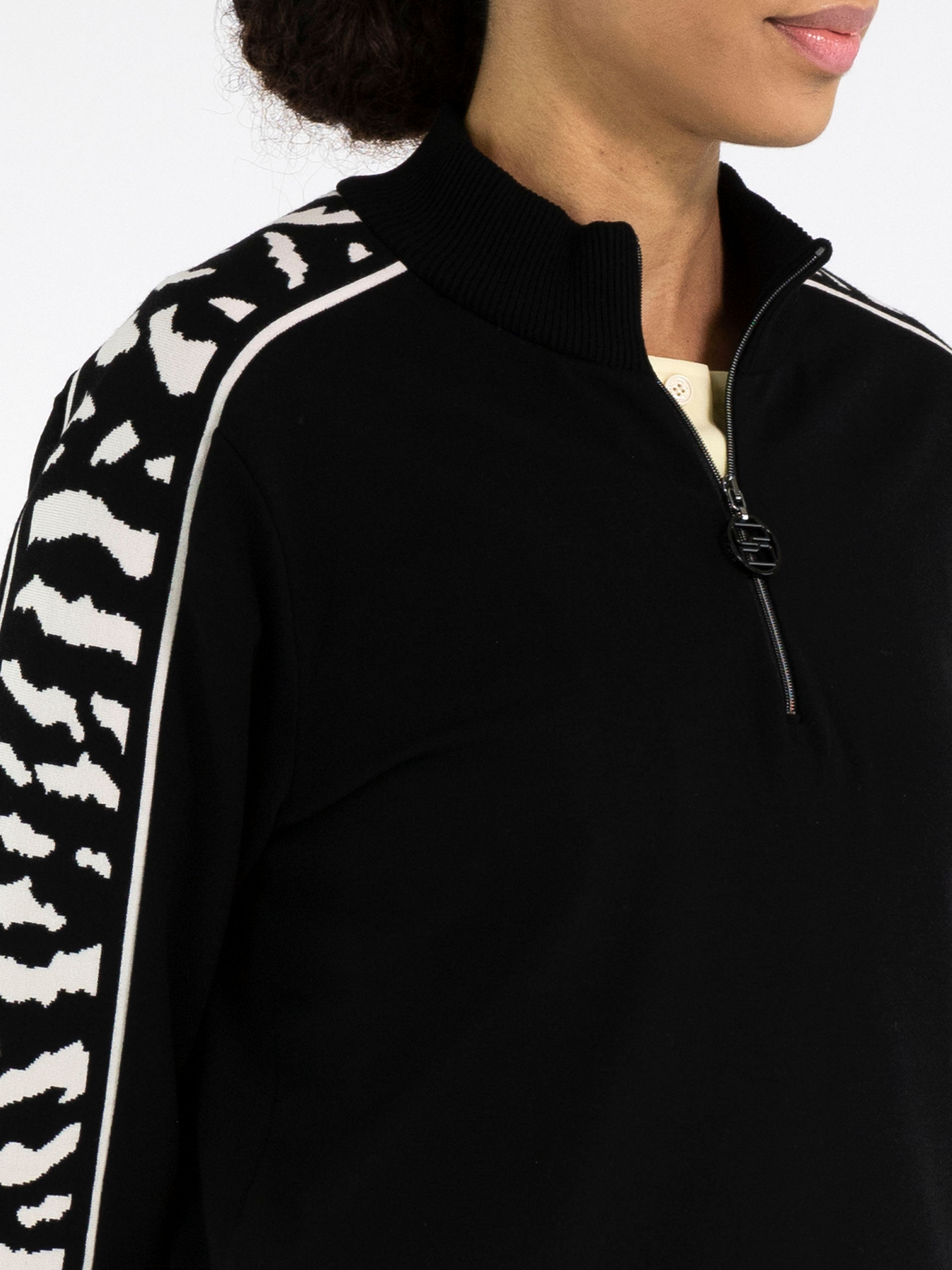 Un sweat de Marc Cain en noir. Une bordure en maille finement côtelée en noir souligne l’encolure ronde, les extrémités des manches mi-longues et le bas. Une fermeture zippée part du col jusqu’au-dessus de la poitrine. Depuis les épaules, un imprimé zèbre en beige et noir traverse le haut des manches. Ce sweat peut être lavé à 30 degrés.