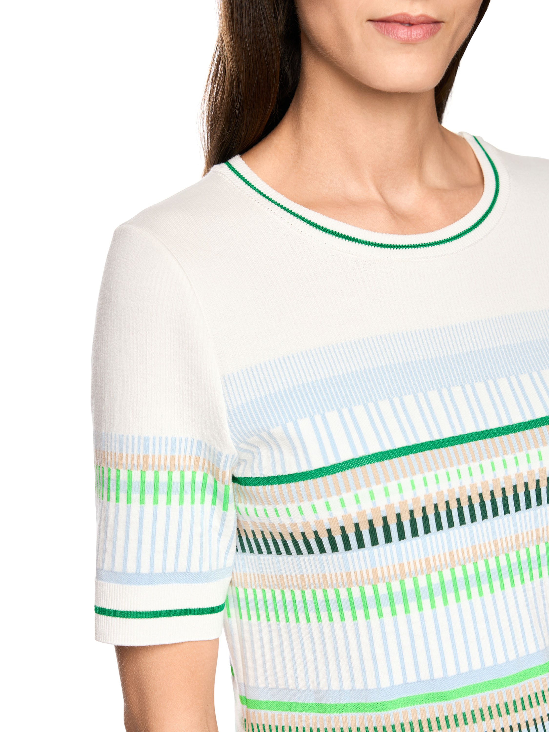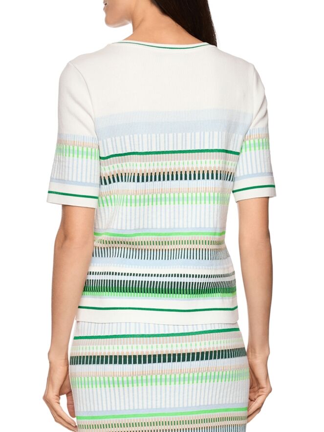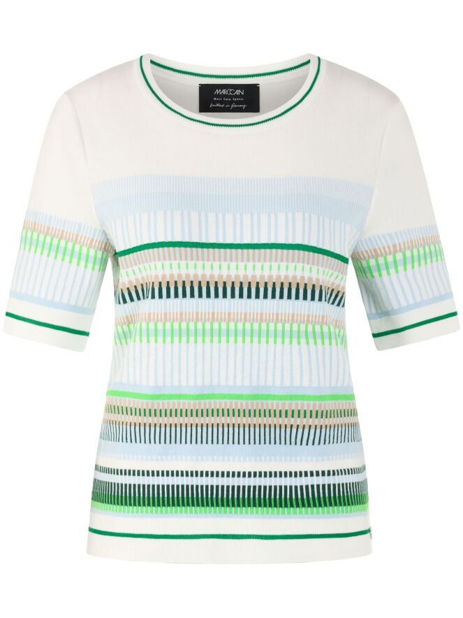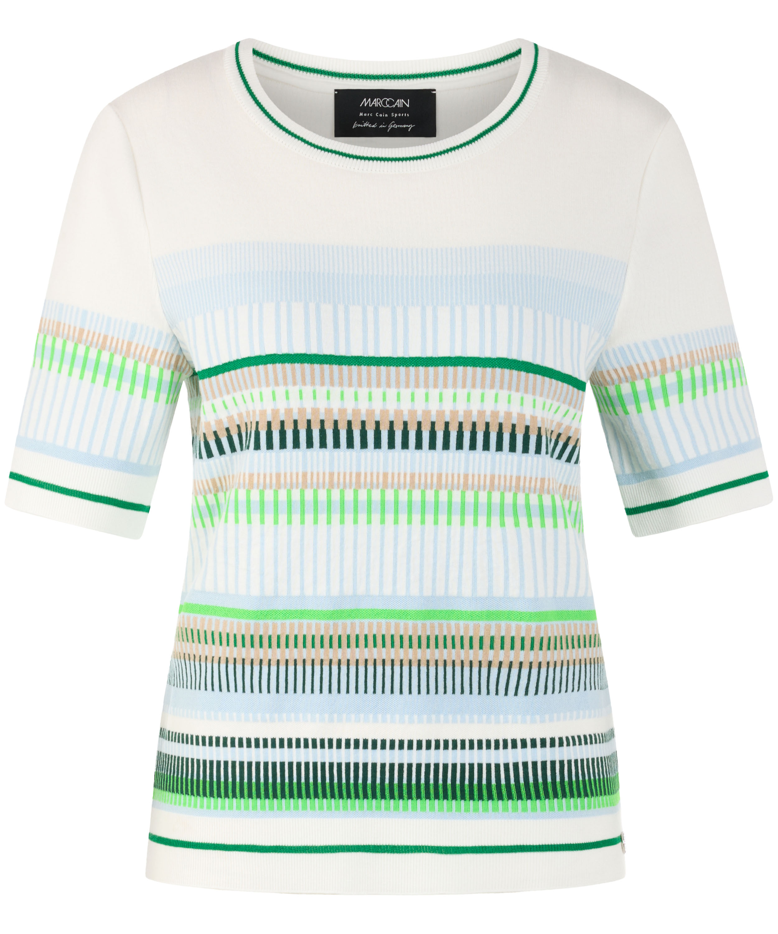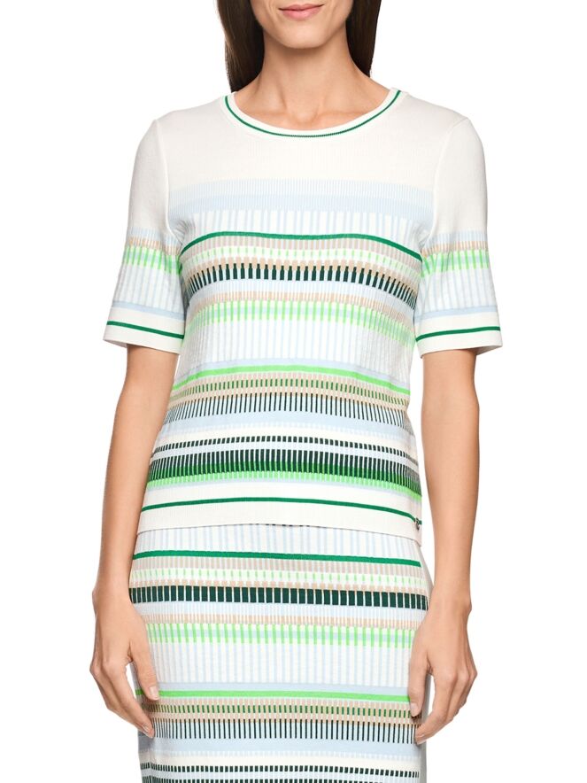 Un tee-shirt de Marc Cain avec un motif à rayures dans les tons bleu, sable, vert clair et foncé et blanc. Le bord de l’encolure ronde, l’ourlet et les manches courtes sont soulignés par une bordure en tricot finement côtelé à motif rayé dans les tons vert et blanc crème. Ce tee-shirt peut être lavé à 30 degrés.