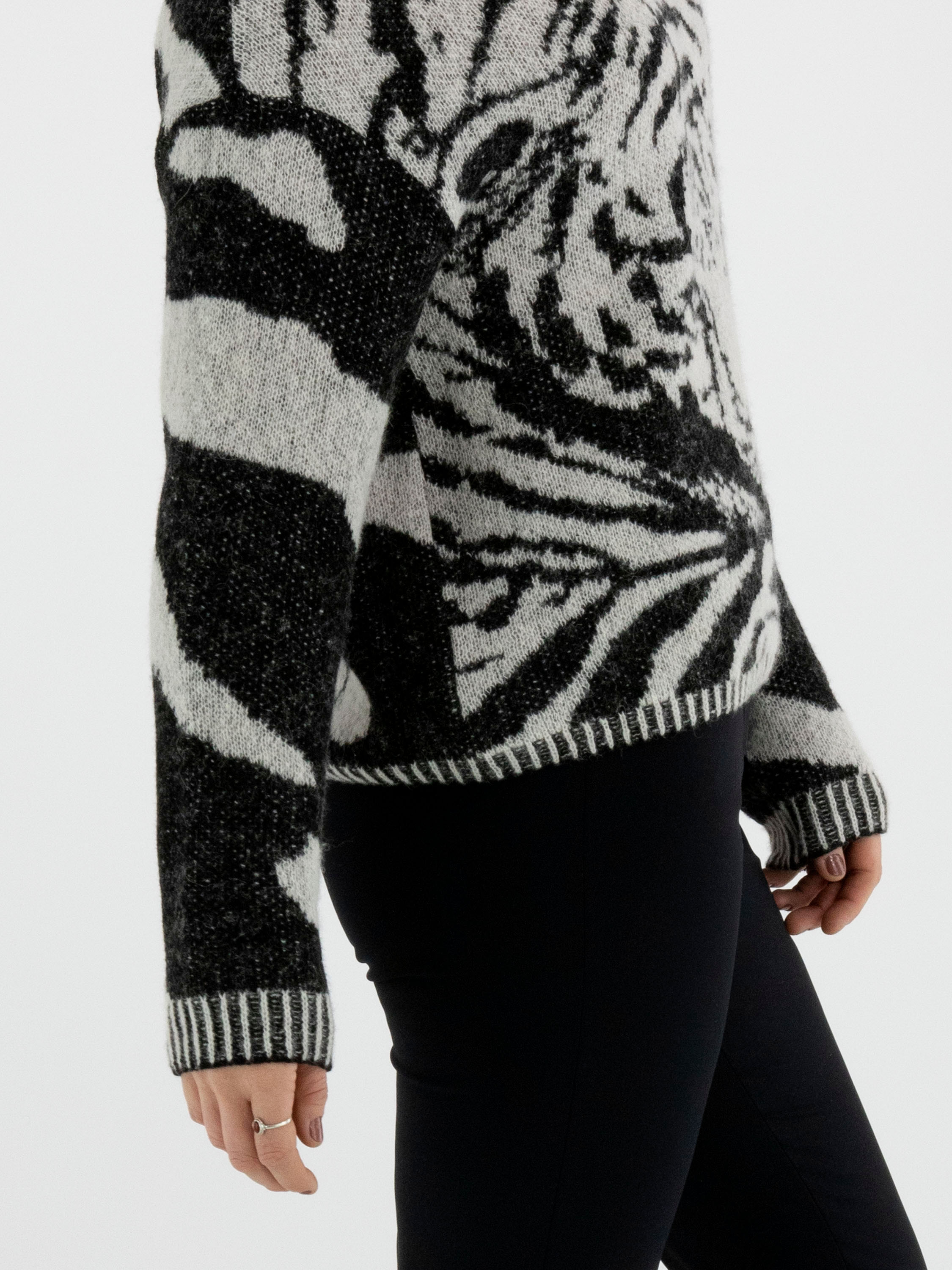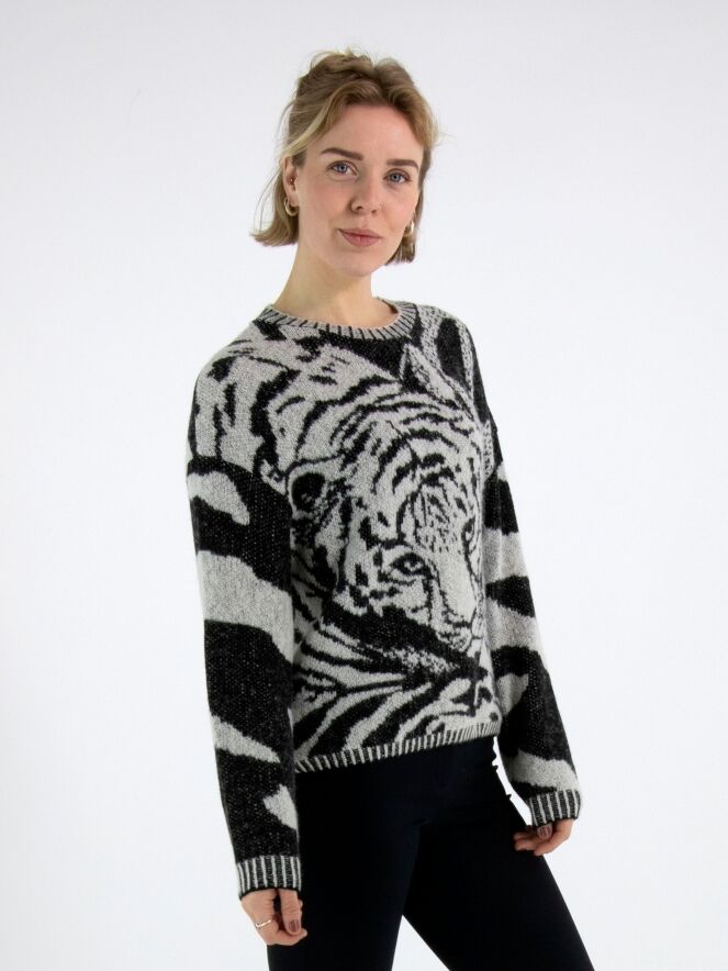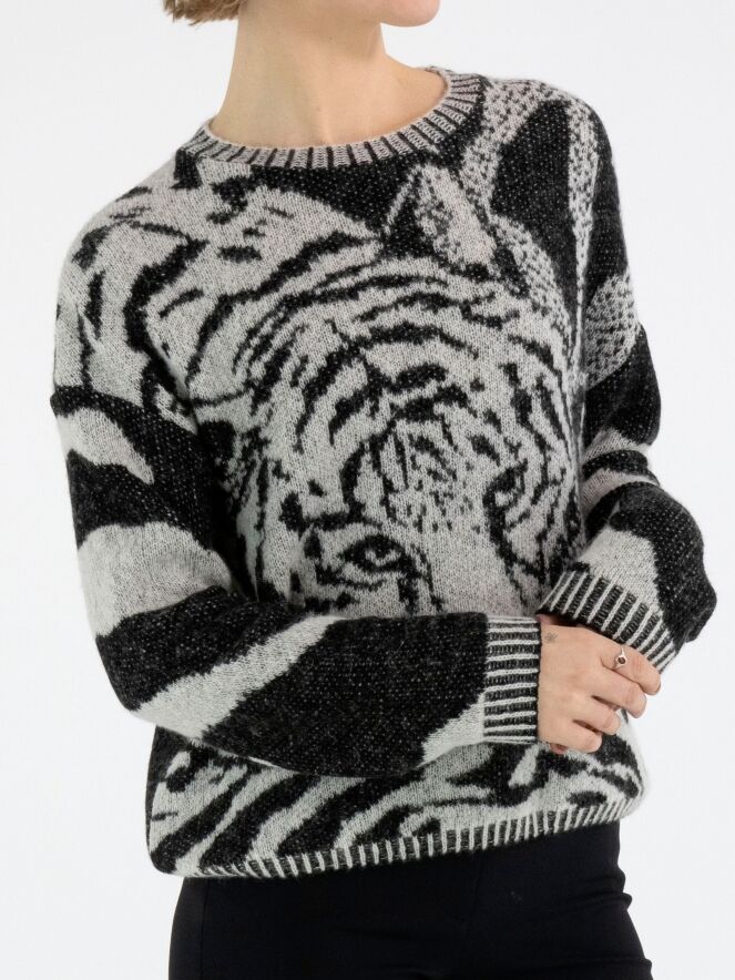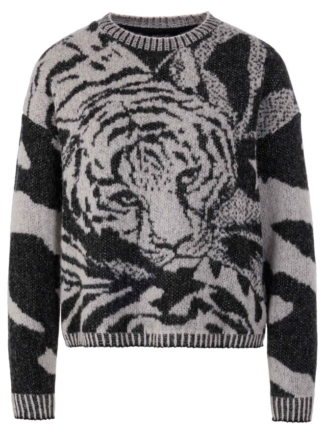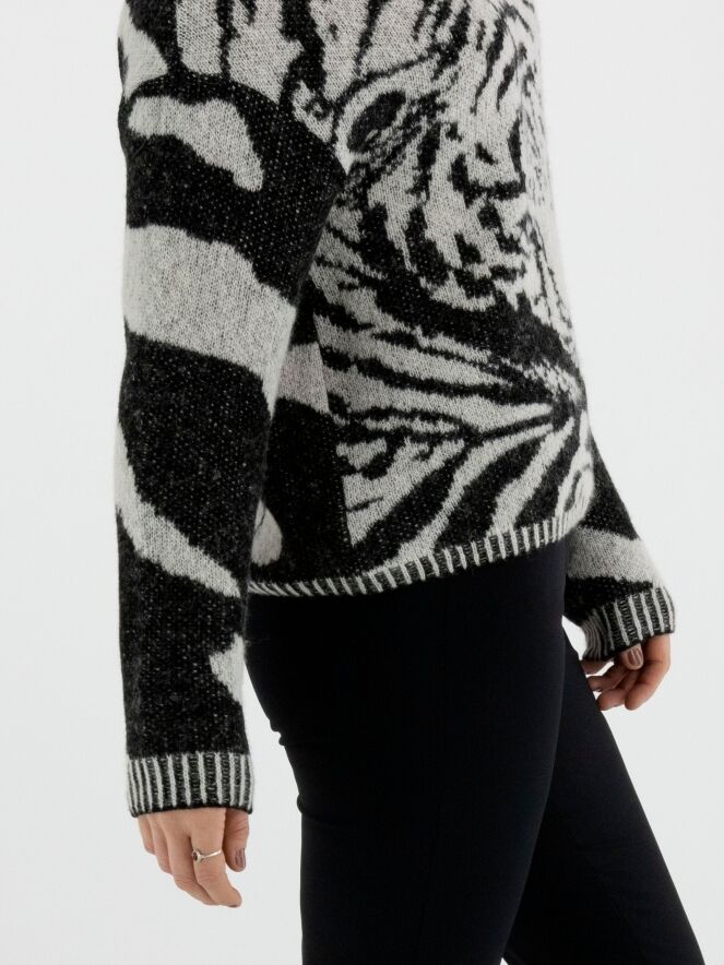 Un pull de Marc Cain avec un imprimé léopard sur le devant en noir et gris clair. Les manches longues et le dos sont réalisés dans un imprimé zèbre dans les mêmes couleurs. L’encolure ronde, les extrémités des manches et le bas sont soulignés d’une bordure côtelée imprimée. Ce pull peut être lavé à la main.