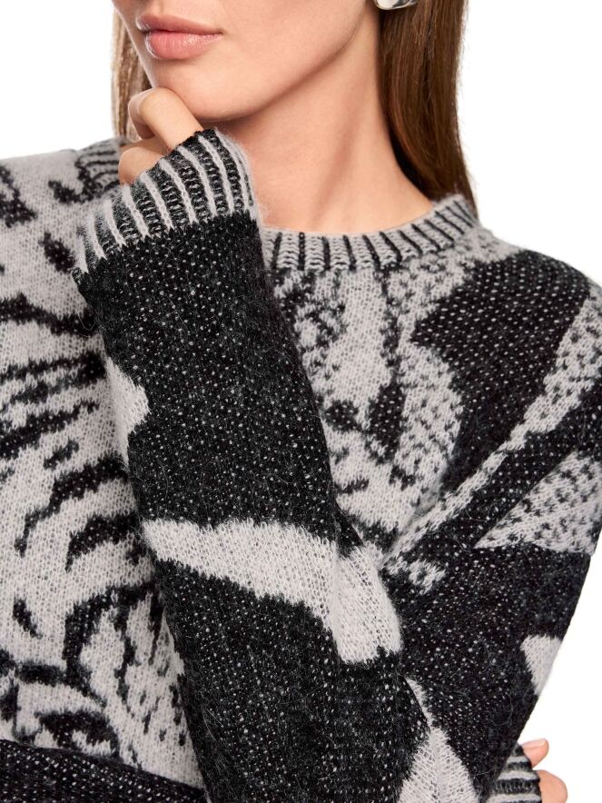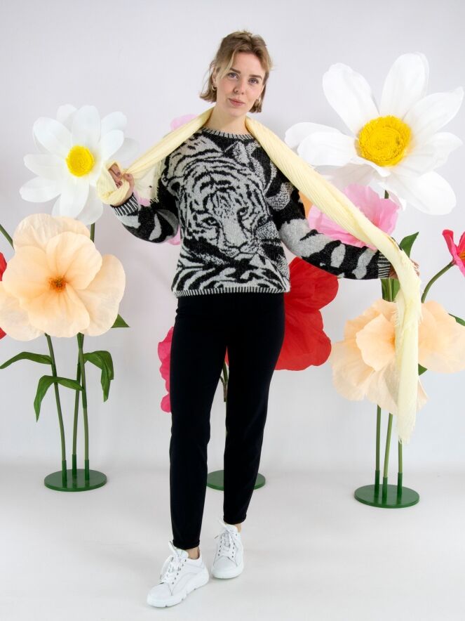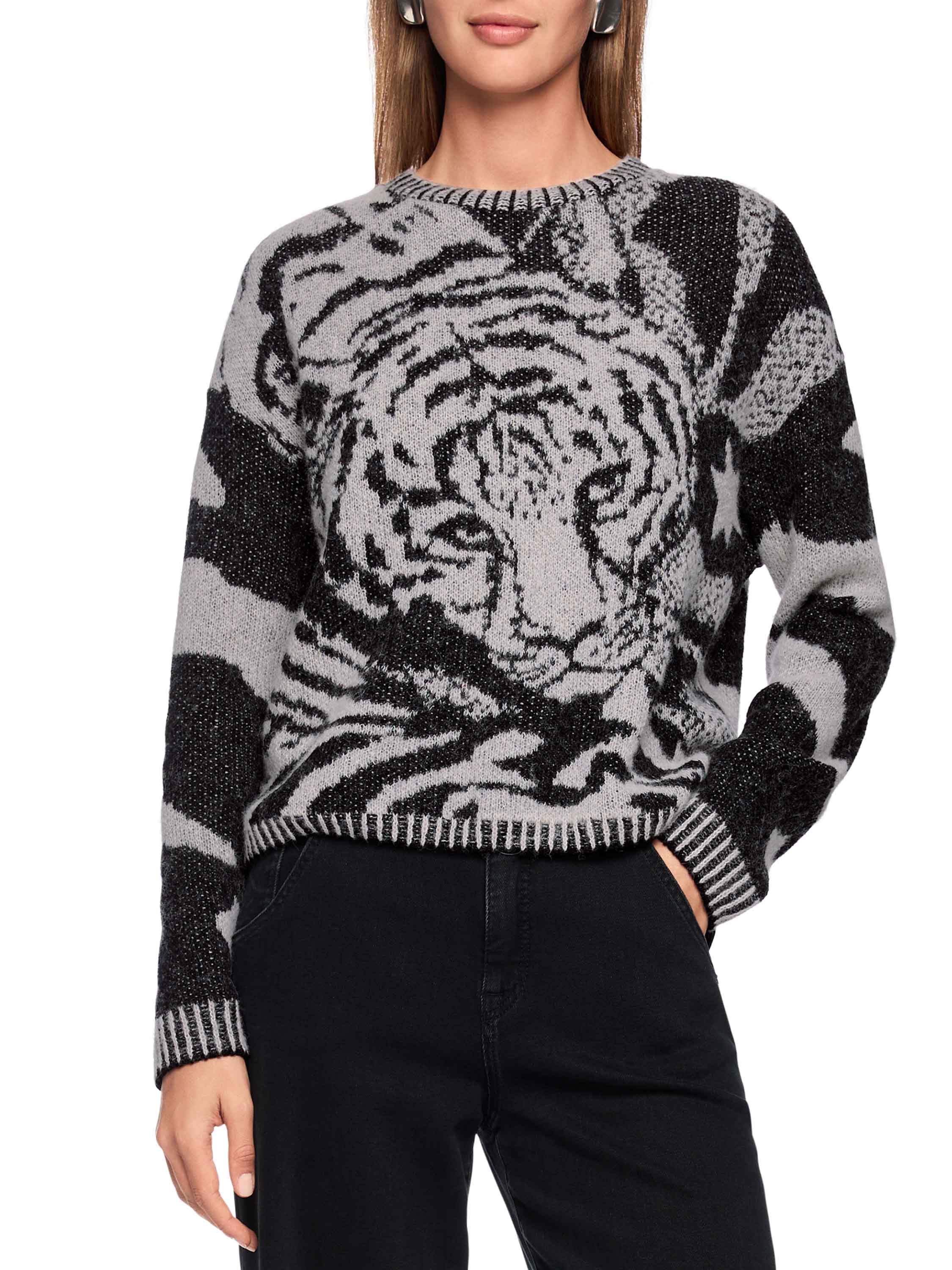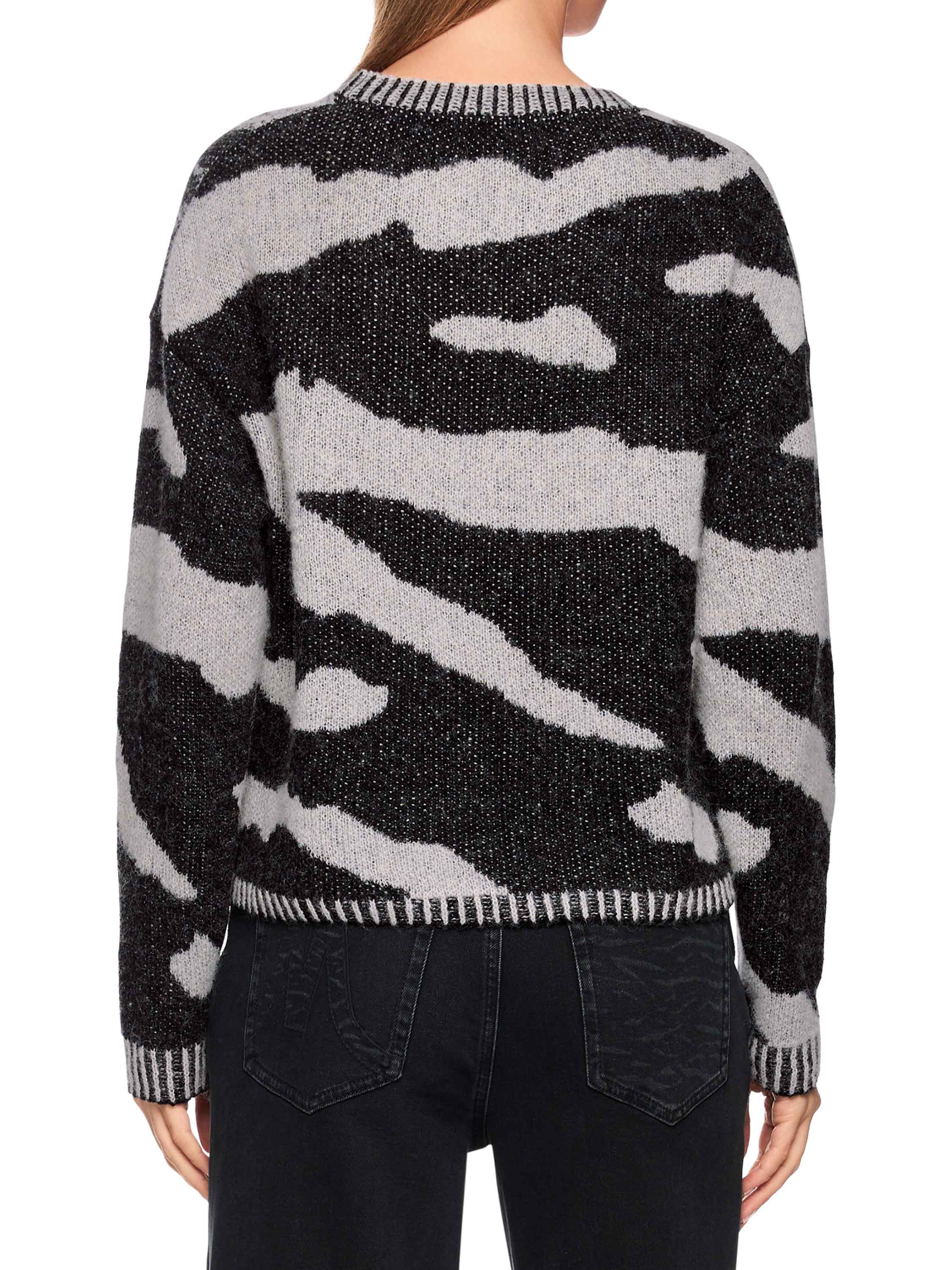 Un pull de Marc Cain avec un imprimé léopard sur le devant en noir et gris clair. Les manches longues et le dos sont réalisés dans un imprimé zèbre dans les mêmes couleurs. L’encolure ronde, les extrémités des manches et le bas sont soulignés d’une bordure côtelée imprimée. Ce pull peut être lavé à la main.