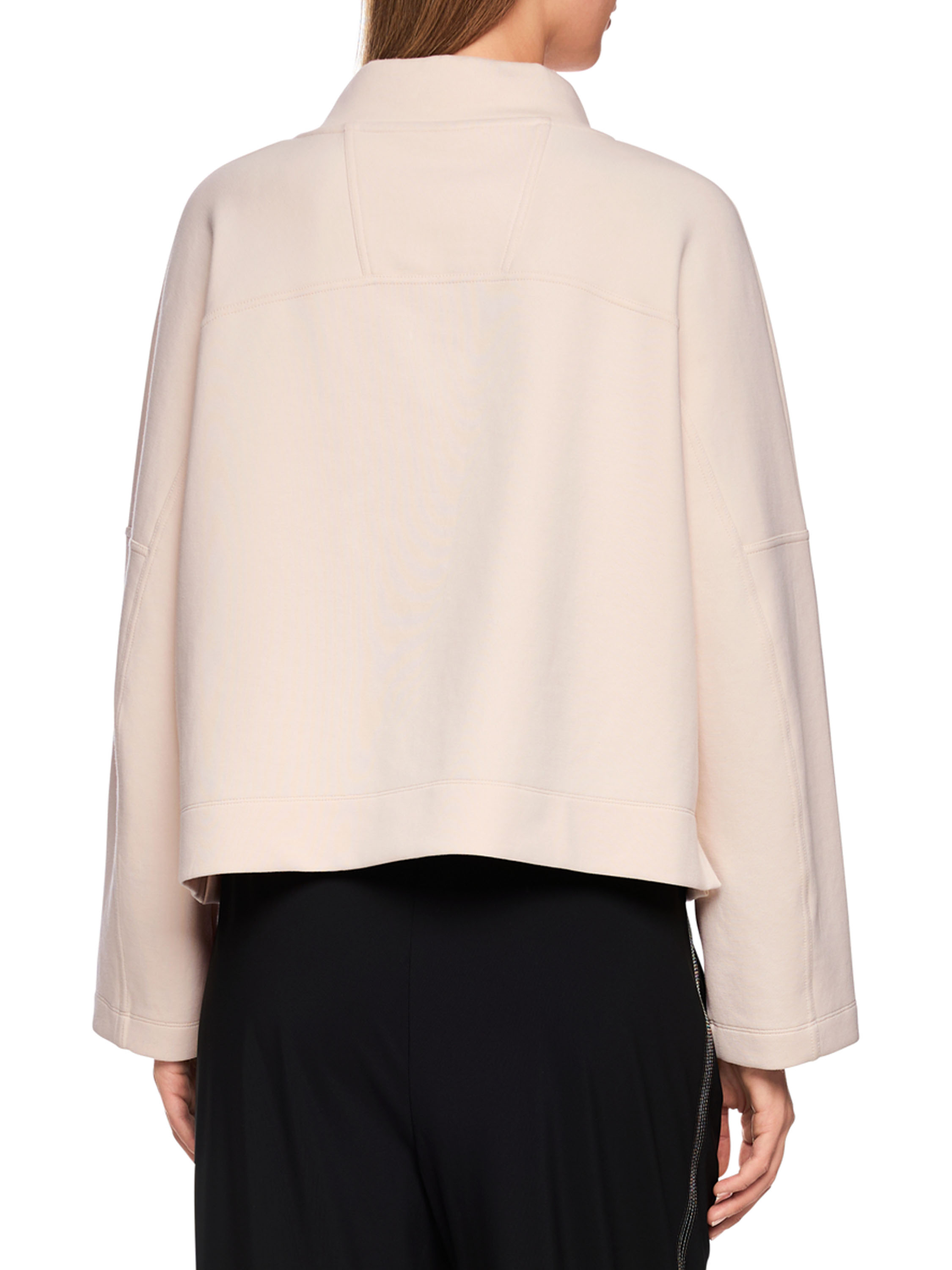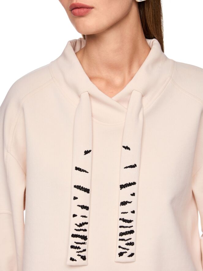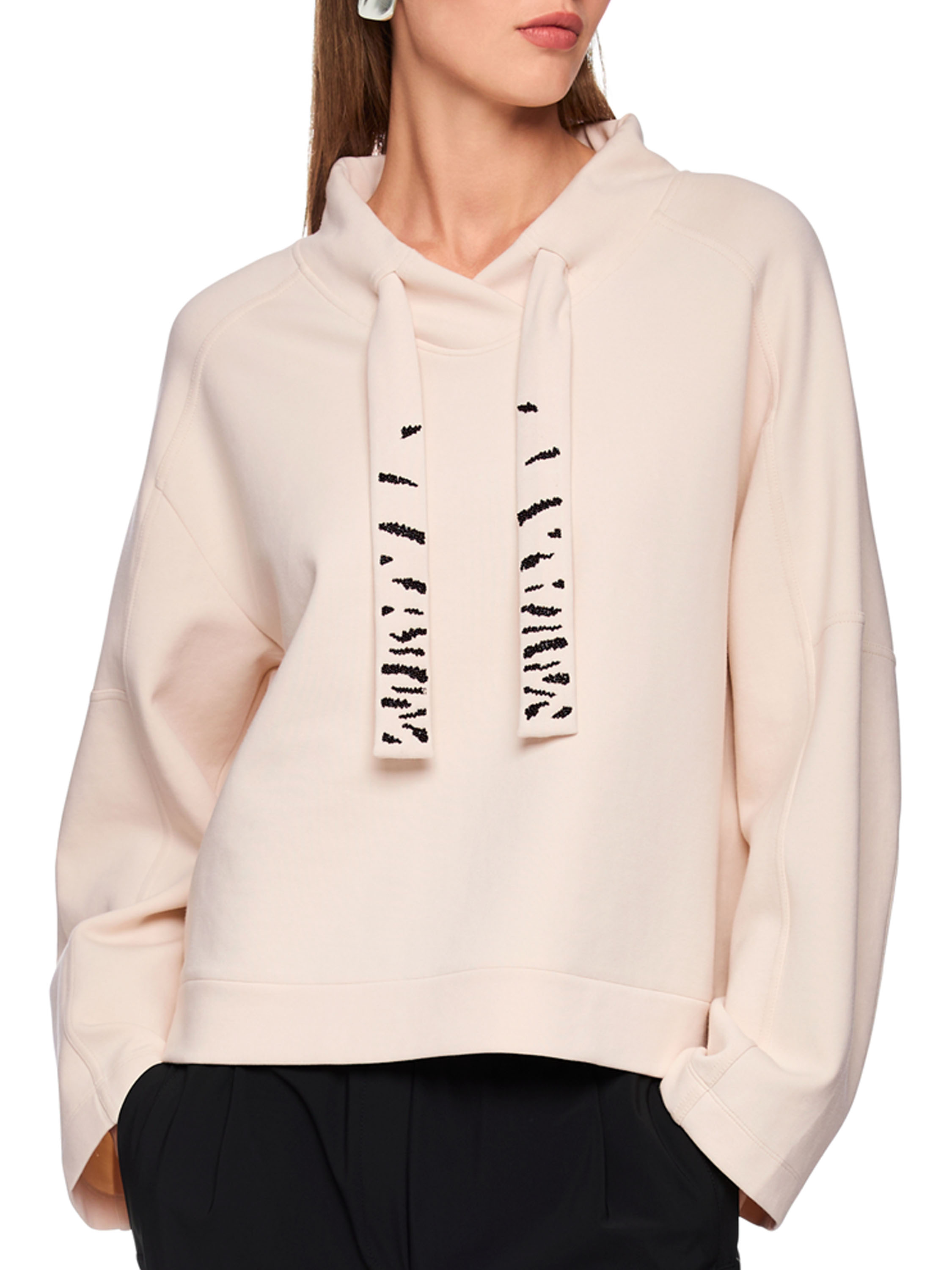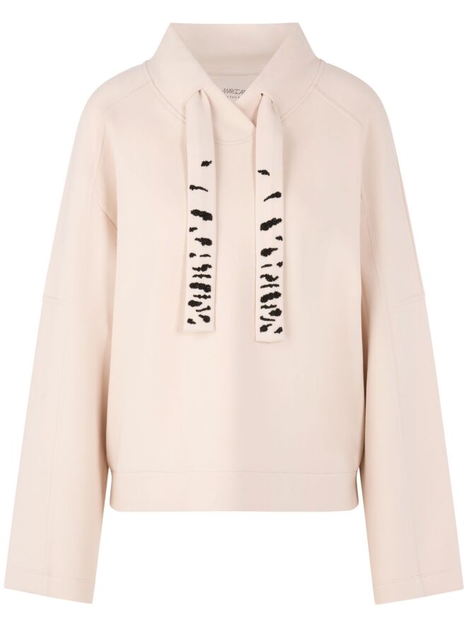 Un sweatshirt de Marc Cain de couleur beige. Depuis l’encolure part un ruban beige orné de strass noirs en motif zèbre. Ce sweatshirt peut être lavé à 30 degrés.