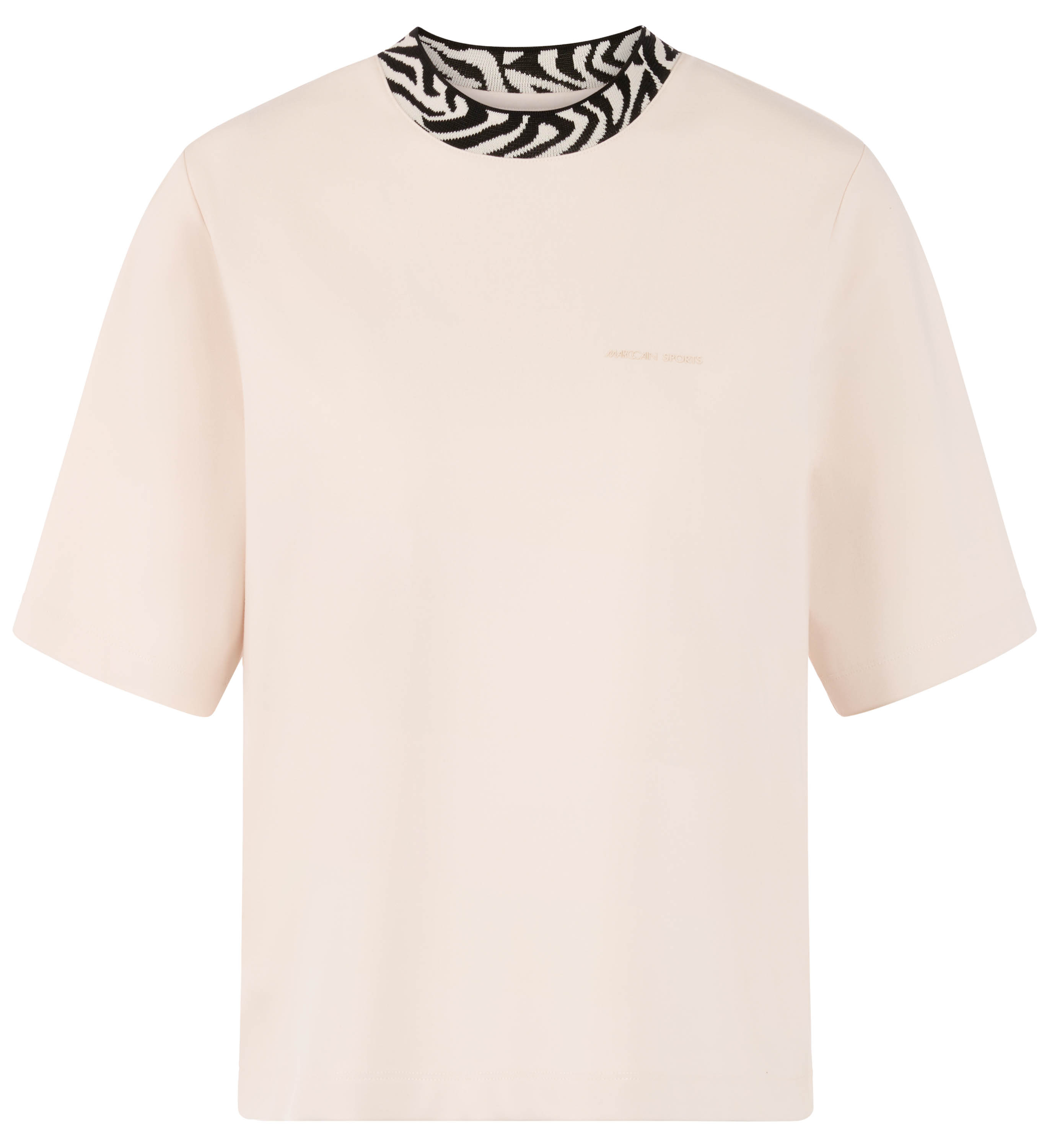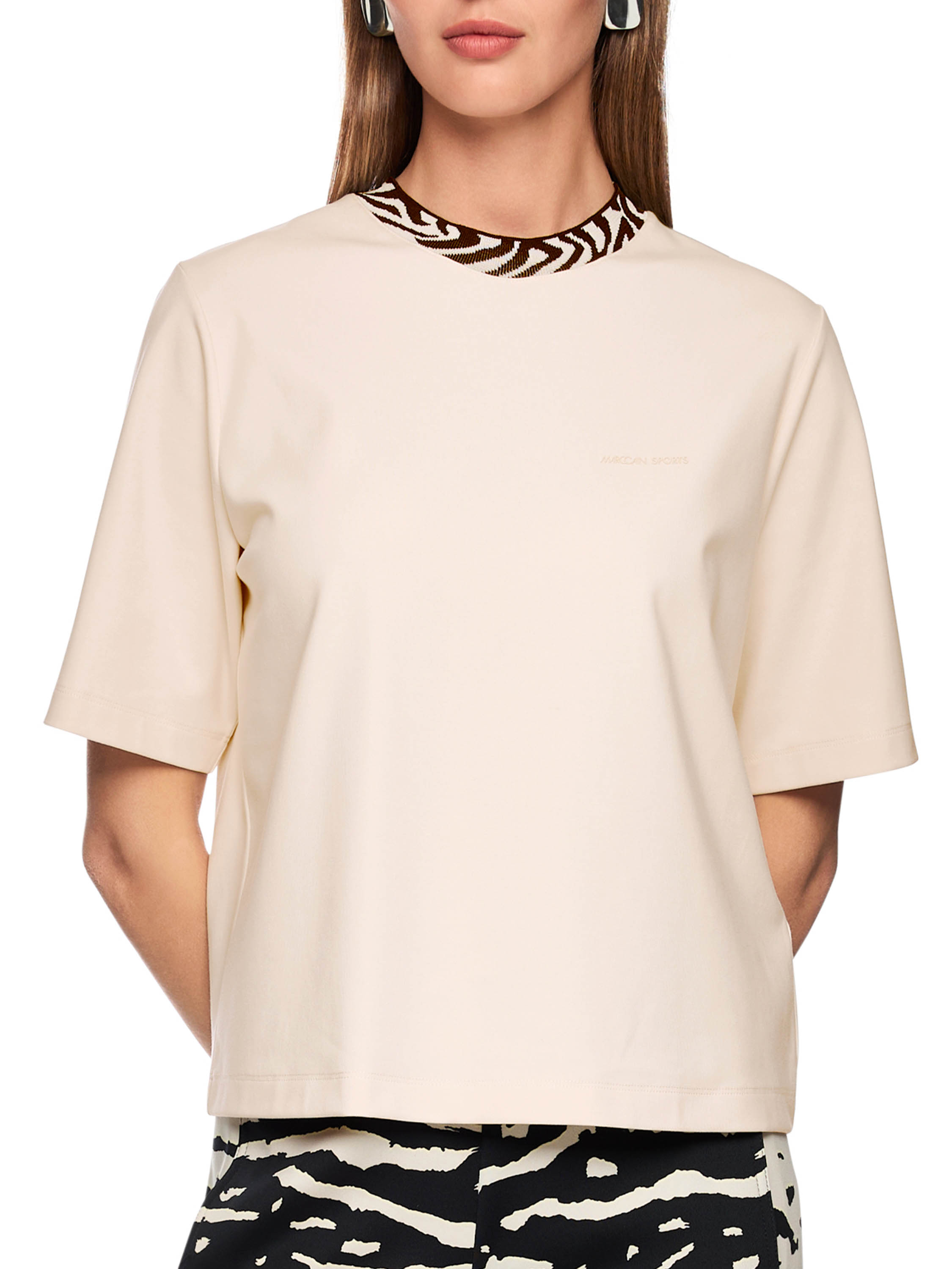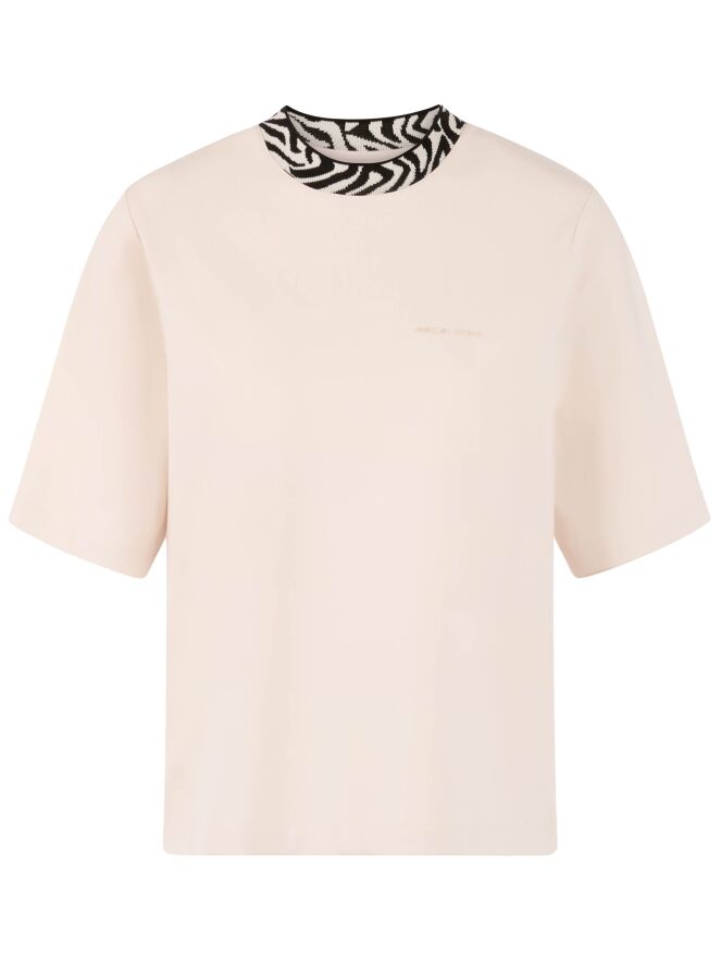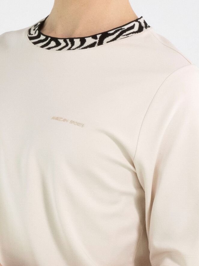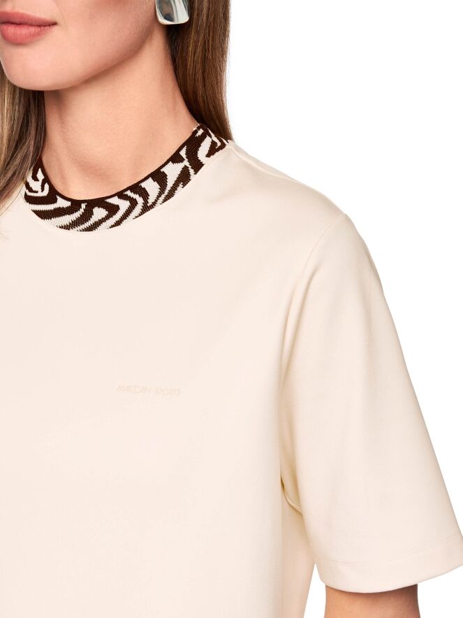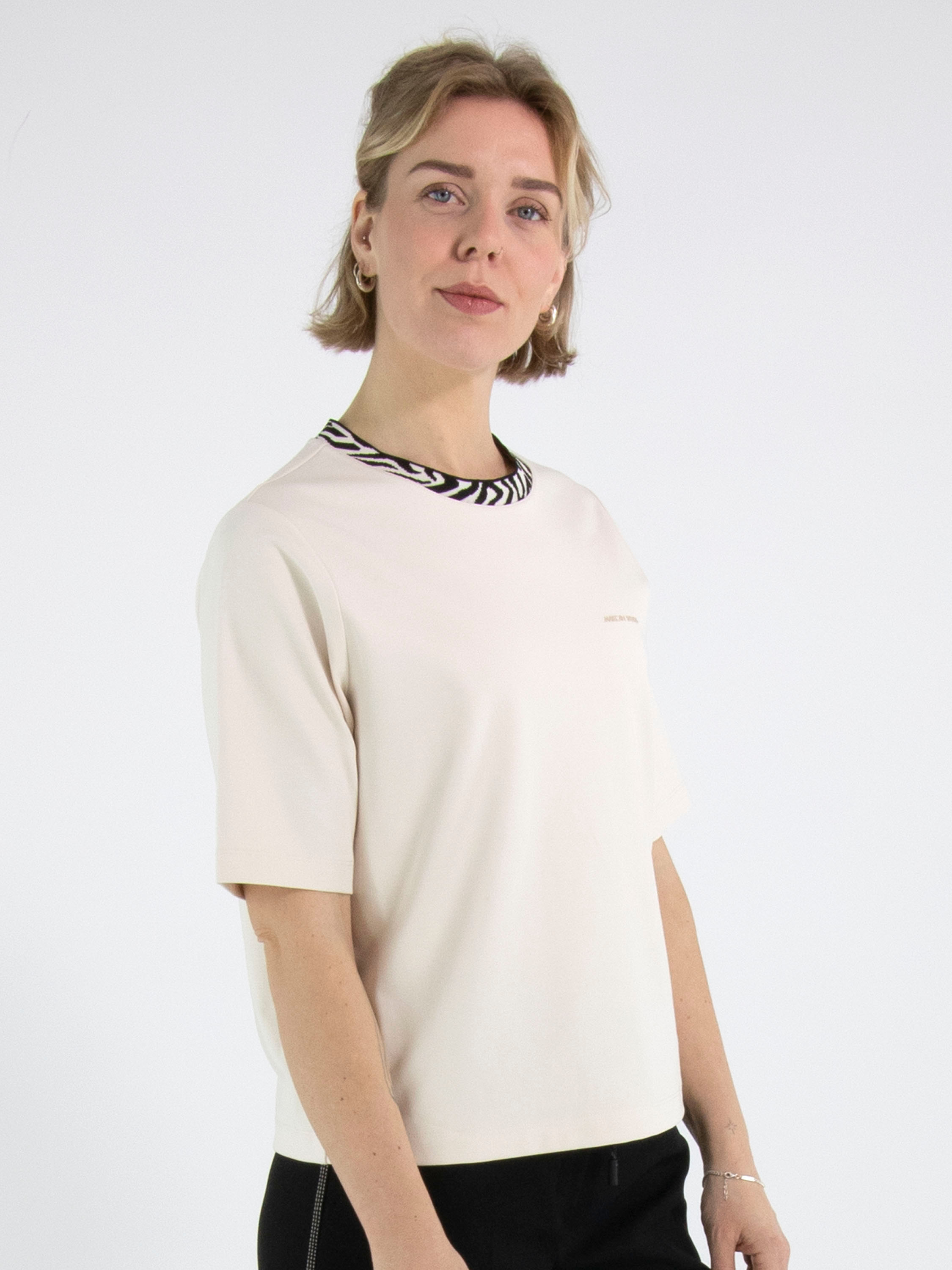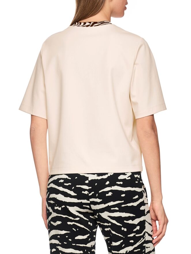 Un shirt de Marc Cain en beige. Le shirt a des manches courtes. Le long de l’encolure ronde se trouve une bande imprimée zèbre en beige et noir. Ce shirt peut être lavé à 30 degrés.