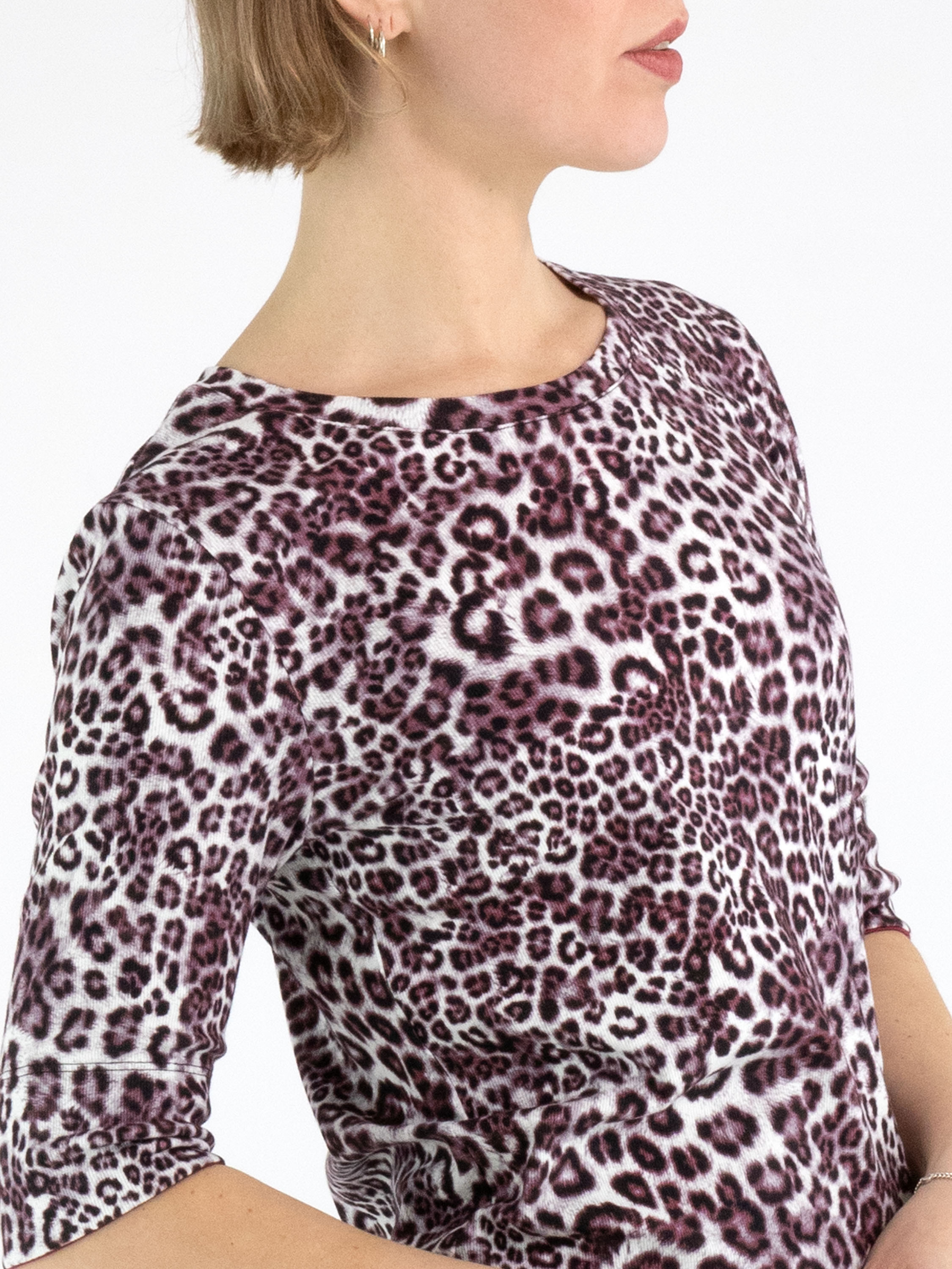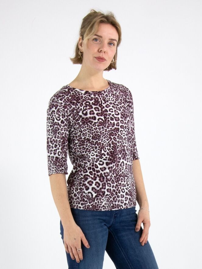 Un shirt de Marc Cain à structure finement côtelée avec un imprimé léopard dans plusieurs nuances de gris, bordeaux et blanc cassé. Les manches courtes ont un revers en bordeaux uni. Le shirt possède un col rond et peut être lavé à 30 degrés.