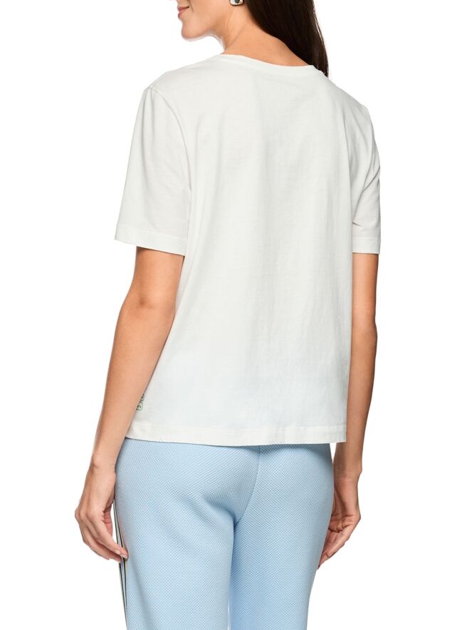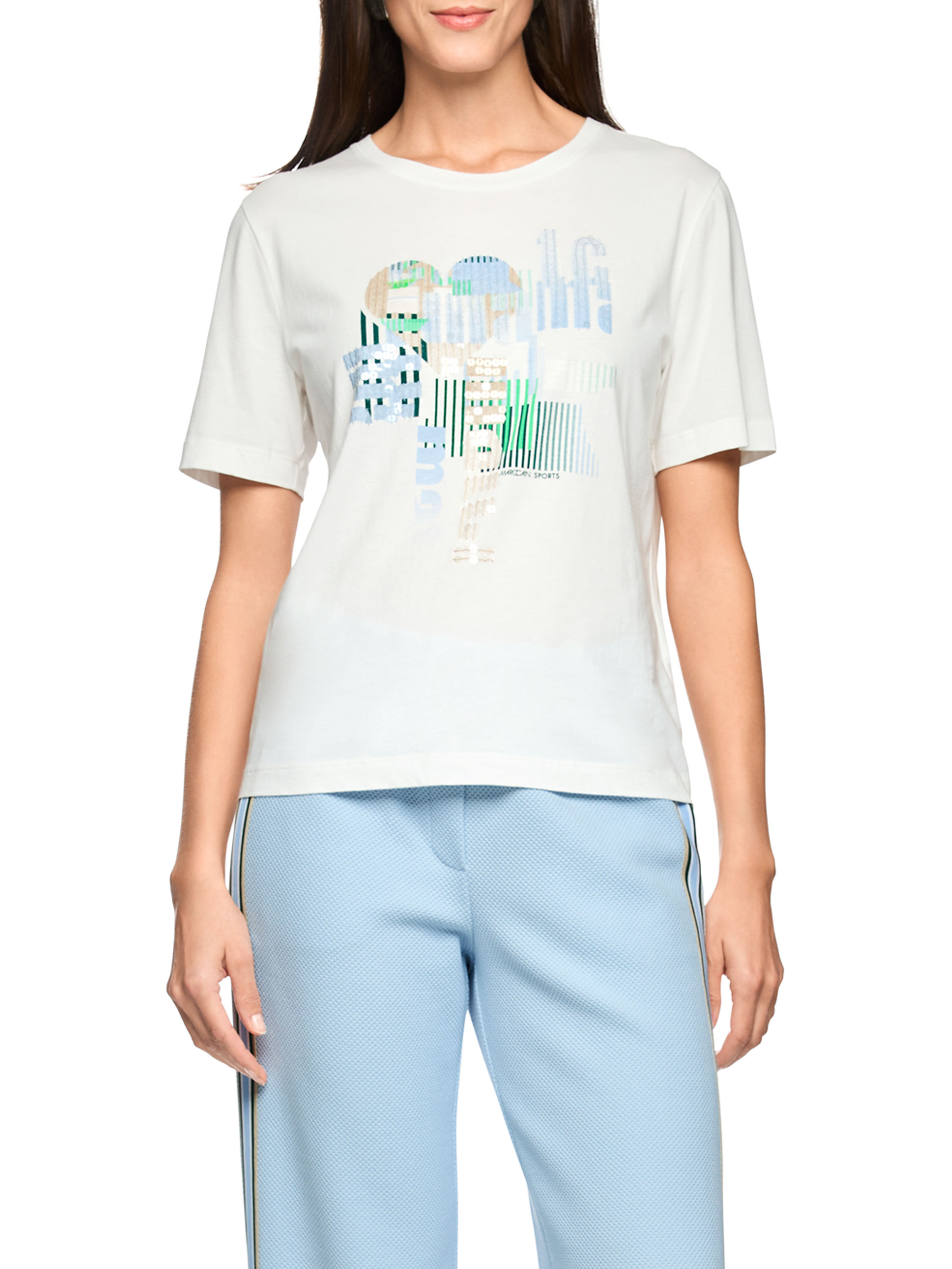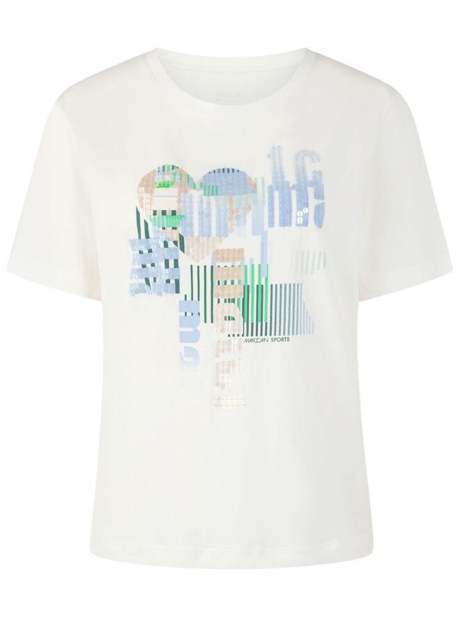 T-shirt de Marc Cain avec un imprimé graphique agrémenté de sequins transparents subtilement intégrés dans des tons de bleu, vert et beige sur fond blanc. Doté d’un col rond et de manches courtes, il offre une allure fraîche et contemporaine. Ce haut de créateur exclusif peut être lavé à 30 degrés.