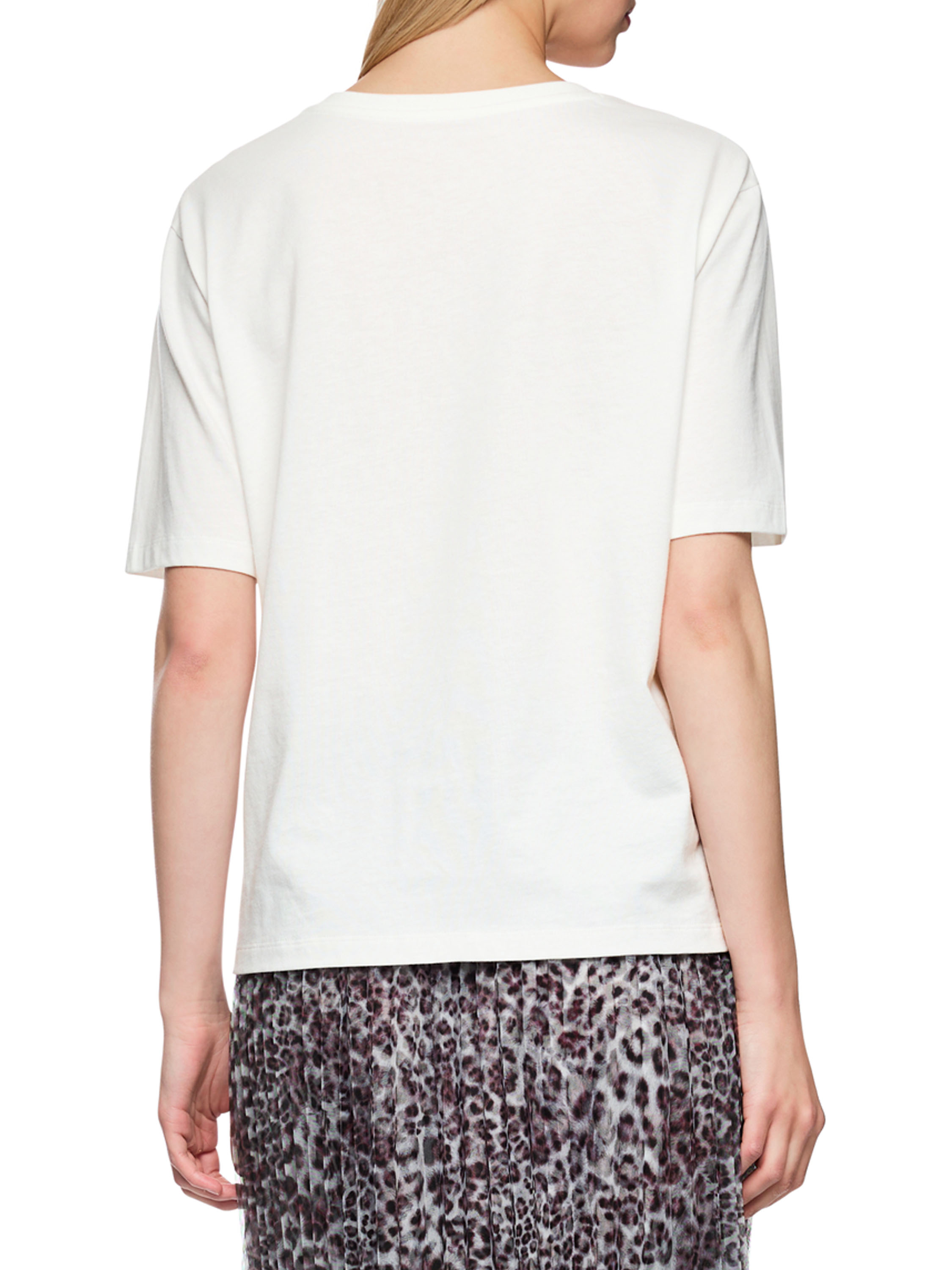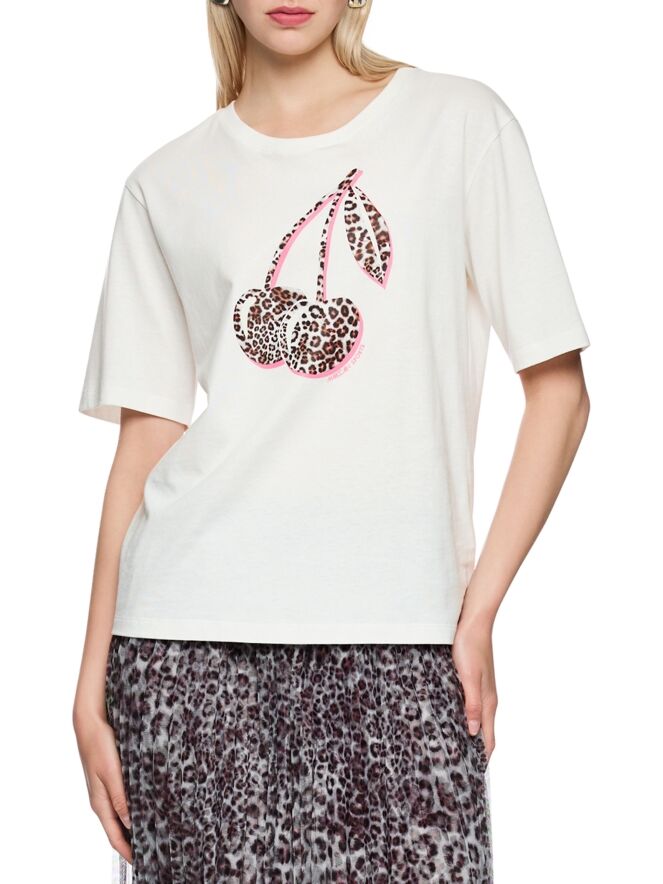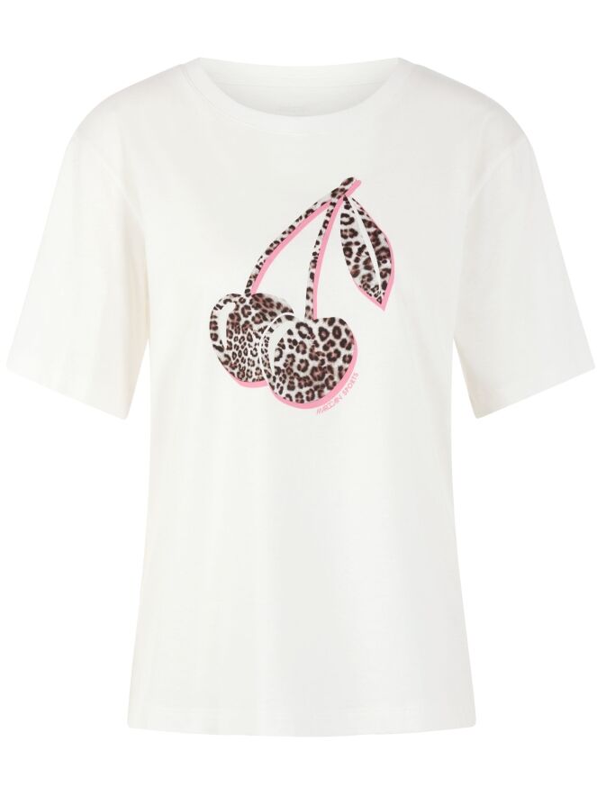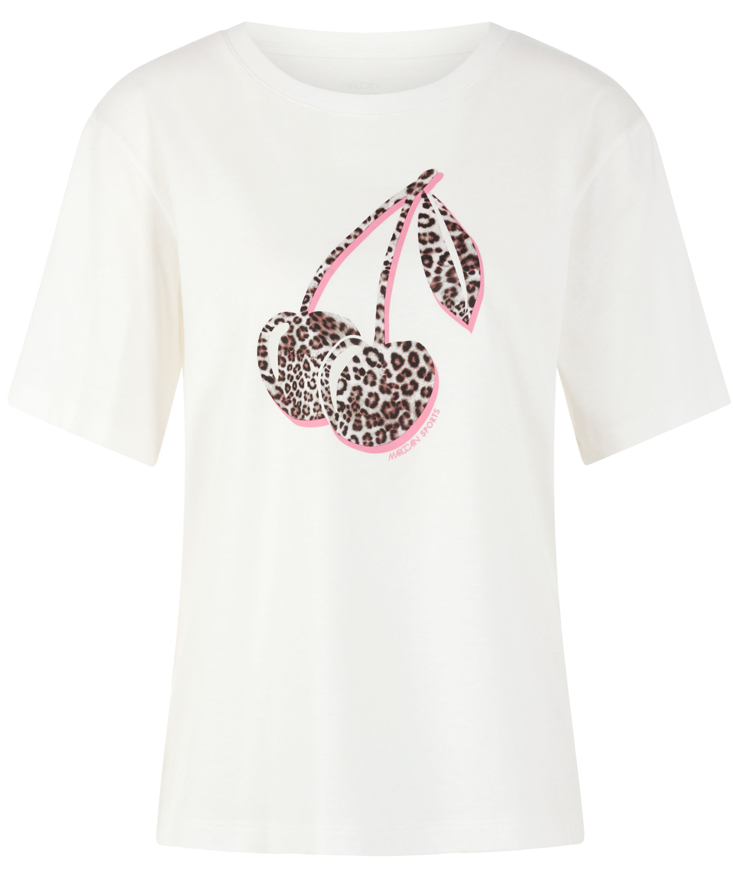 Un shirt ample à coupe droite de Marc Cain de couleur blanche. Sur le devant se trouve une grappe décorative de cerises en imprimé léopard, soulignée par un liseré rose saumon le long des tiges. Le shirt possède une encolure ronde et des manches courtes. Ce shirt peut être lavé à 30 degrés.
