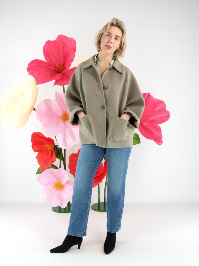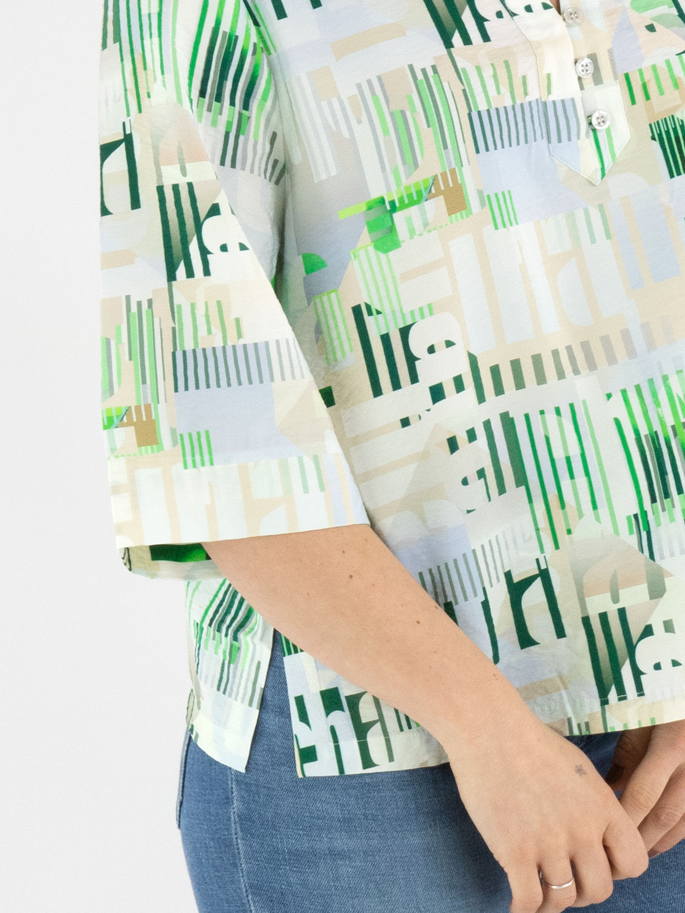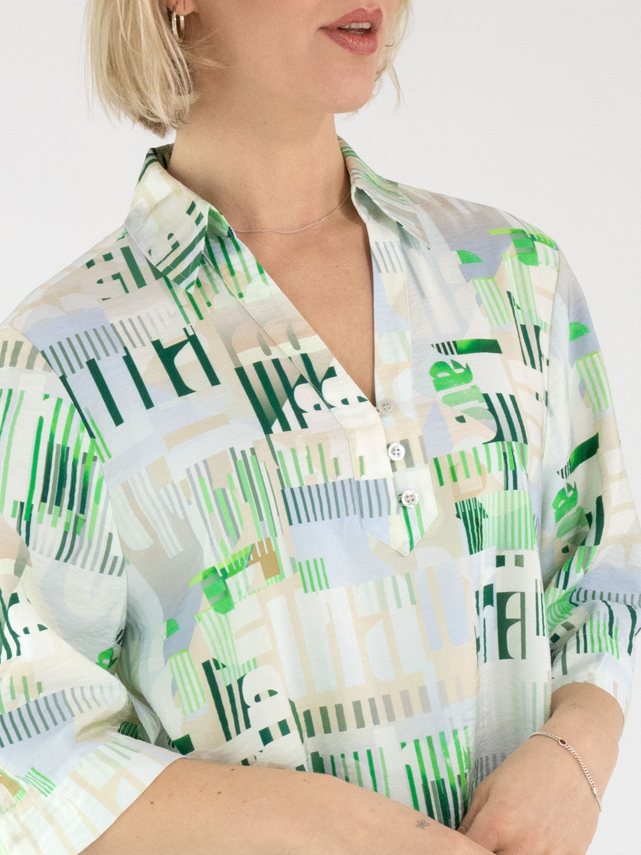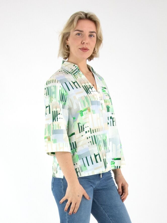 Une blouse de Marc Cain avec un imprimé graphique de lettres et de rayures dans les tons sable, bleu, vert foncé, vert vif et blanc crème. La blouse présente un décolleté en V avec col et des manches courtes. Cette blouse peut être lavée à 30 degrés.