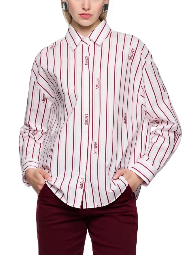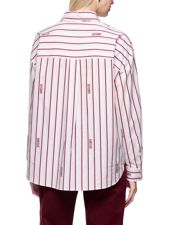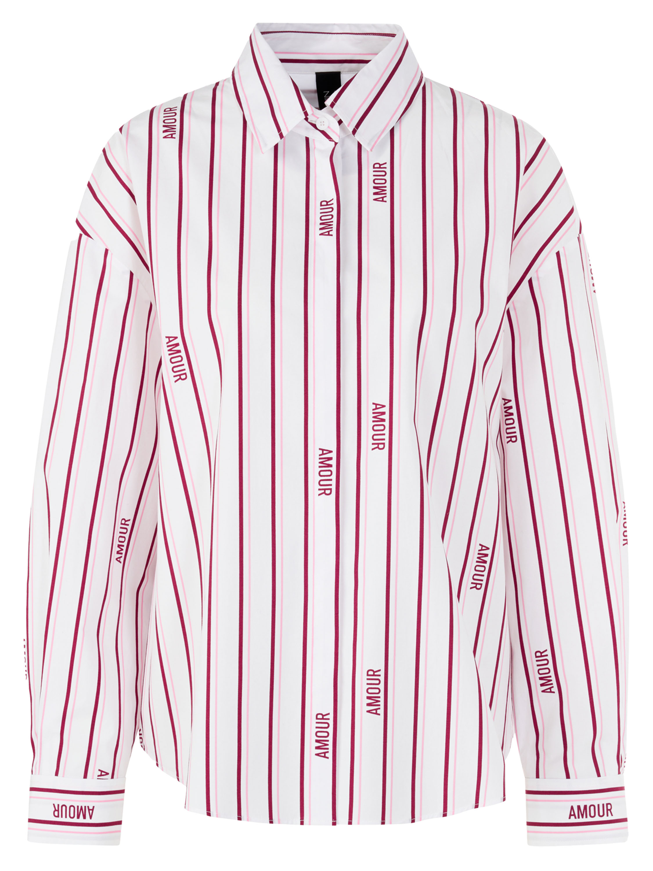 Une blouse de Marc Cain avec un motif rayé en bordeaux et rose pastel sur fond blanc. Entre les lignes figure à plusieurs endroits le mot amour. La blouse possède une patte de boutonnage invisible et des manches longues. Cette blouse peut être lavée à 30 degrés.