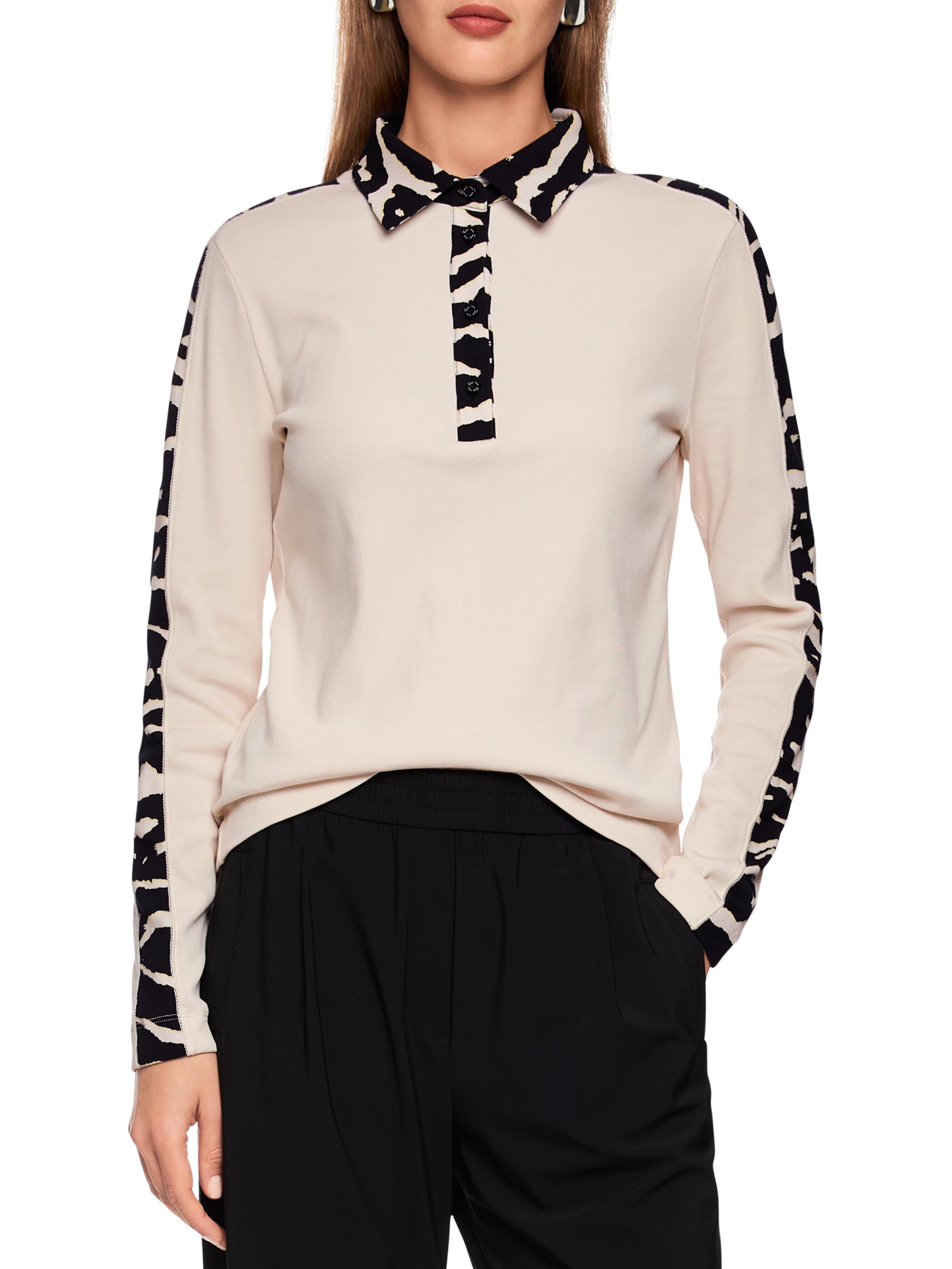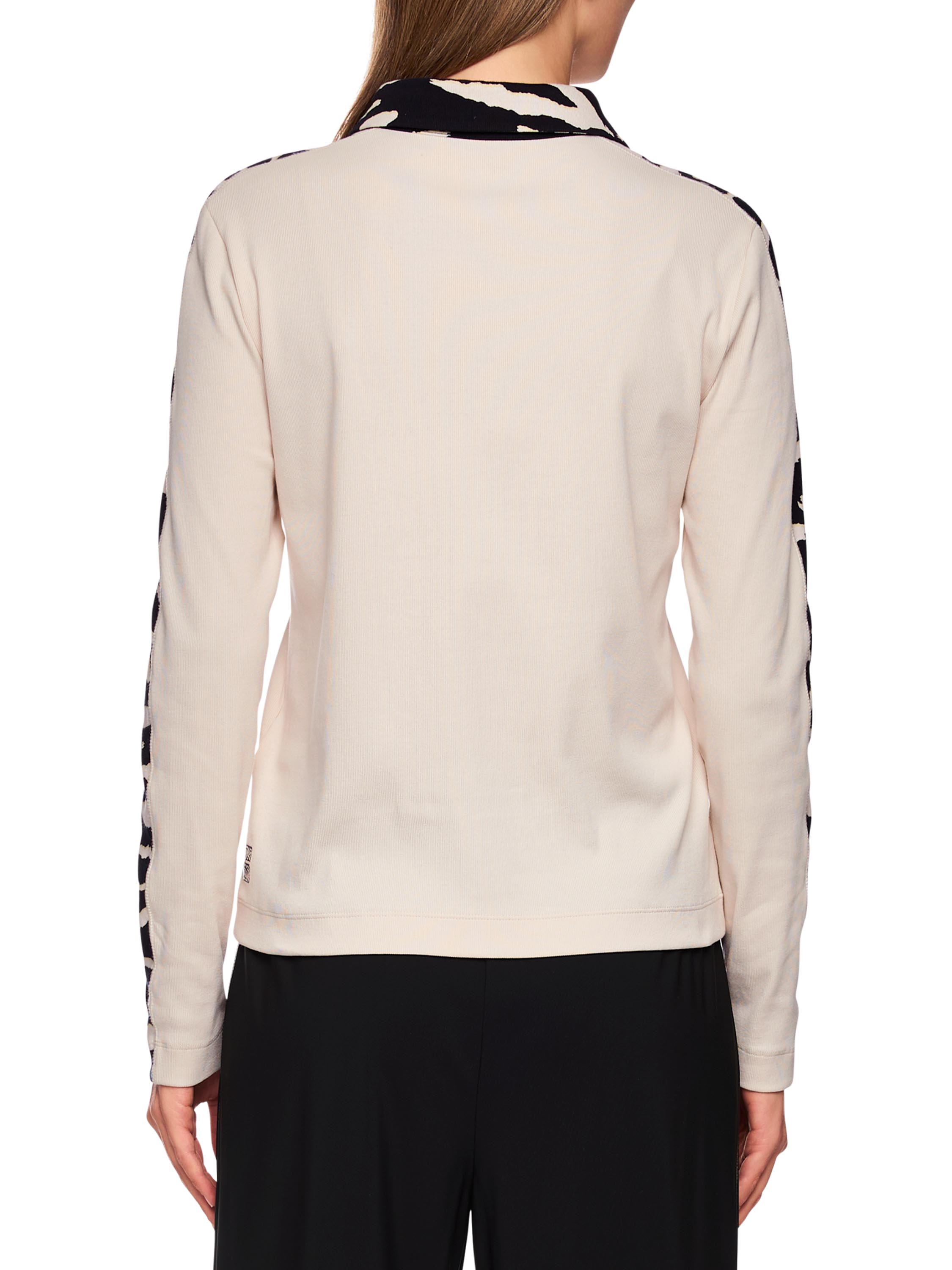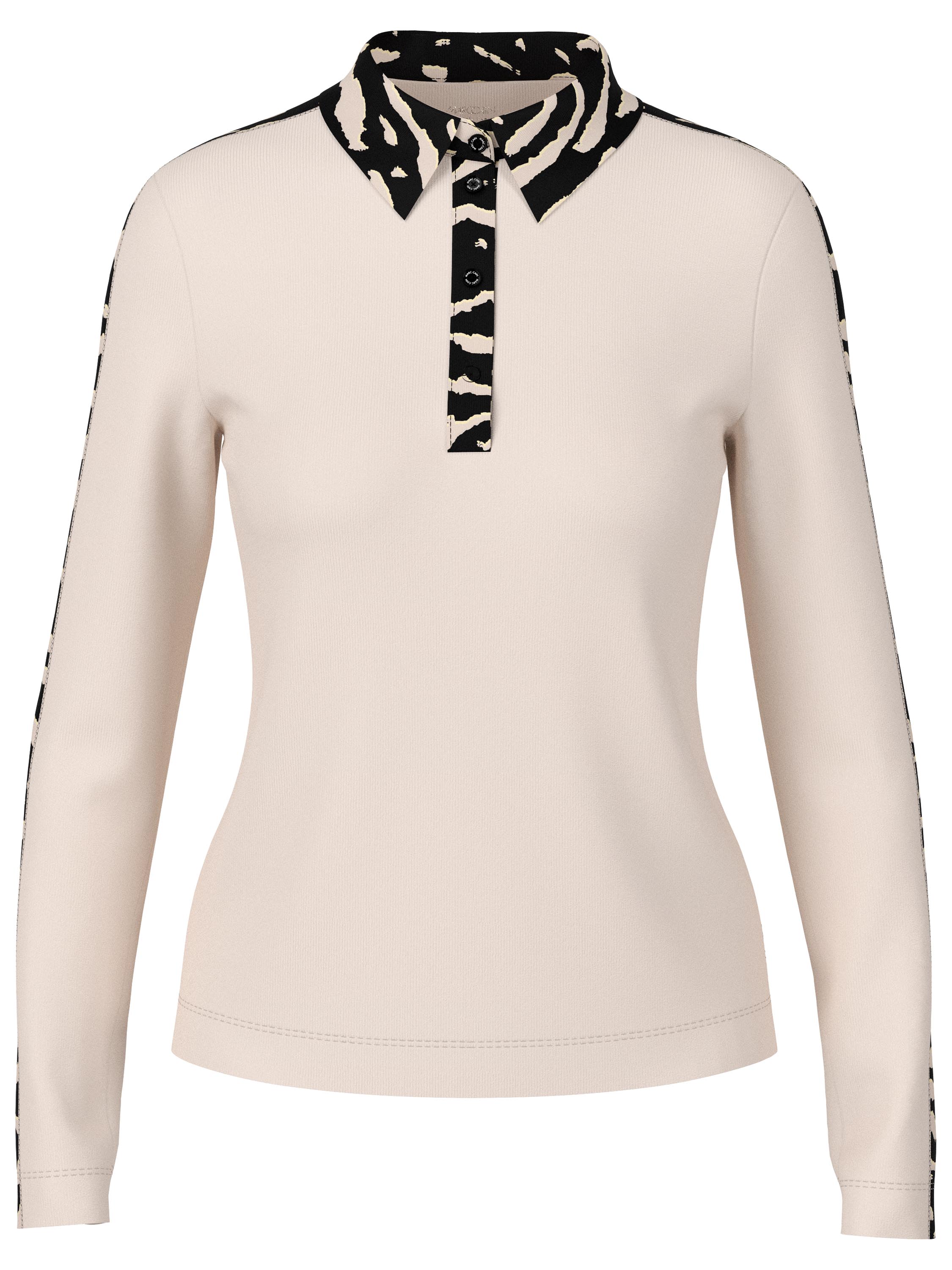 Un polo finement côtelé de Marc Cain en beige. Le col, le haut des manches longues et la bordure le long des boutons sont réalisés dans un imprimé zèbre. Ce polo peut être lavé à 30 degrés.