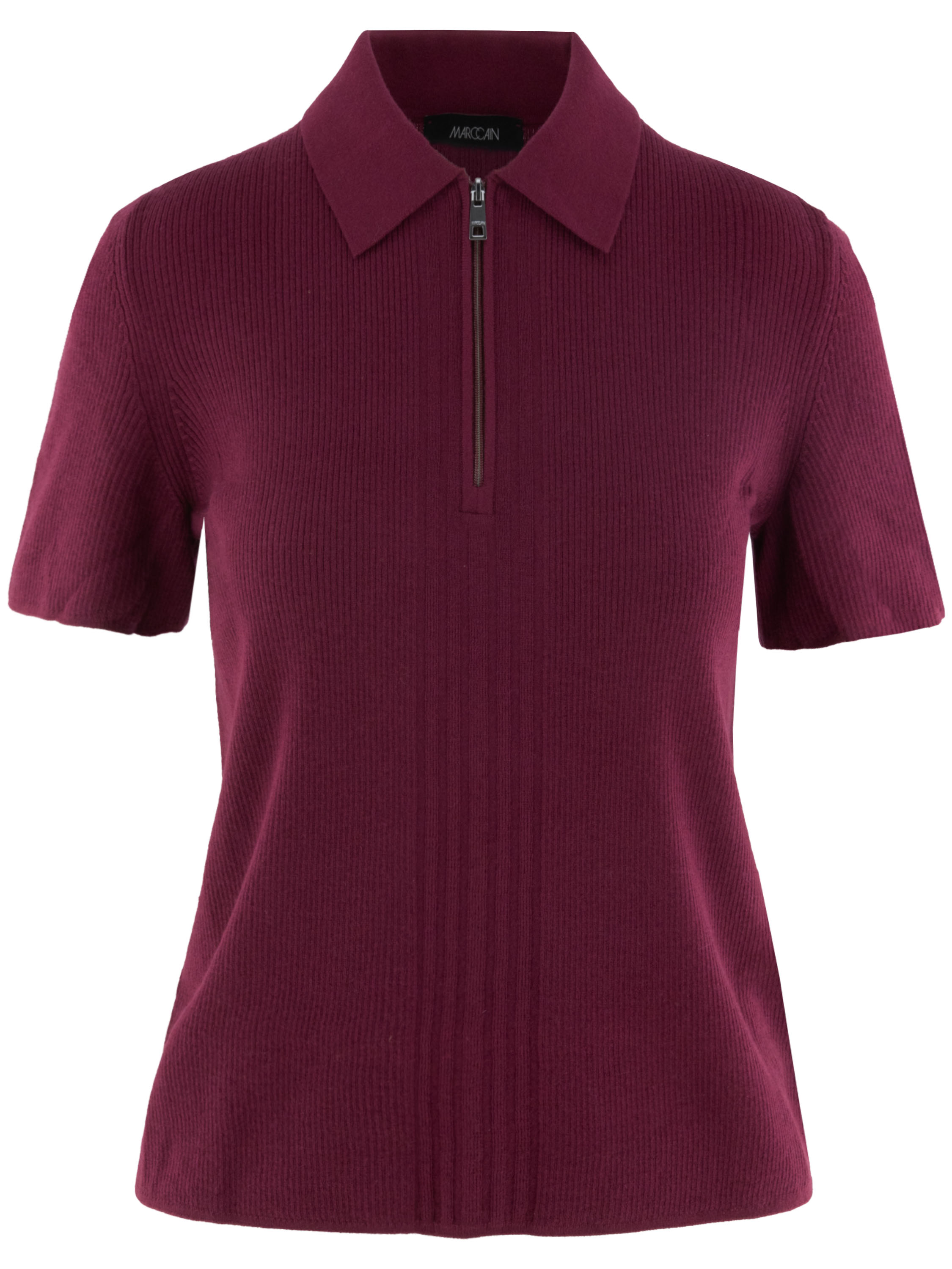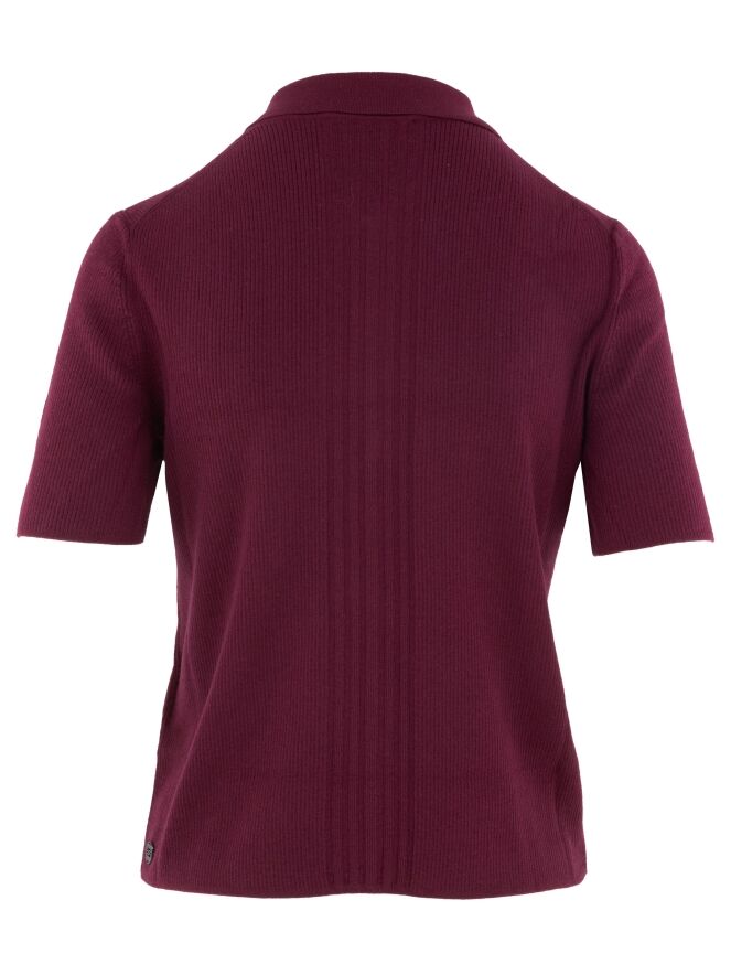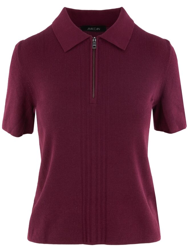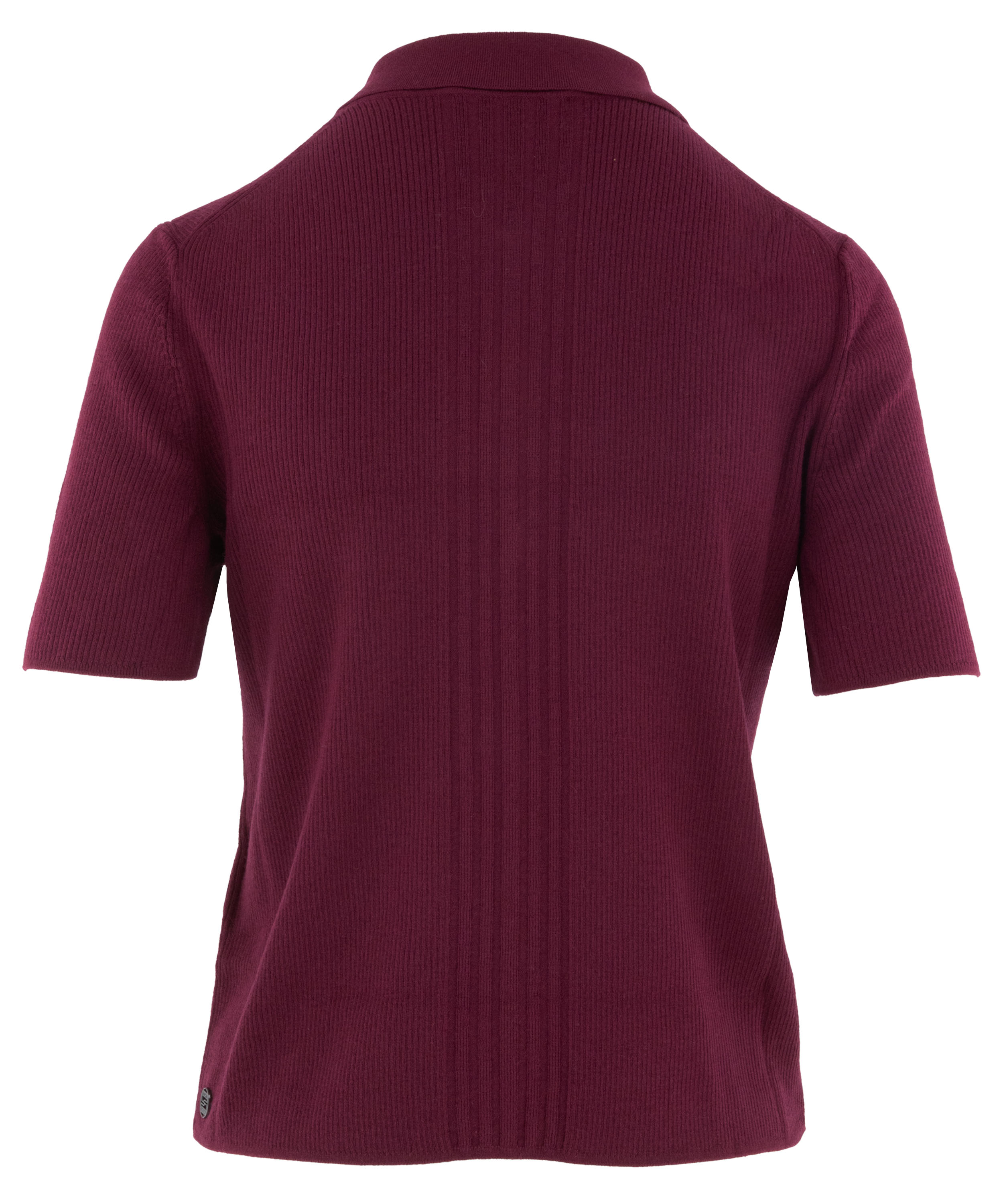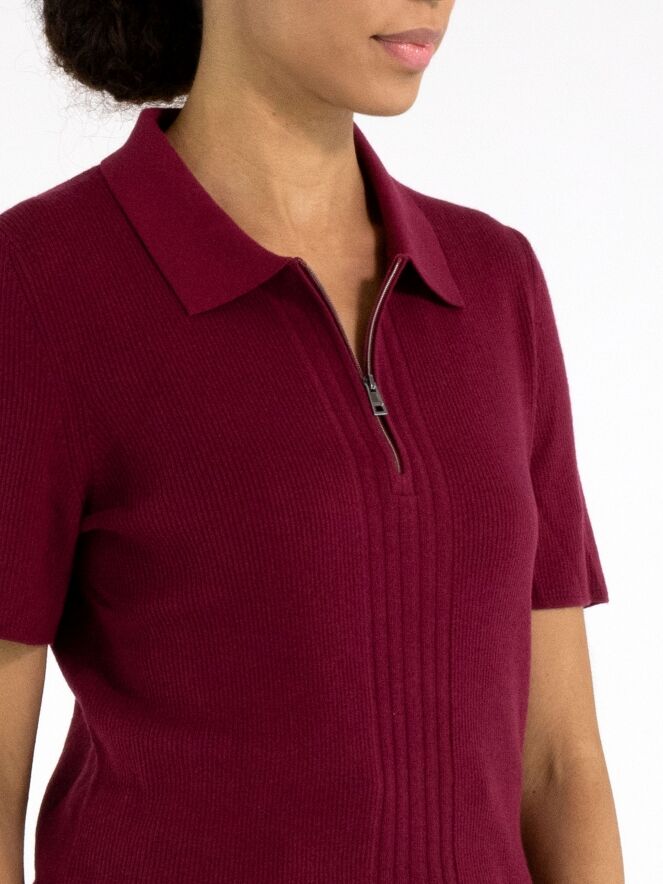 Un polo de Marc Cain en bordeaux. Le tissu est finement côtelé, avec au centre du devant une large bande où les côtes sont plus larges. Le col est en tissu uni et la fermeture éclair part du col pour s’arrêter au-dessus de la poitrine. Ce polo peut être lavé à la main.