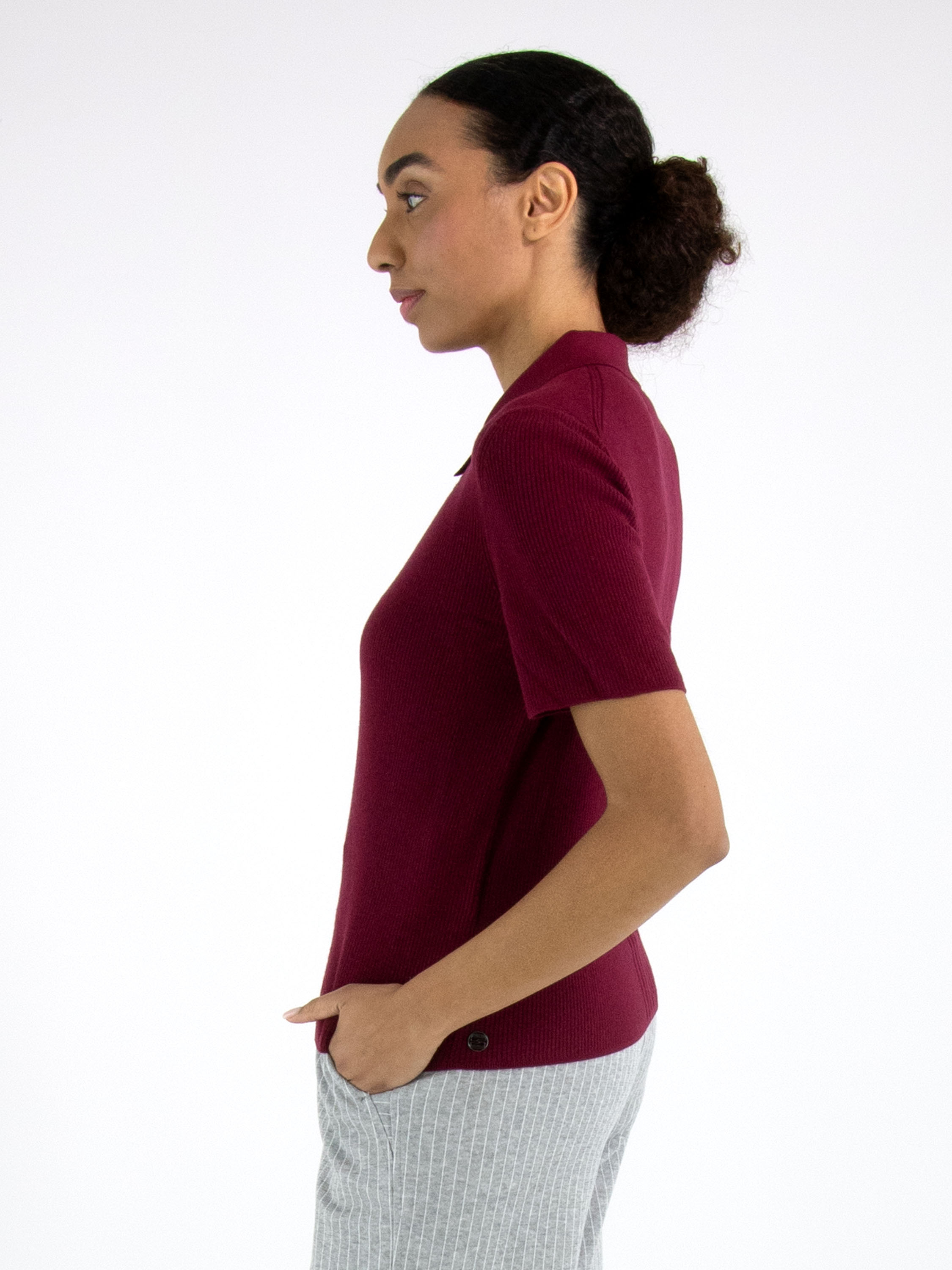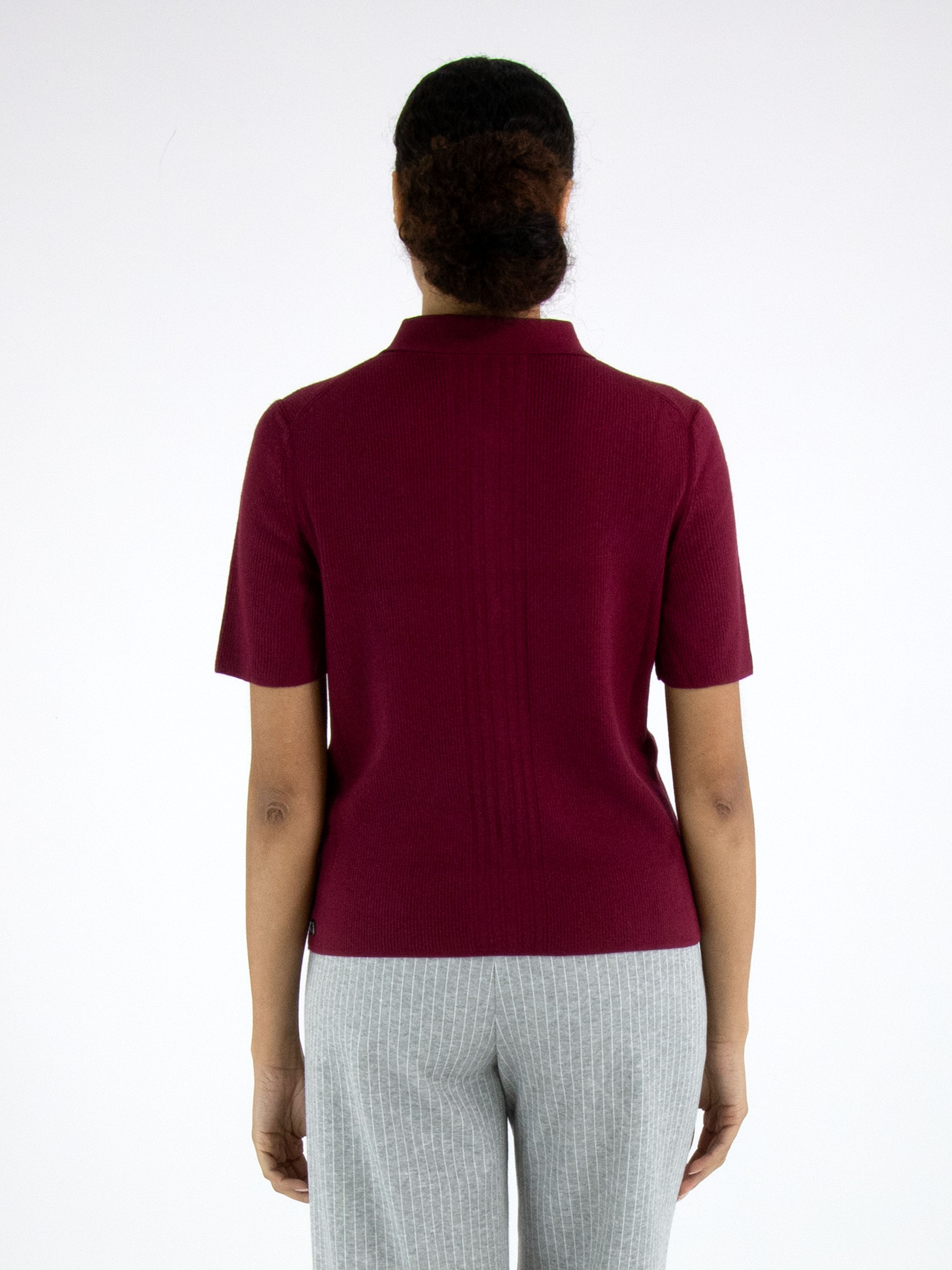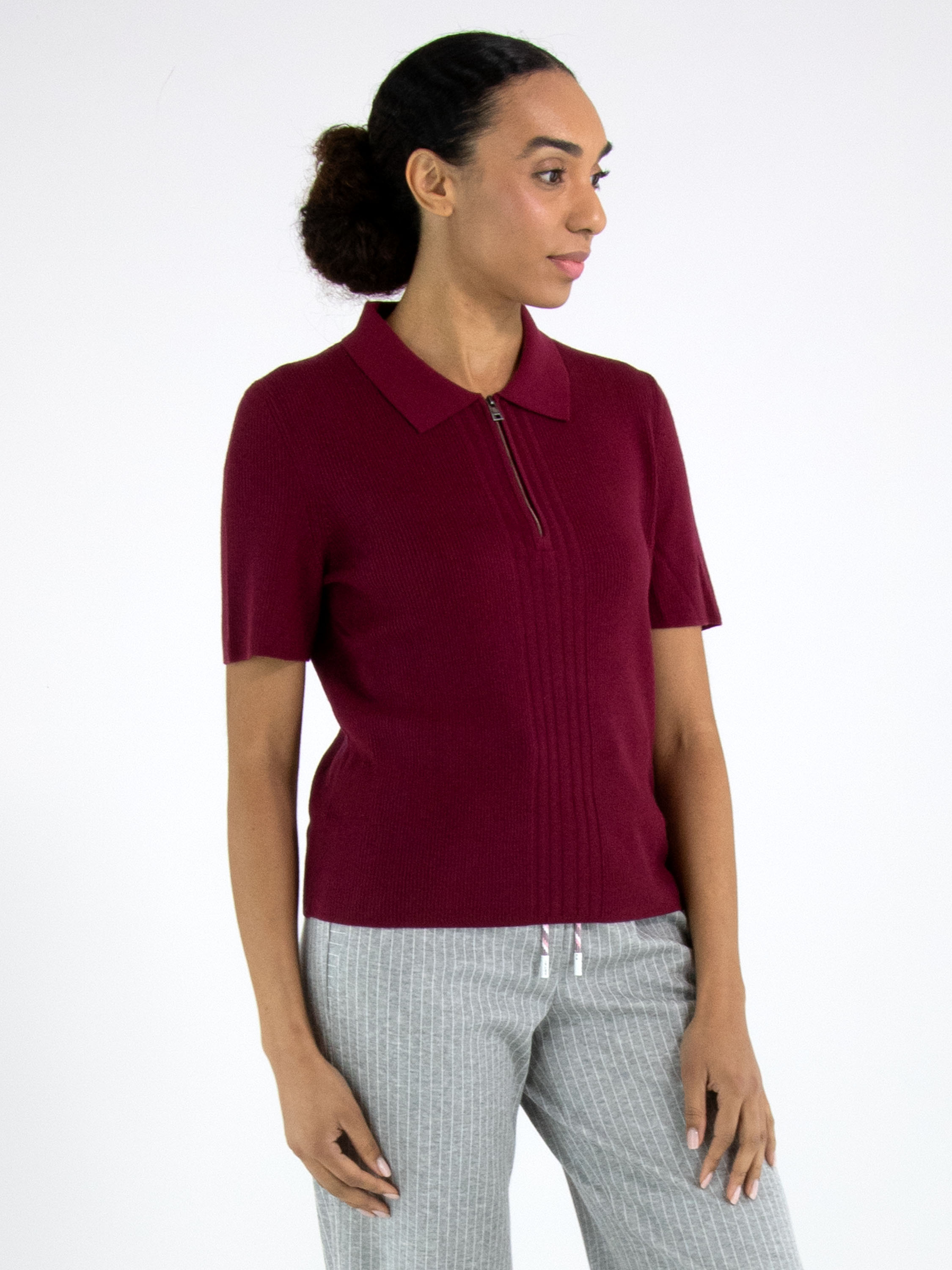 Un polo de Marc Cain en bordeaux. Le tissu est finement côtelé, avec au centre du devant une large bande où les côtes sont plus larges. Le col est en tissu uni et la fermeture éclair part du col pour s’arrêter au-dessus de la poitrine. Ce polo peut être lavé à la main.