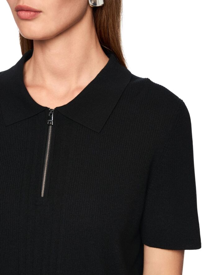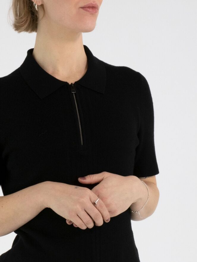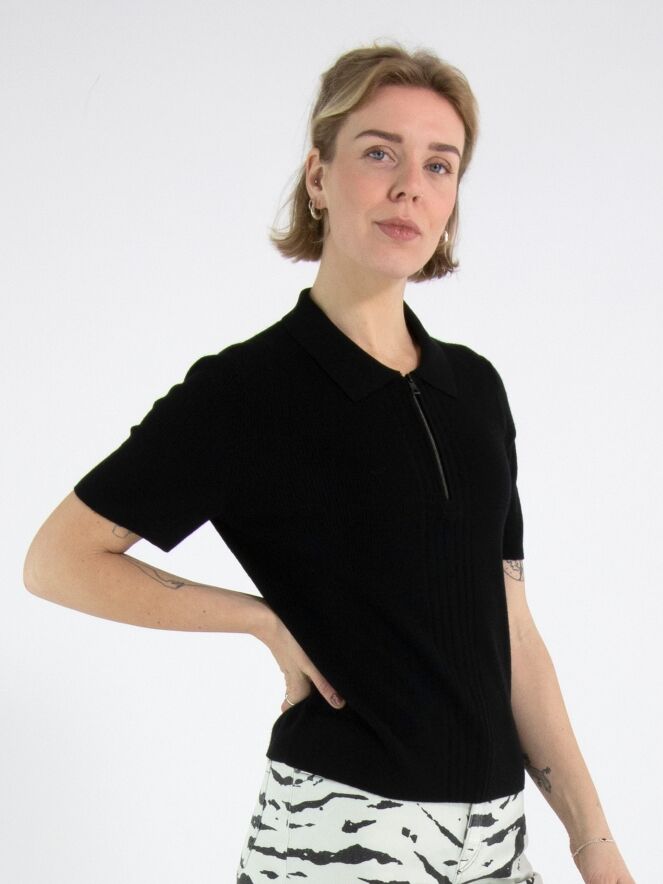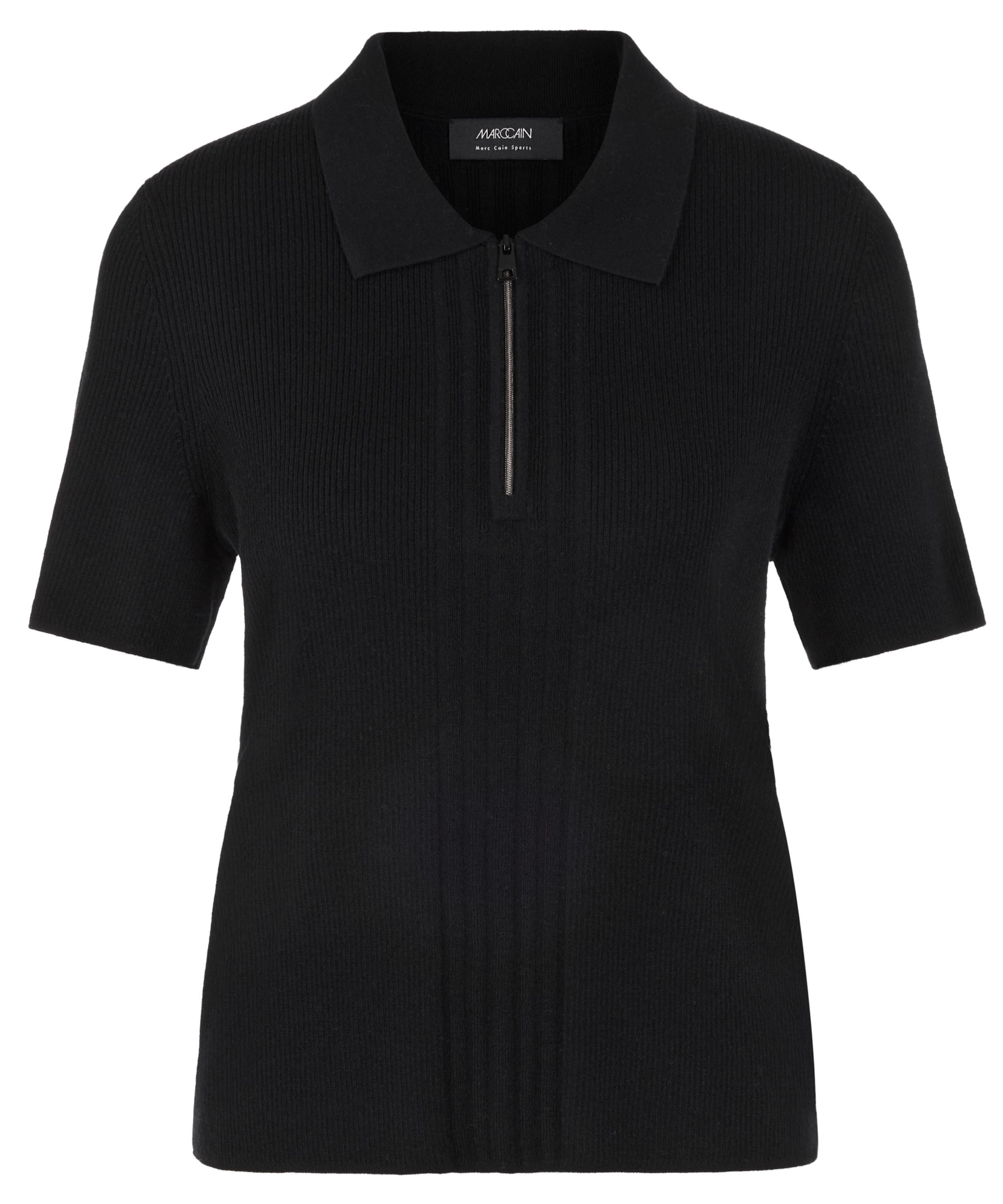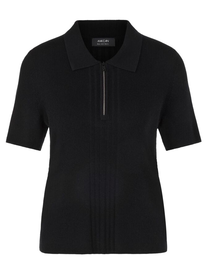 Un polo de Marc Cain en noir. Le tissu est finement côtelé, avec au devant une large bande où la maille est plus large. Le col est en tissu uni et la fermeture éclair partant du col monte jusqu’au-dessus de la poitrine. Ce polo peut être lavé à la main.
