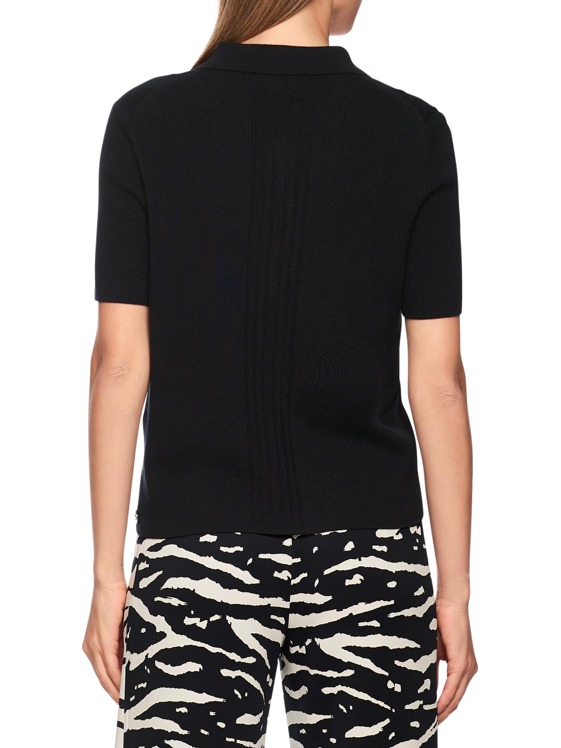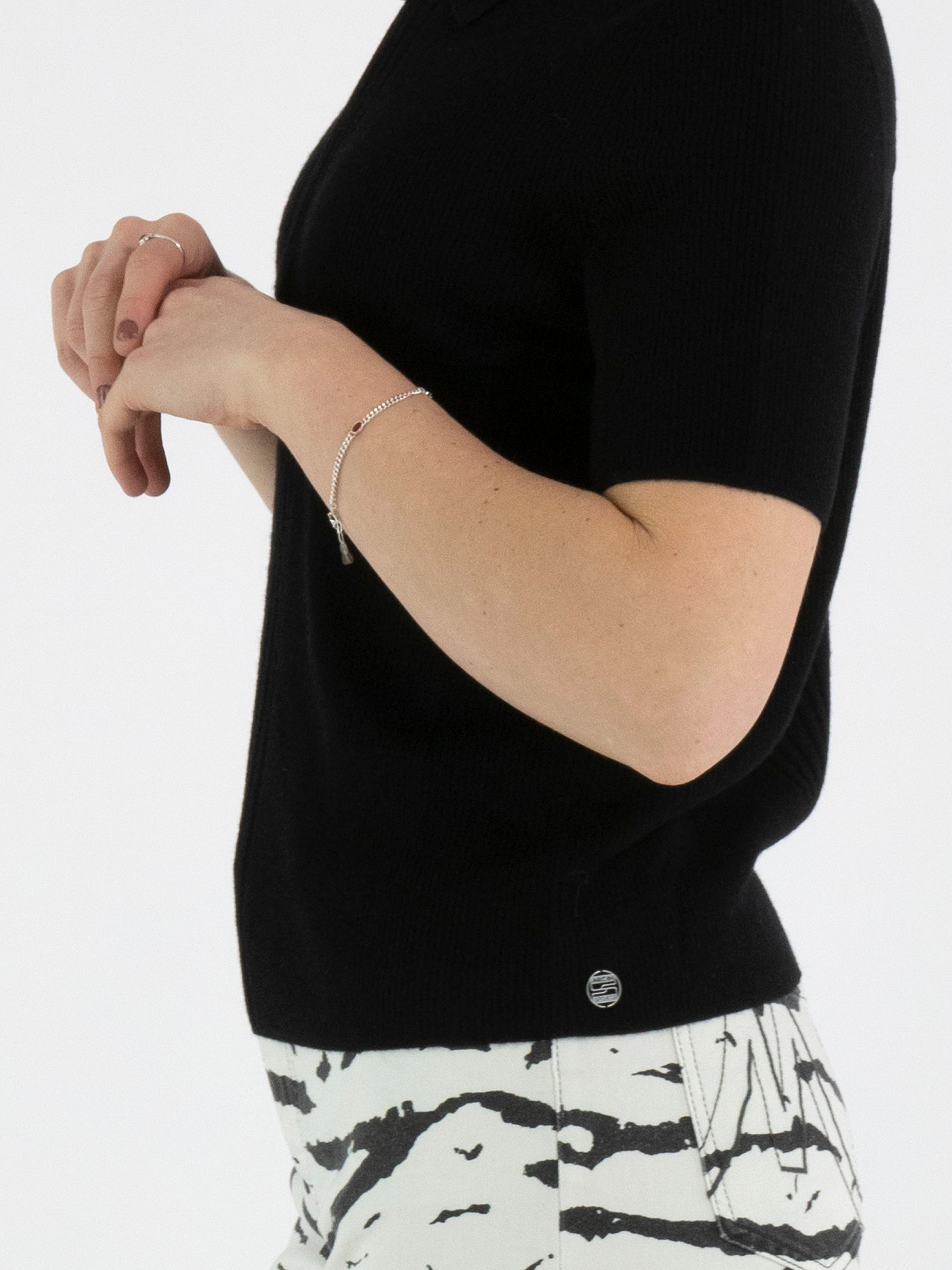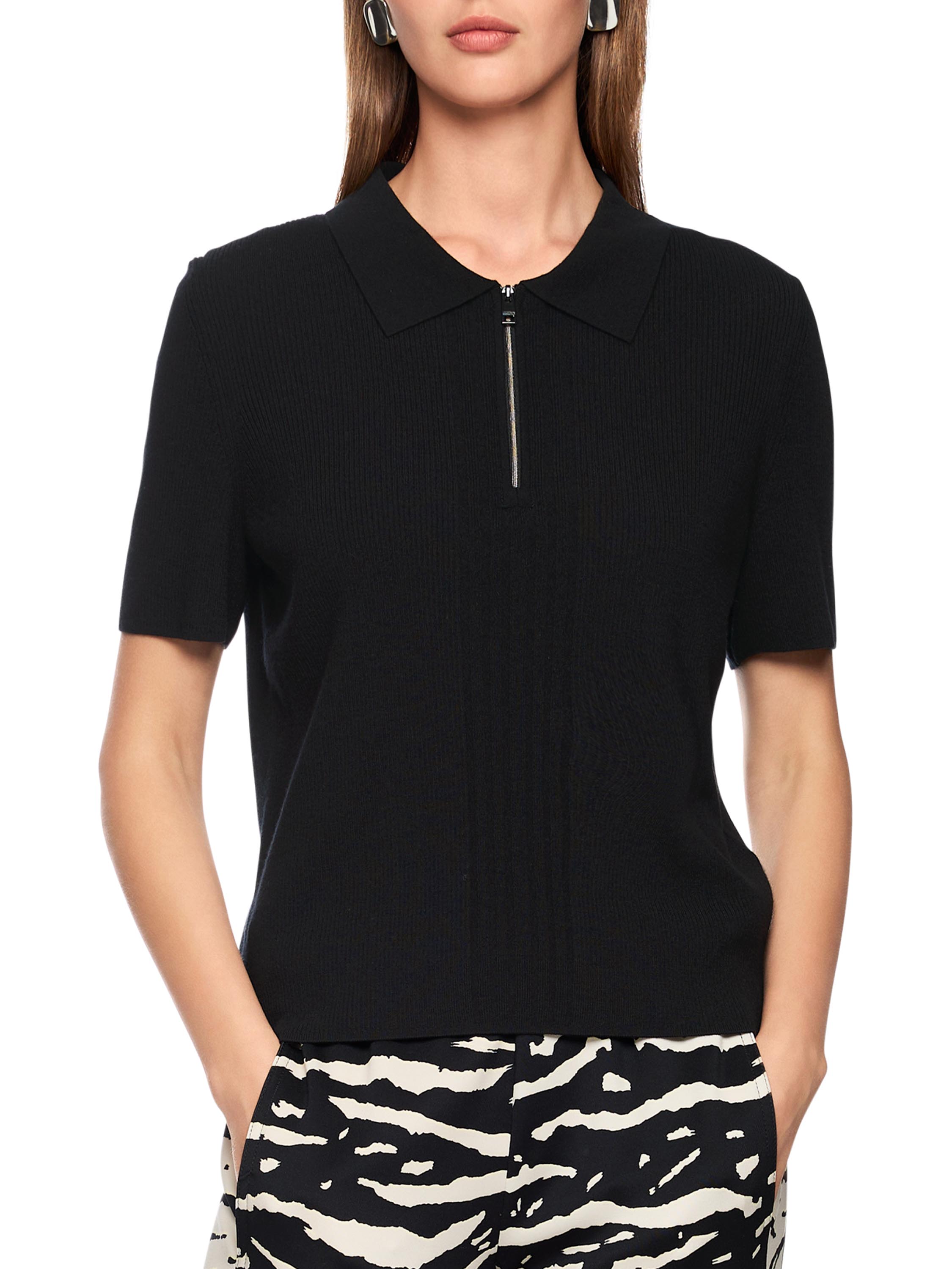 Un polo de Marc Cain en noir. Le tissu est finement côtelé, avec au devant une large bande où la maille est plus large. Le col est en tissu uni et la fermeture éclair partant du col monte jusqu’au-dessus de la poitrine. Ce polo peut être lavé à la main.