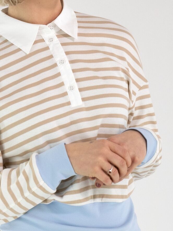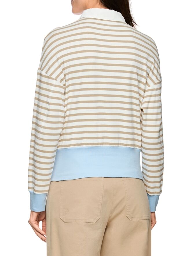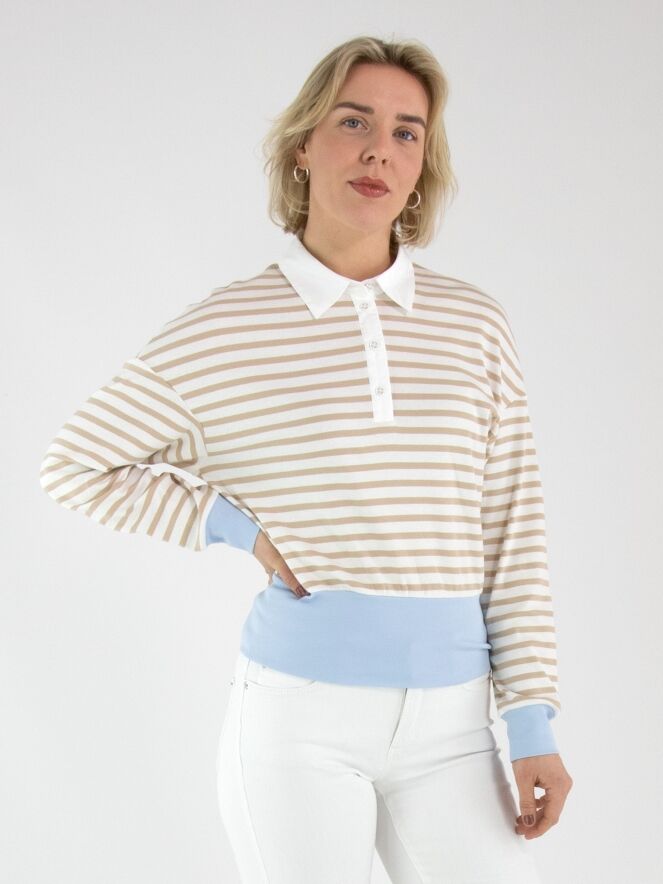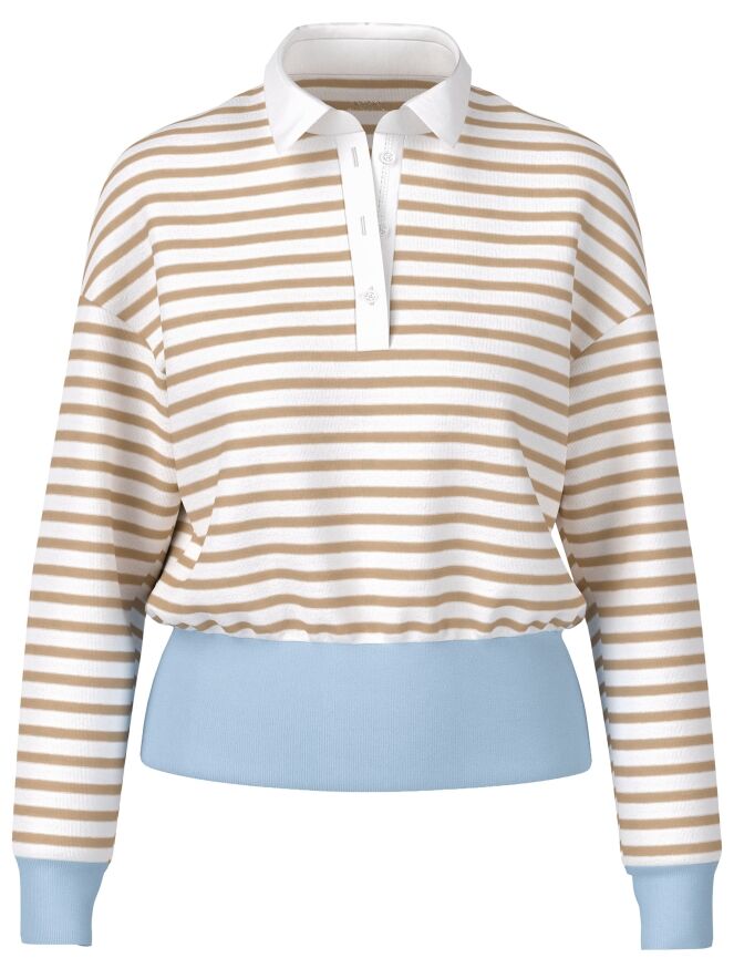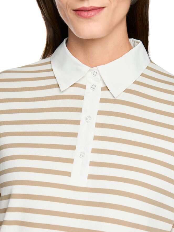 Un polo de Marc Cain avec un motif à rayures dans les tons sable et blanc crème. Le bas et les extrémités des manches longues sont soulignés par une large bordure en tricot finement côtelé de couleur bleue. Le col est réalisé dans un tissu uni blanc crème. Ce polo peut être lavé à 30 degrés.