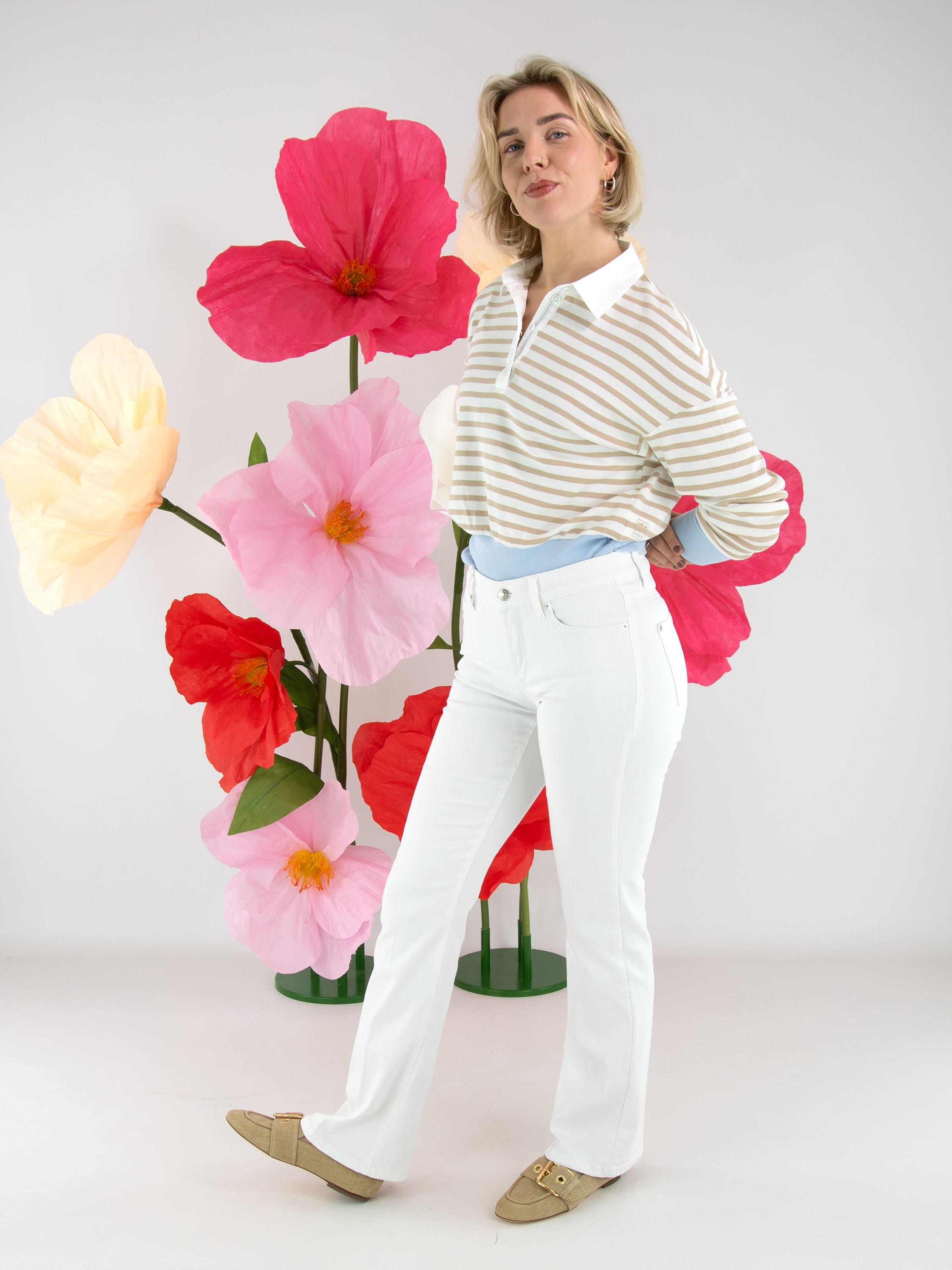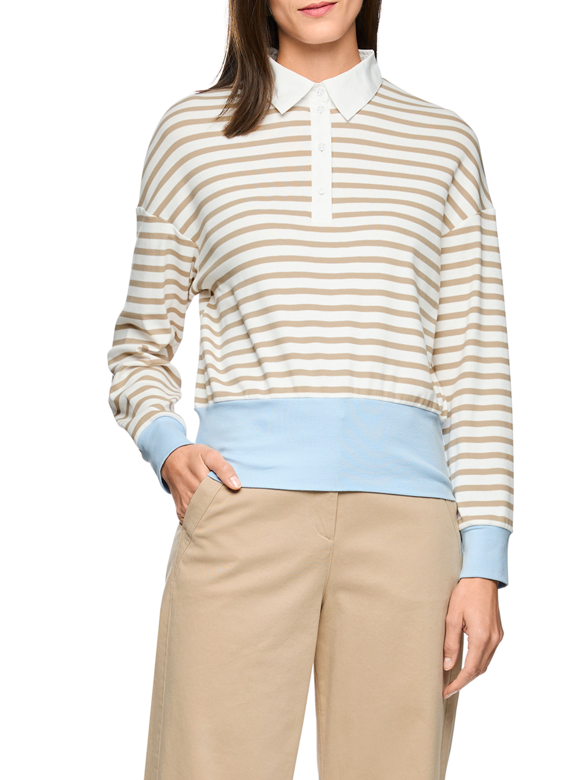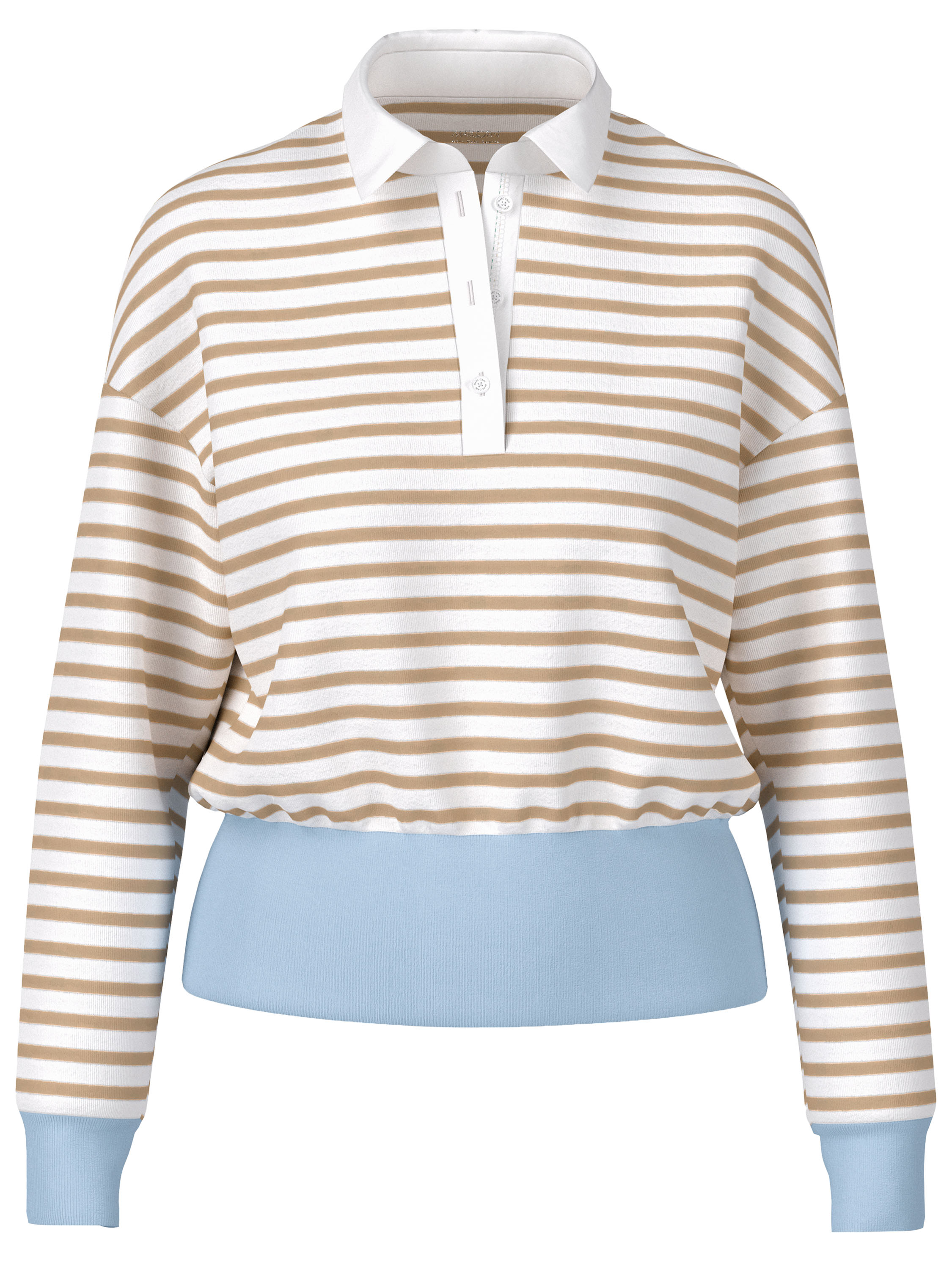 Un polo de Marc Cain avec un motif à rayures dans les tons sable et blanc crème. Le bas et les extrémités des manches longues sont soulignés par une large bordure en tricot finement côtelé de couleur bleue. Le col est réalisé dans un tissu uni blanc crème. Ce polo peut être lavé à 30 degrés.
