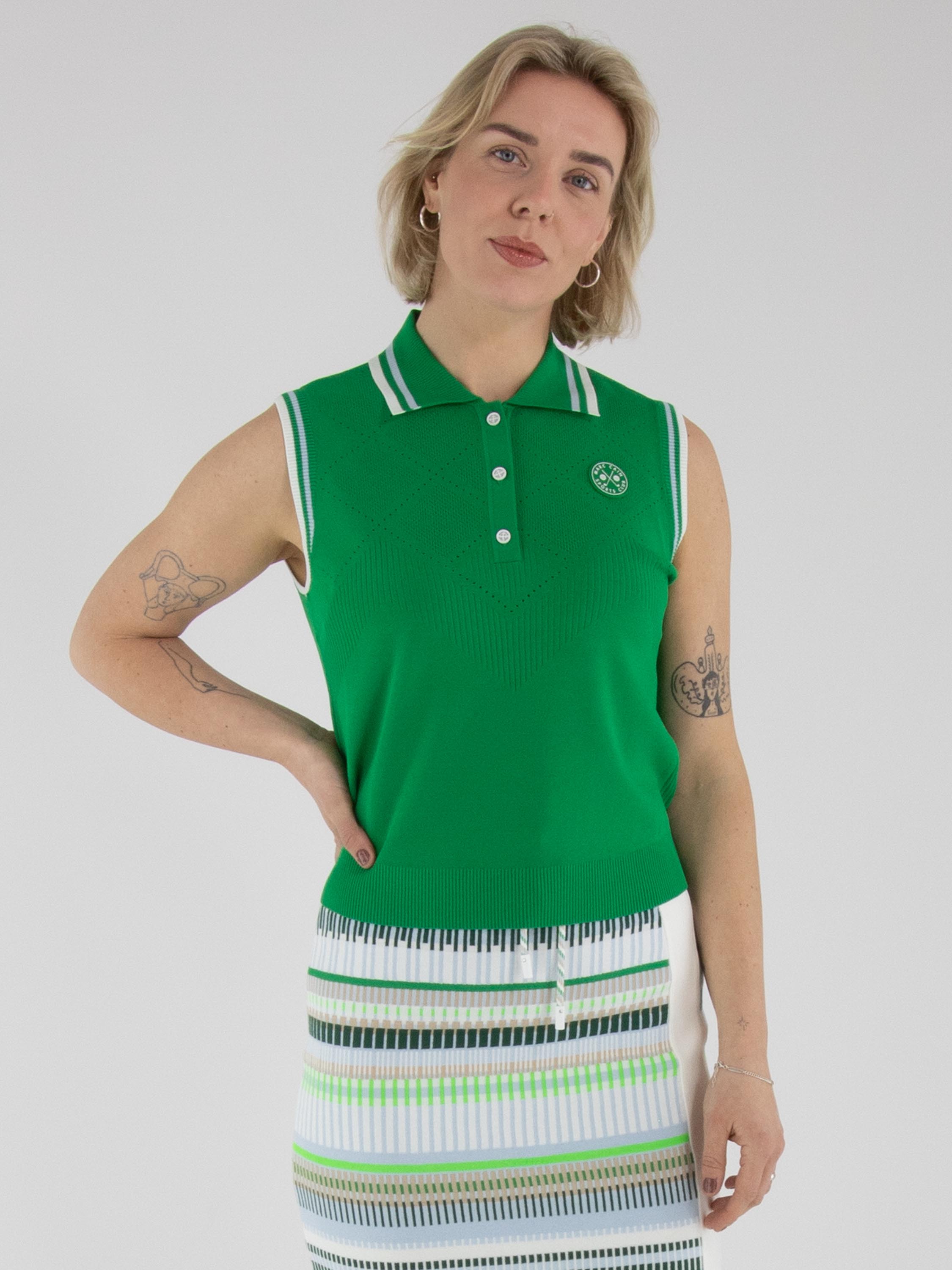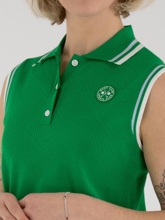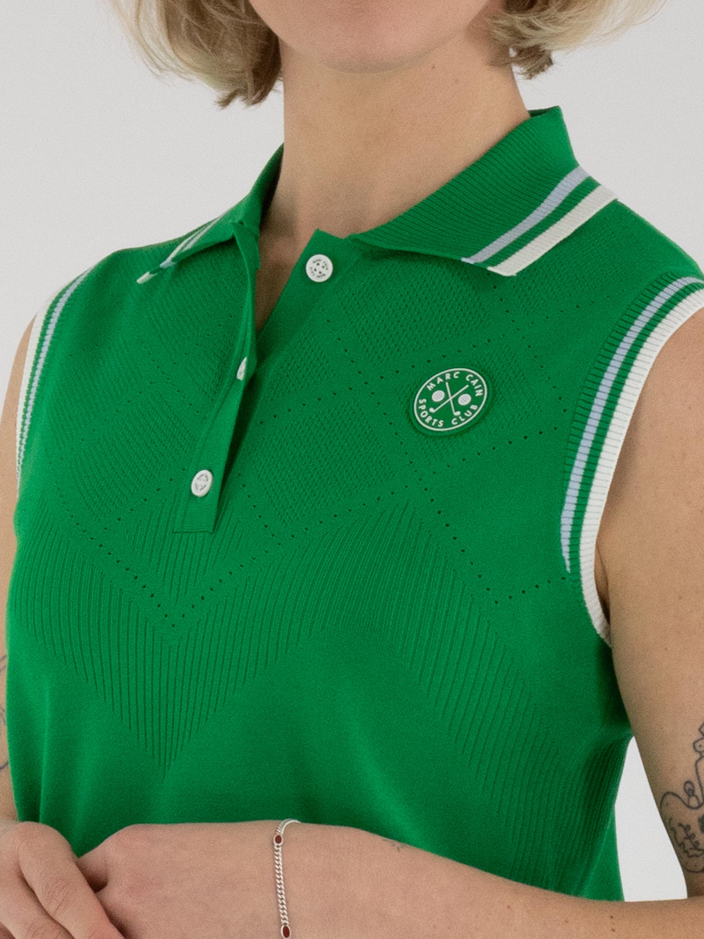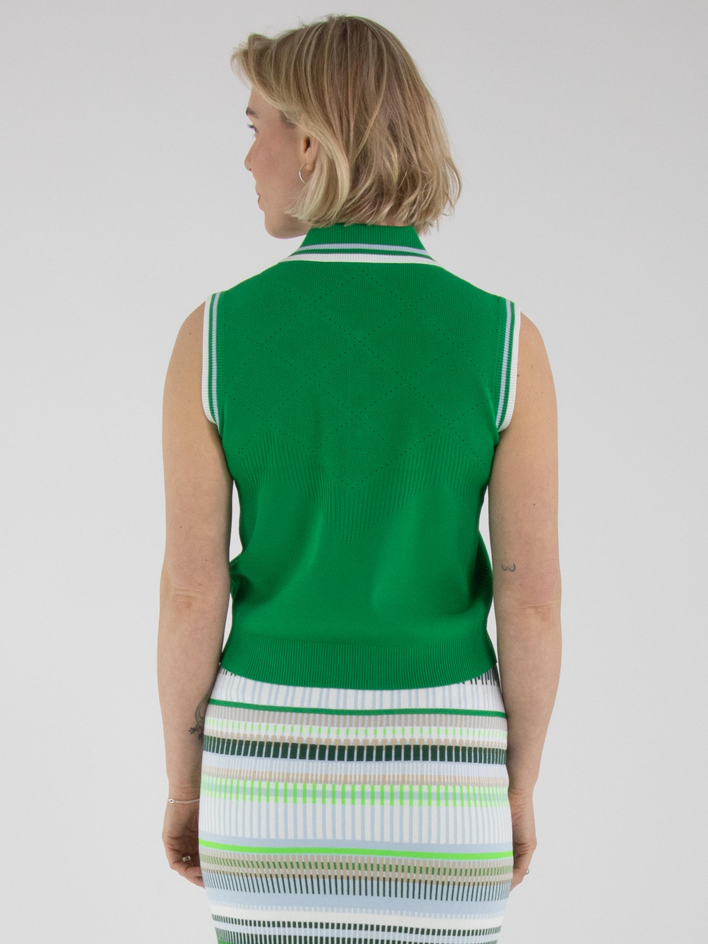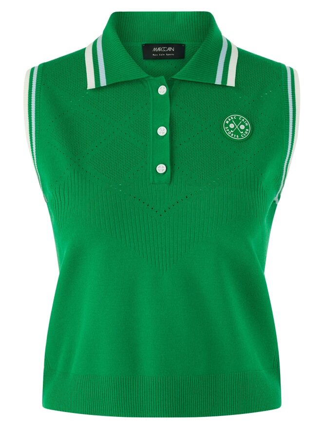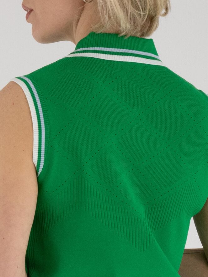 Un top de Marc Cain en vert. Le col et le bord des emmanchures sont réalisés en tricot finement côtelé avec un motif à rayures dans les tons bleu, blanc crème et vert. Des épaules jusqu’au-dessous de la poitrine, le tissu présente un motif ajouré en losanges finement perforé. Ce top peut être lavé à la main.