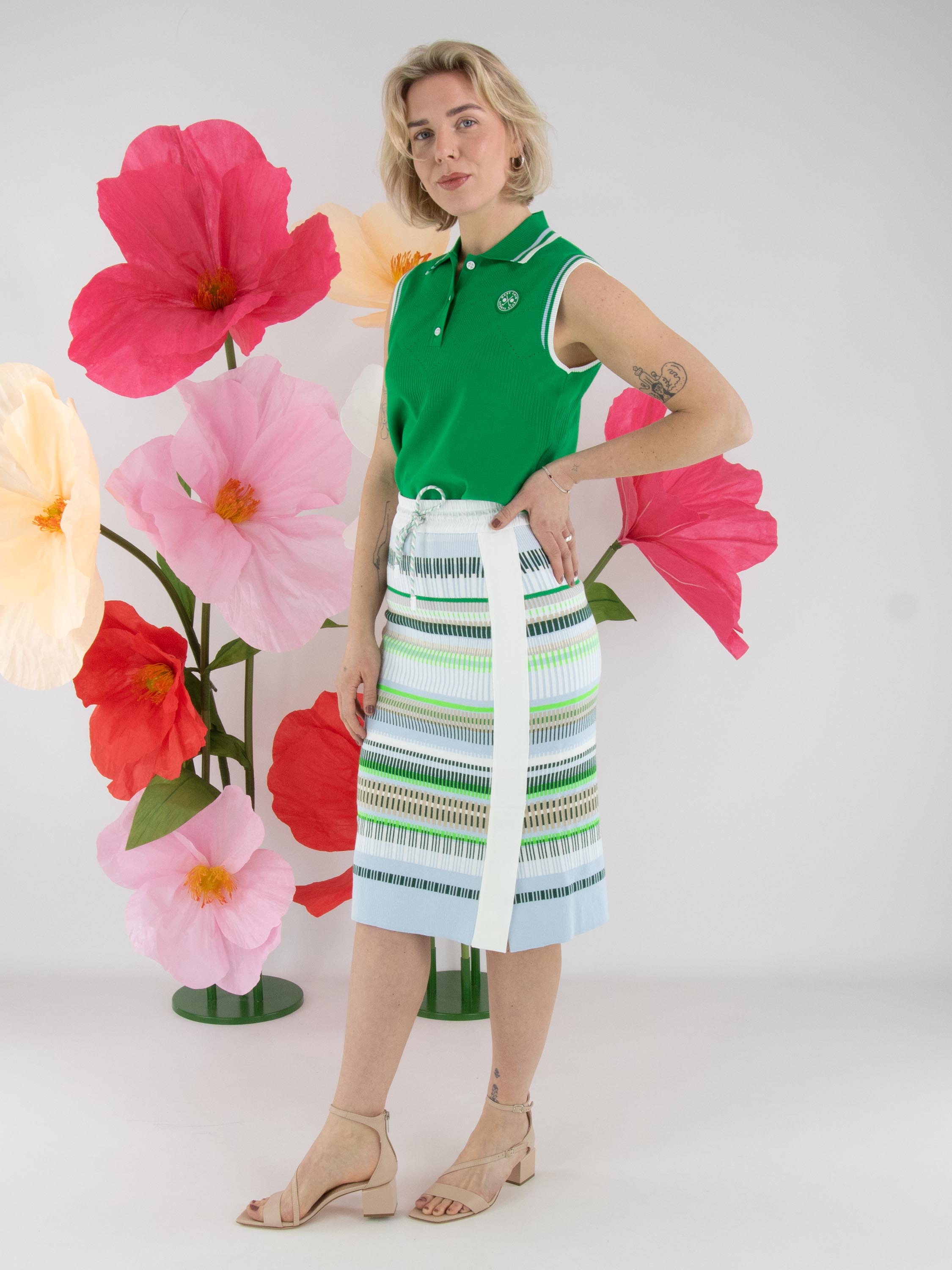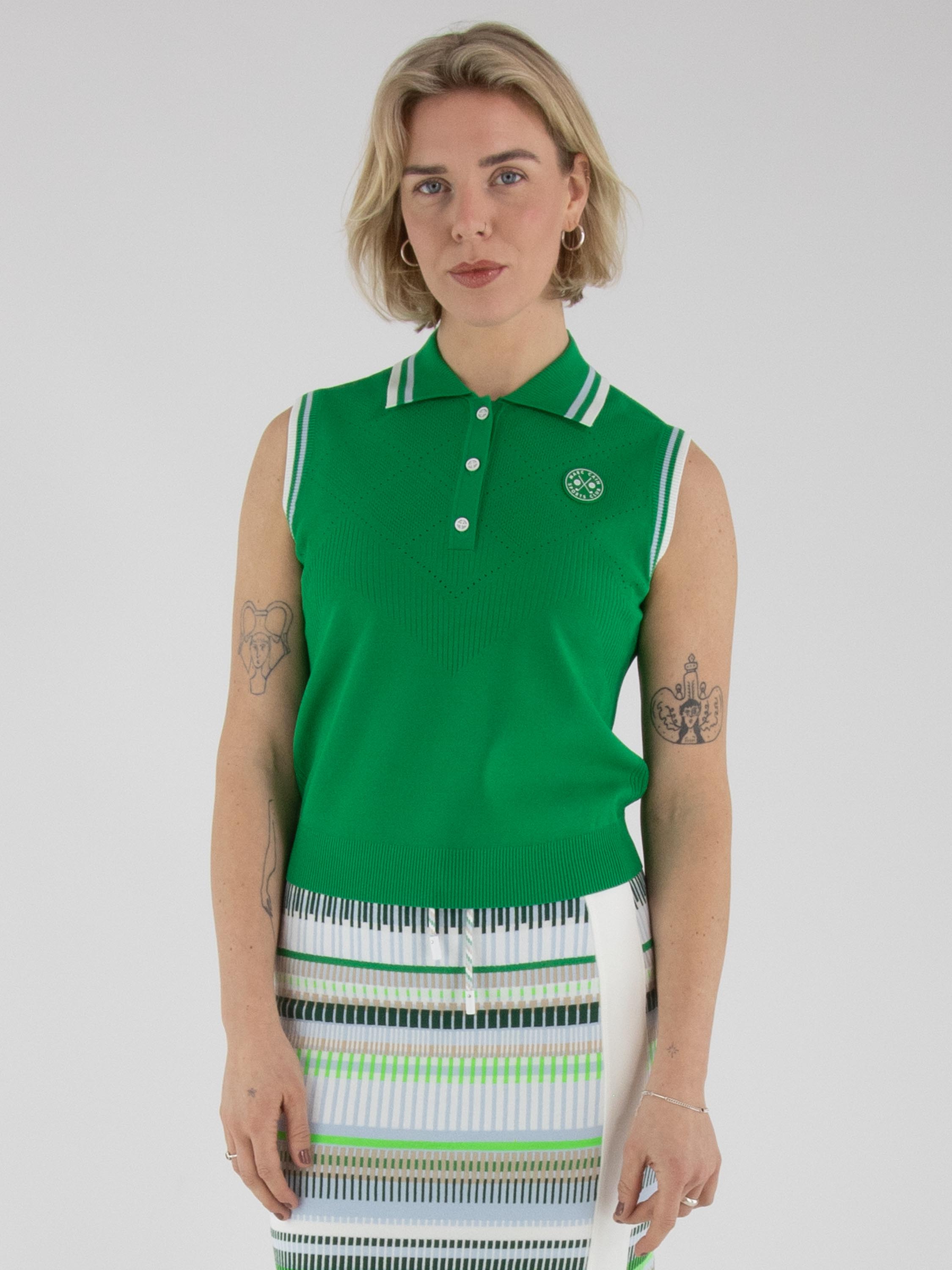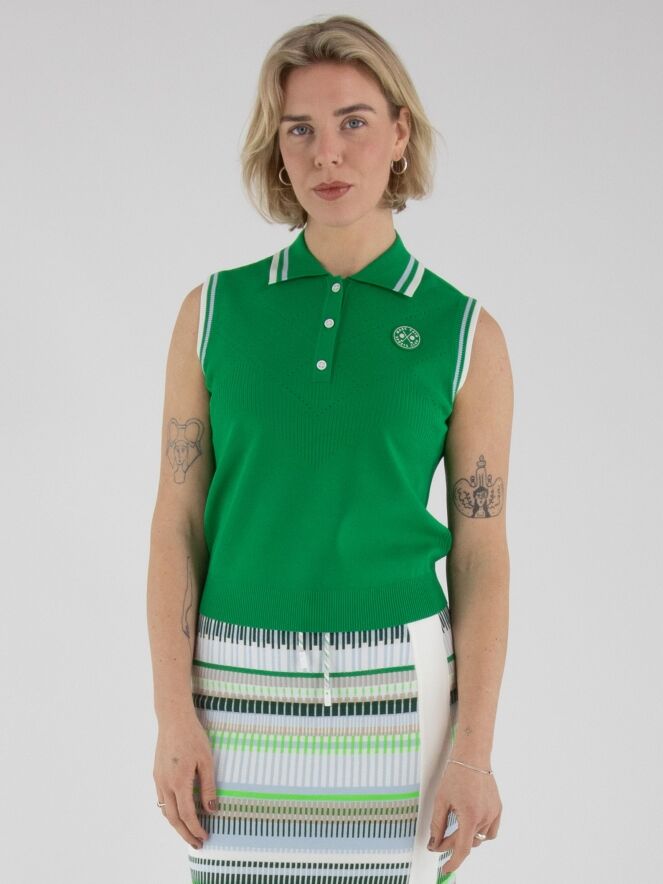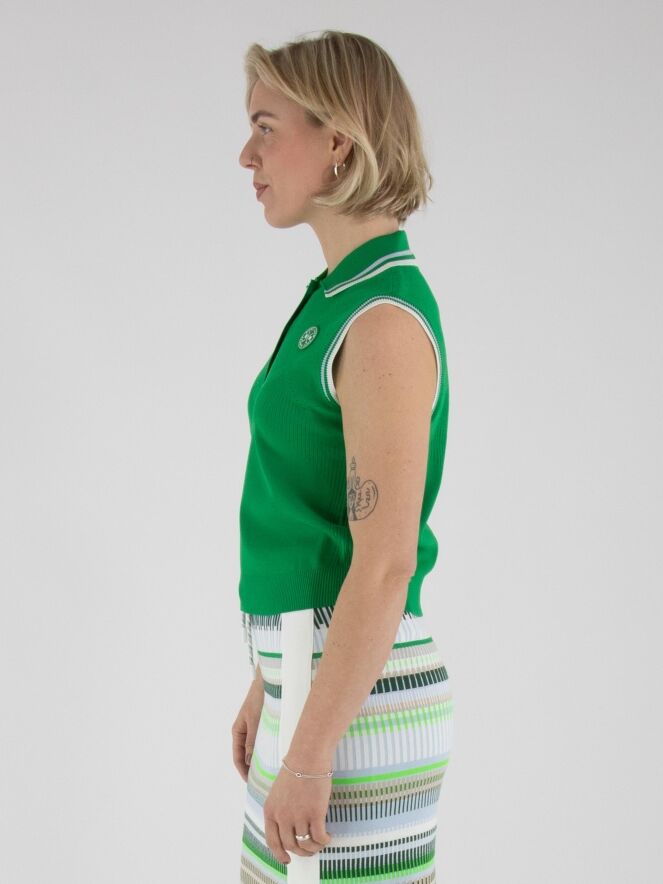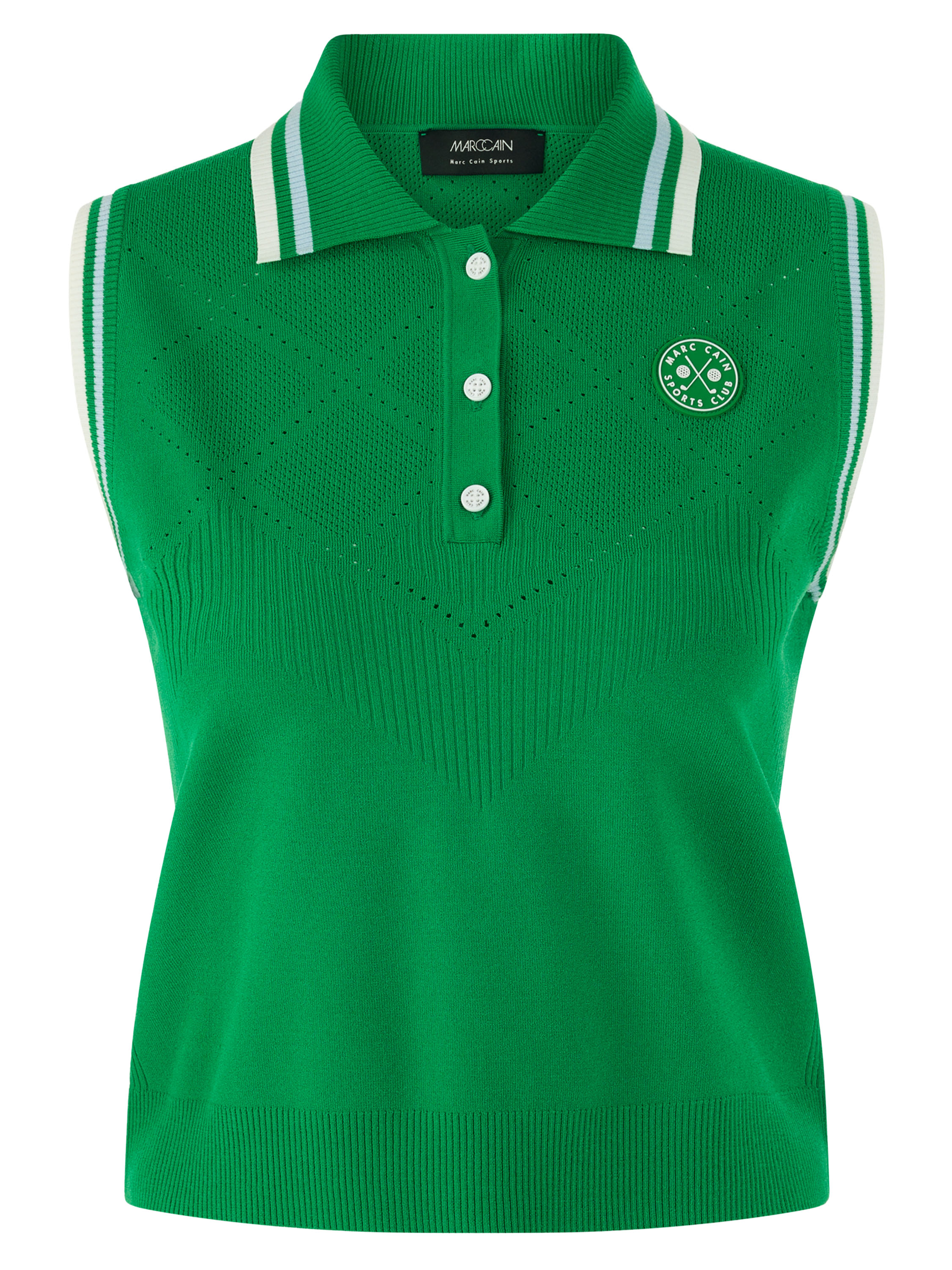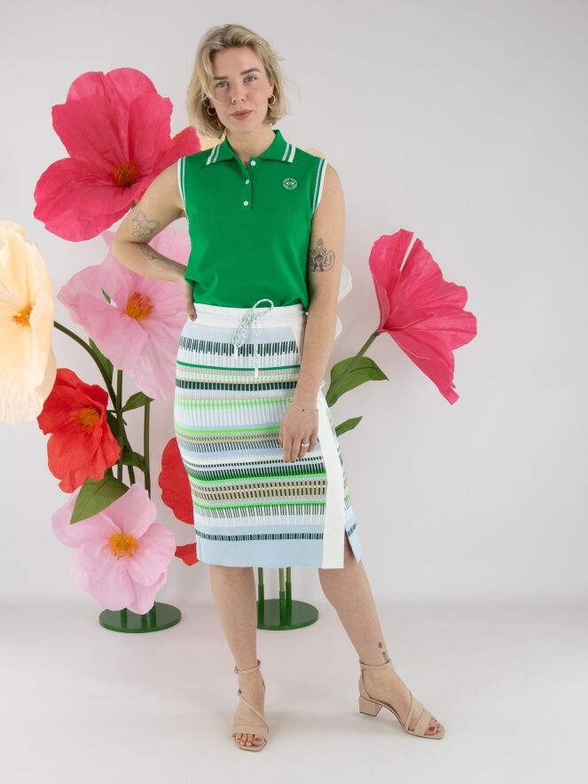 Un top de Marc Cain en vert. Le col et le bord des emmanchures sont réalisés en tricot finement côtelé avec un motif à rayures dans les tons bleu, blanc crème et vert. Des épaules jusqu’au-dessous de la poitrine, le tissu présente un motif ajouré en losanges finement perforé. Ce top peut être lavé à la main.