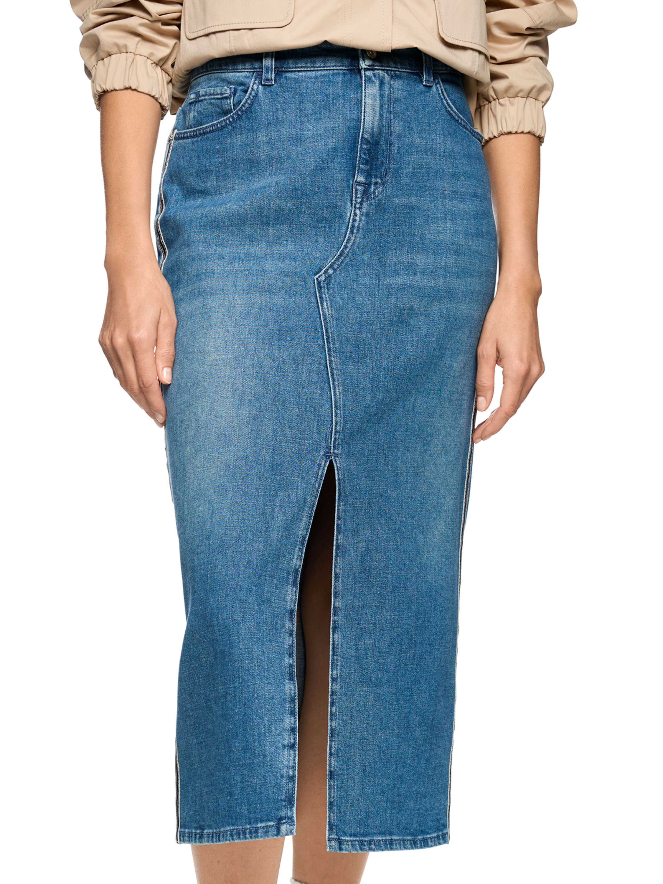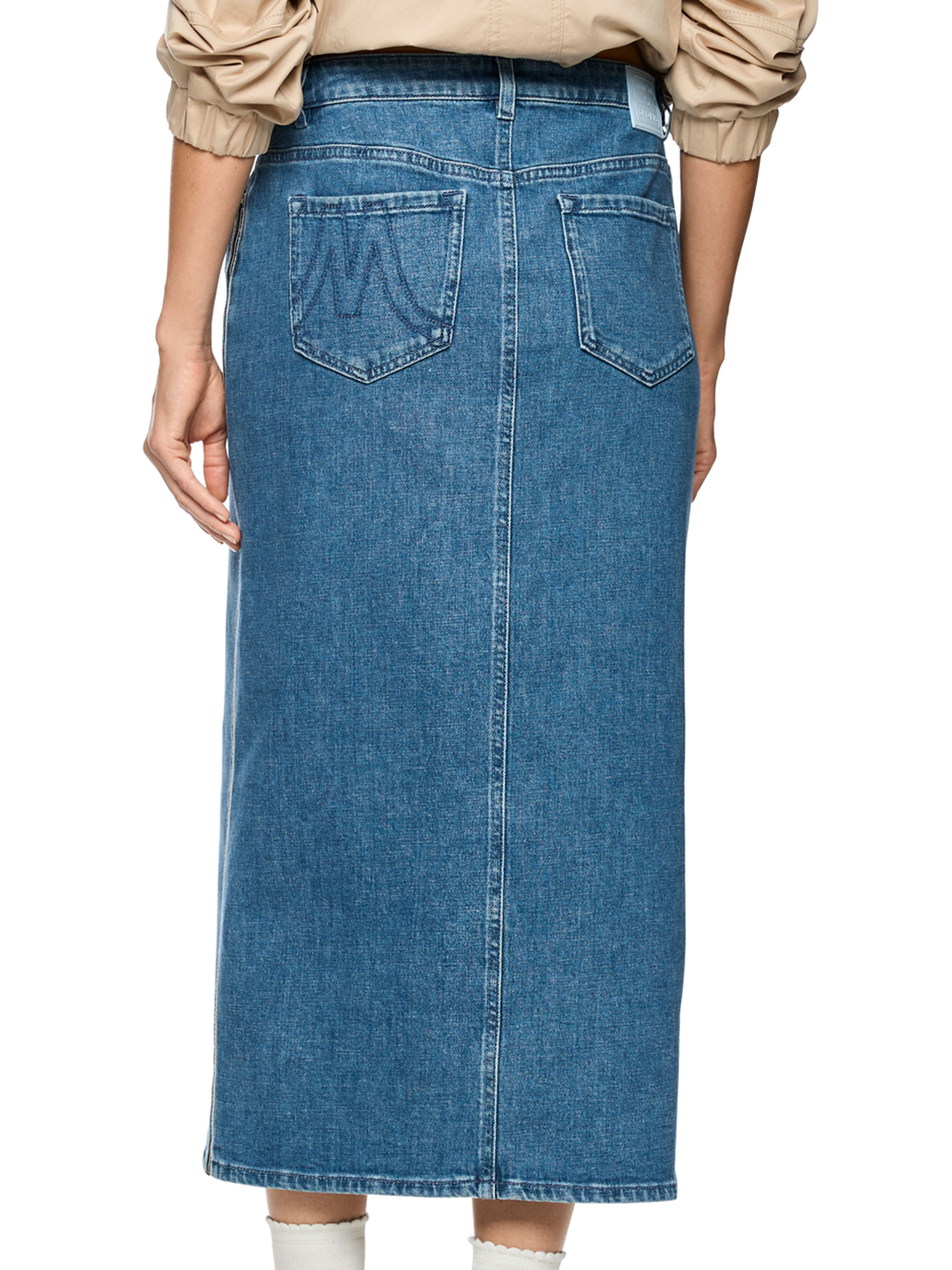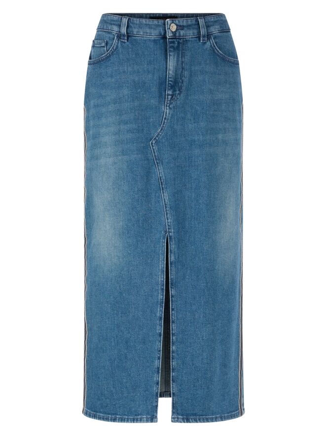Une jupe de Marc Cain dans une teinte denim classique. Une fente est placée au centre devant jusqu’à juste en dessous du genou. De chaque côté, une large bande à motif rayé dans les tons beige et denim foncé est appliquée. Cette jupe peut être lavée à 30 degrés.