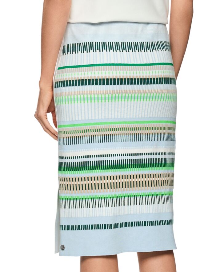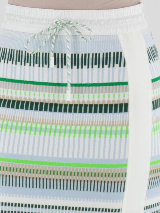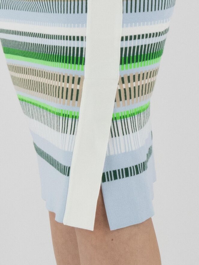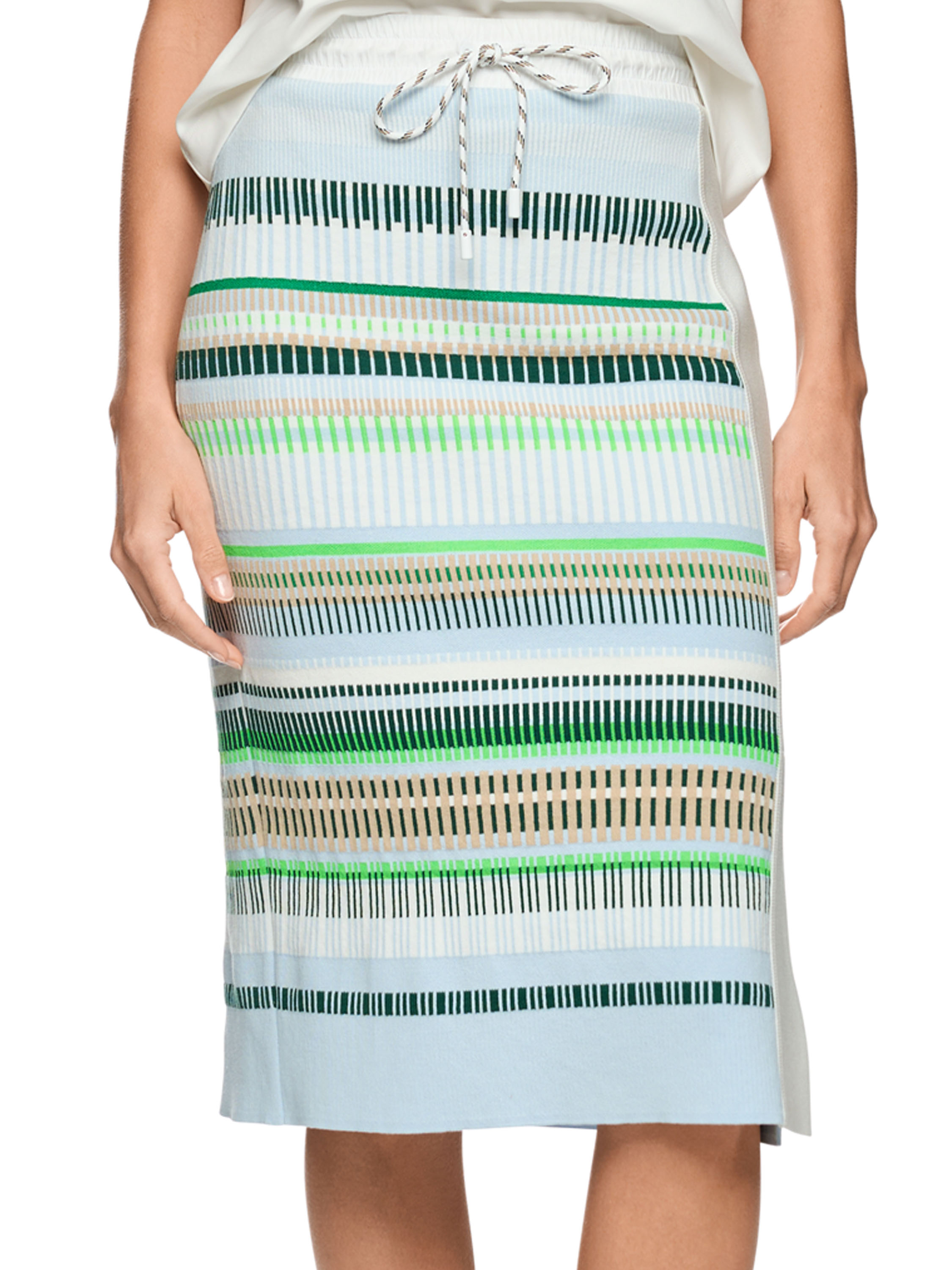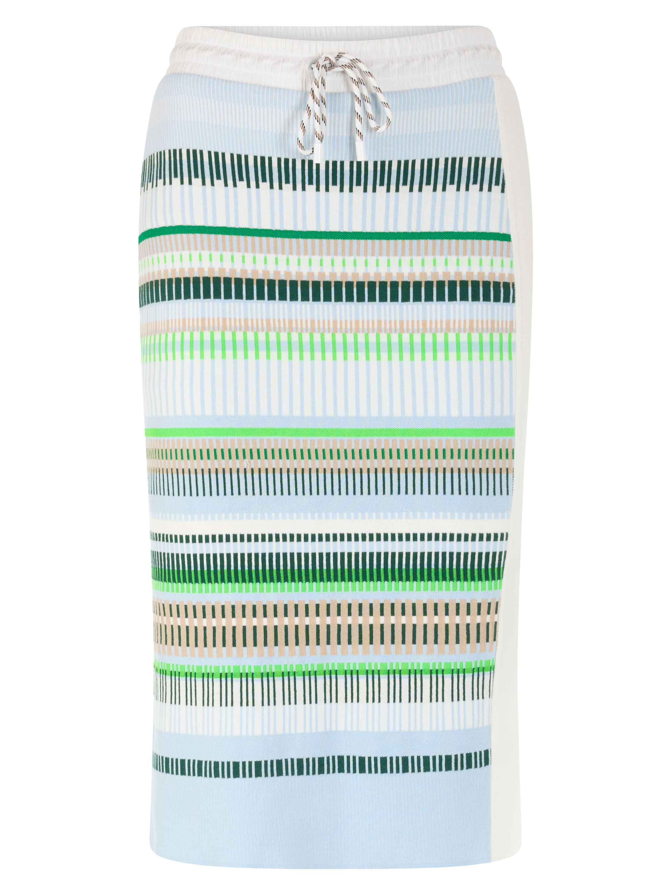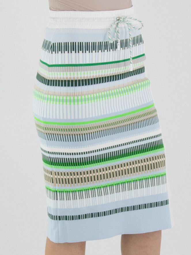 Une jupe de Marc Cain avec un motif à rayures dans les tons bleu, sable, vert clair et foncé et blanc. La taille est dotée d’une ceinture élastique blanche en tissu parachute avec un cordon inséré dans un tunnel. Sur le devant, côté gauche, une large bande verticale blanc crème est appliquée, avec une fente à partir du genou. La jupe est doublée et peut être lavée à 30 degrés.