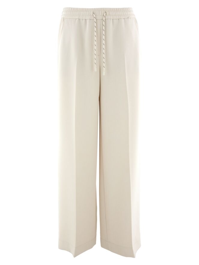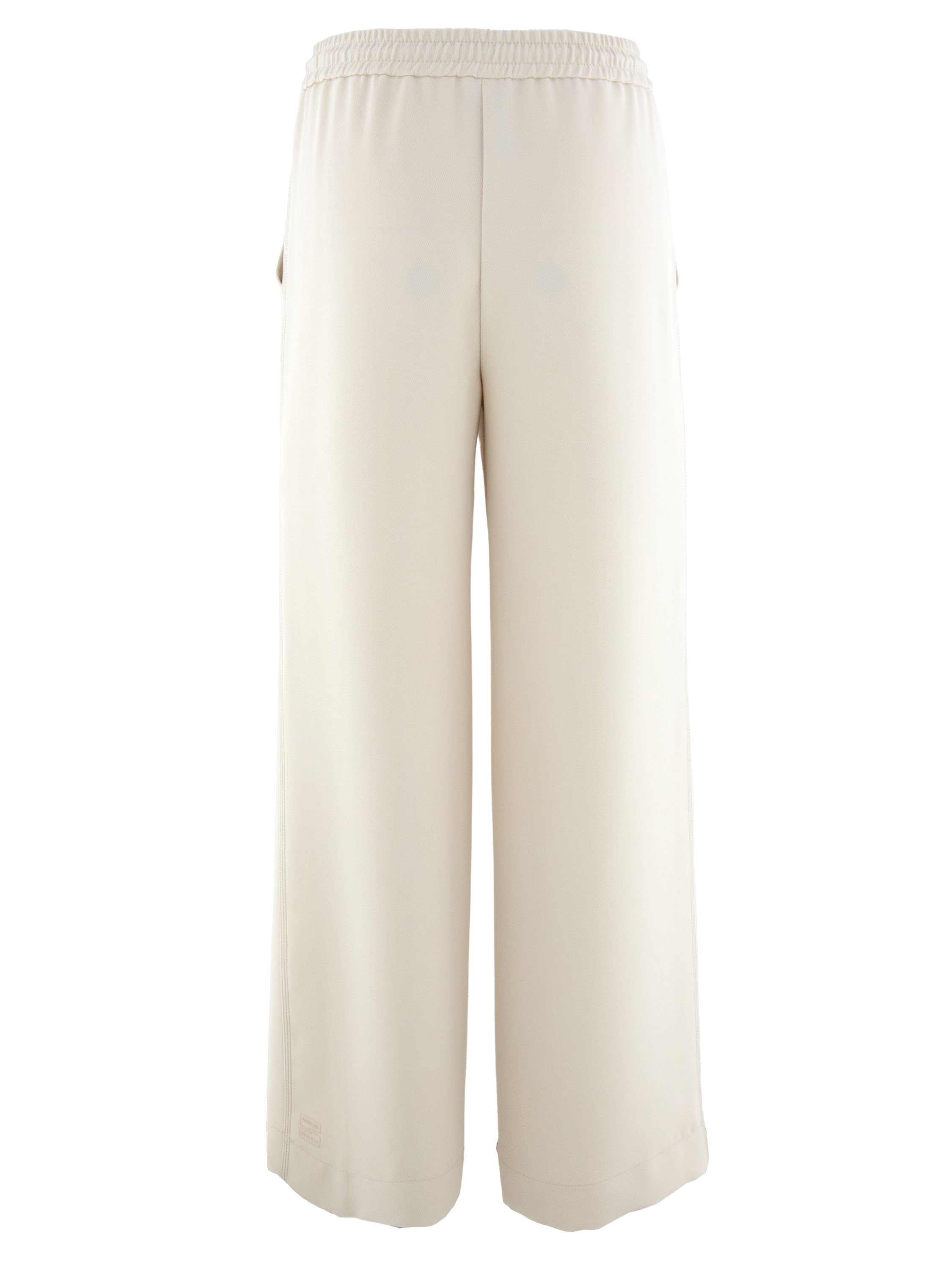 Un pantalon de jogging de Marc Cain en couleur nude. La taille comporte une bande élastique finement plissée avec un cordon dans une coulisse. Une pliure repassée descend au centre des jambes à coupe droite. Le pantalon possède des poches fendues, et le long des côtés se trouve un galon avec trois lignes de surpiqûres couleur sable. Ce pantalon peut être lavé à 30 degrés.