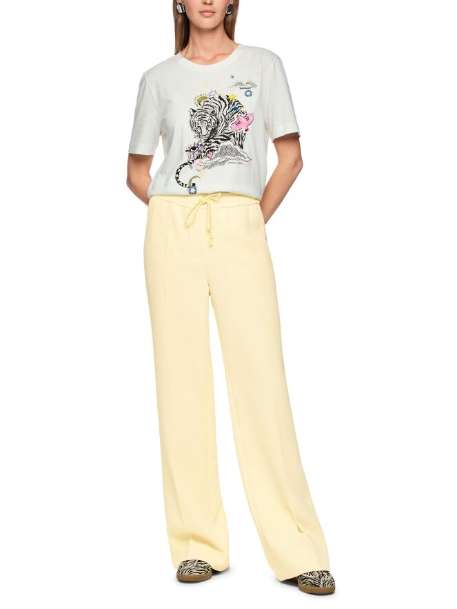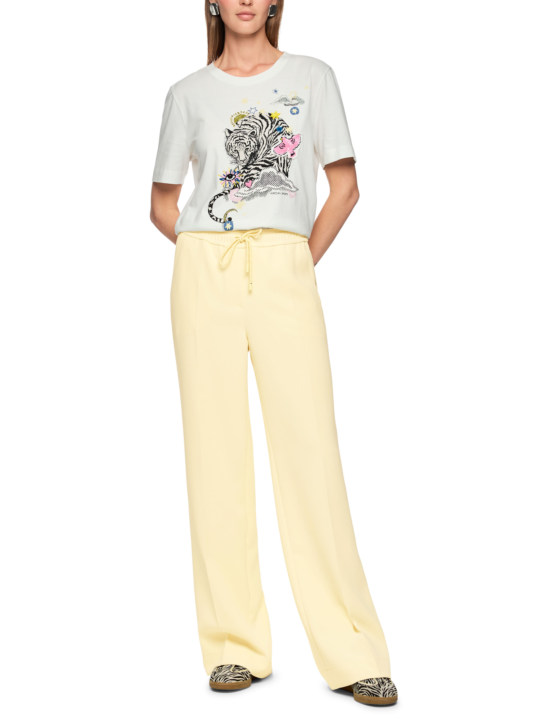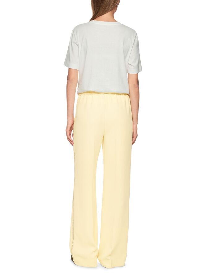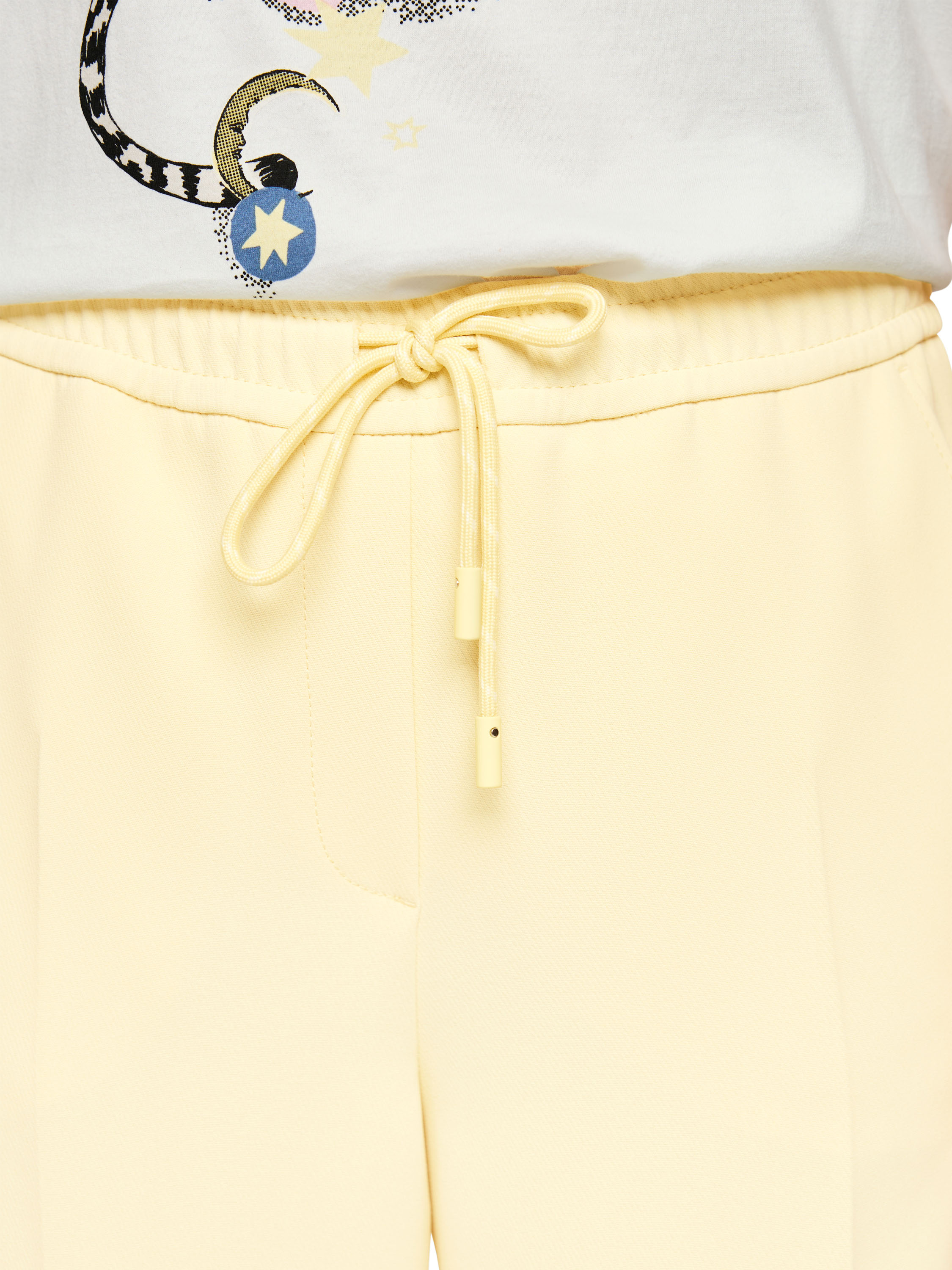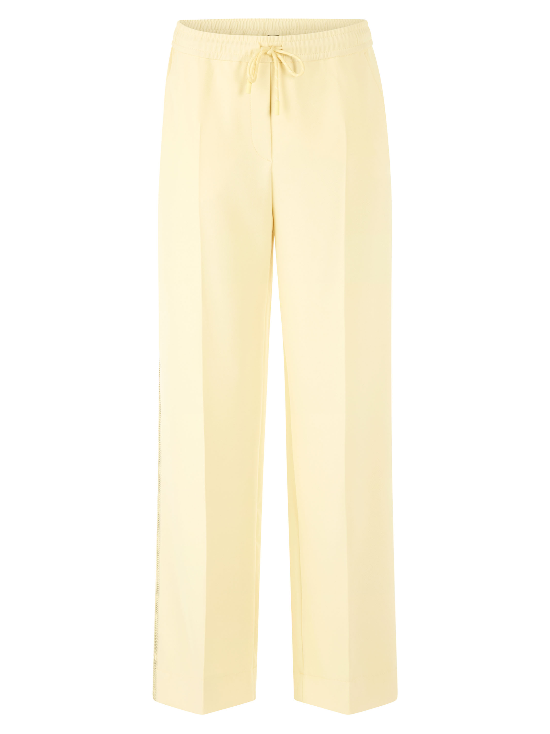 Un pantalon de jogging de Marc Cain en jaune pastel. La taille est dotée d’une bande élastique finement plissée avec un cordon dans une coulisse. Au centre des jambes droites se trouve un pli repassé. Le pantalon possède des poches fendues et le long des côtés court une bande ornée de trois coutures couleur sable. Ce pantalon peut être lavé à 30 degrés.