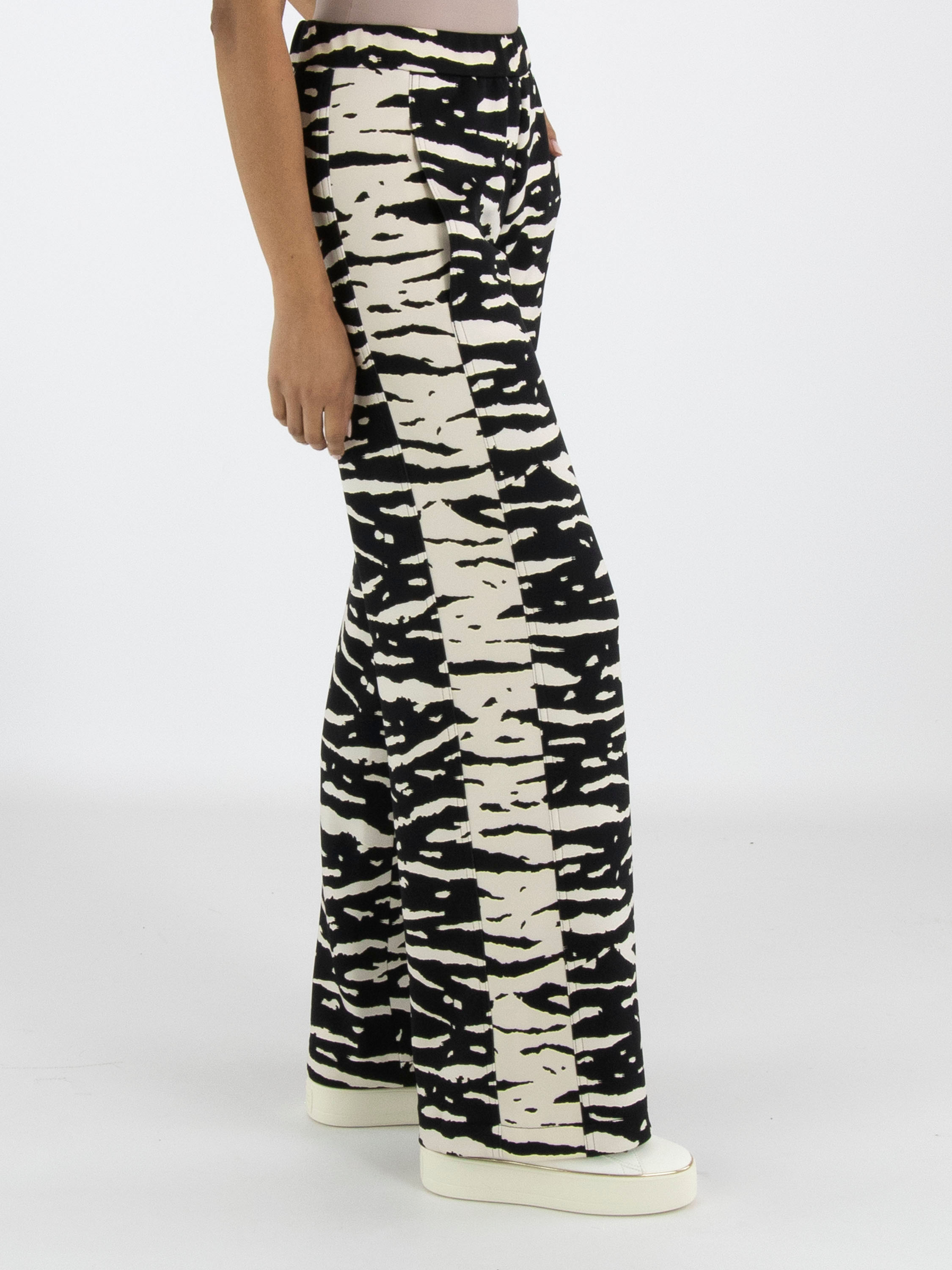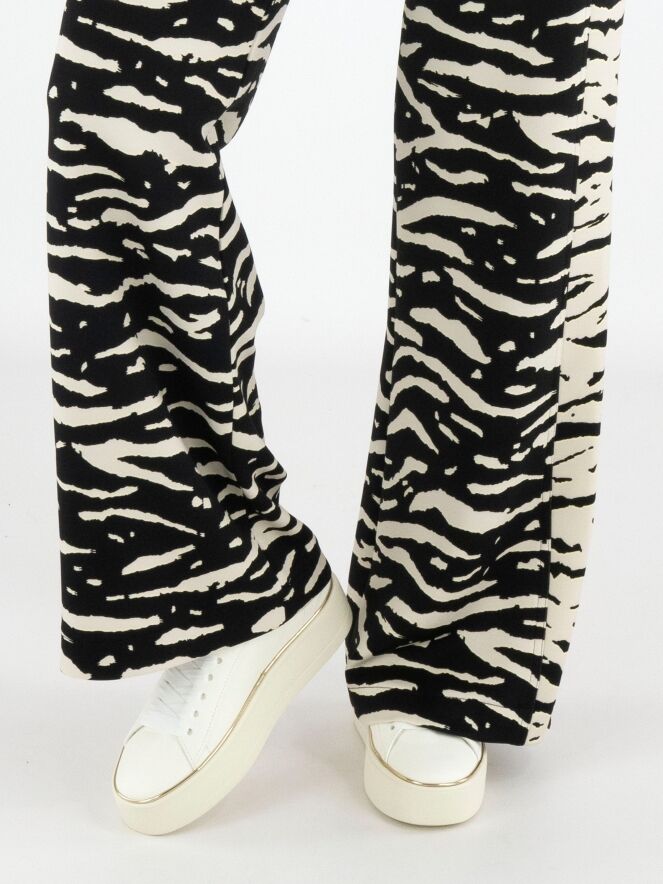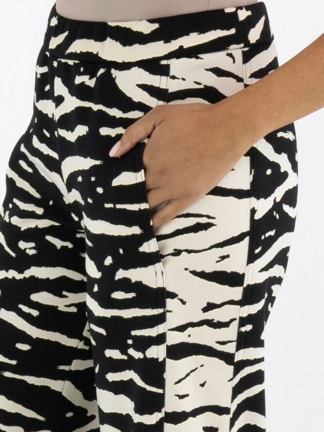 Un pantalon de jogging en matière scuba de Marc Cain à imprimé zèbre en noir et beige. La taille est élastiquée. Le long des côtés se trouve une large bande où l’imprimé zèbre est inversé en couleur recto verso. Le pantalon possède des poches fendues et peut être lavé à 30 degrés.