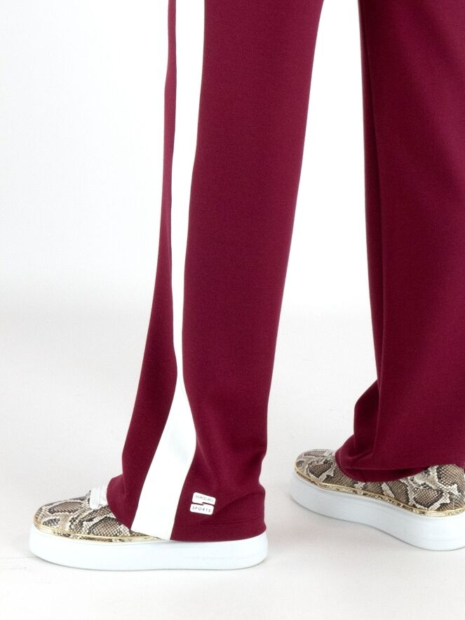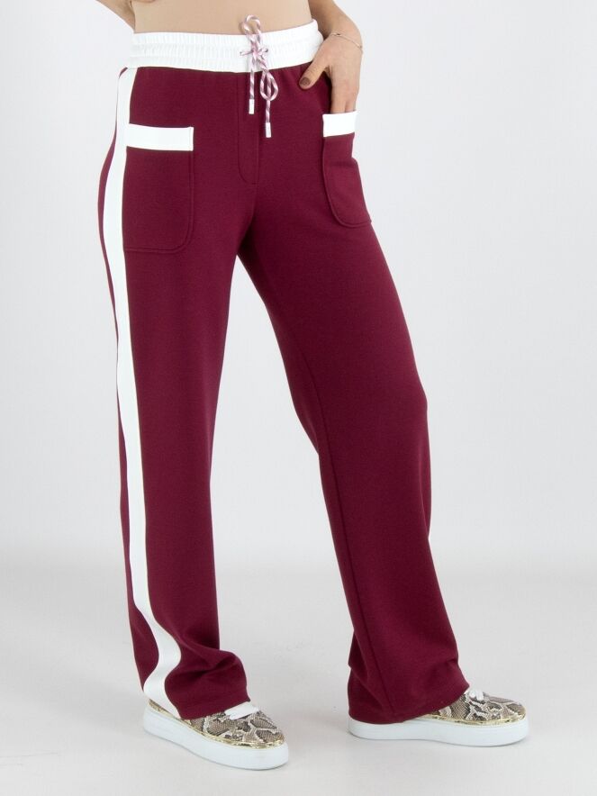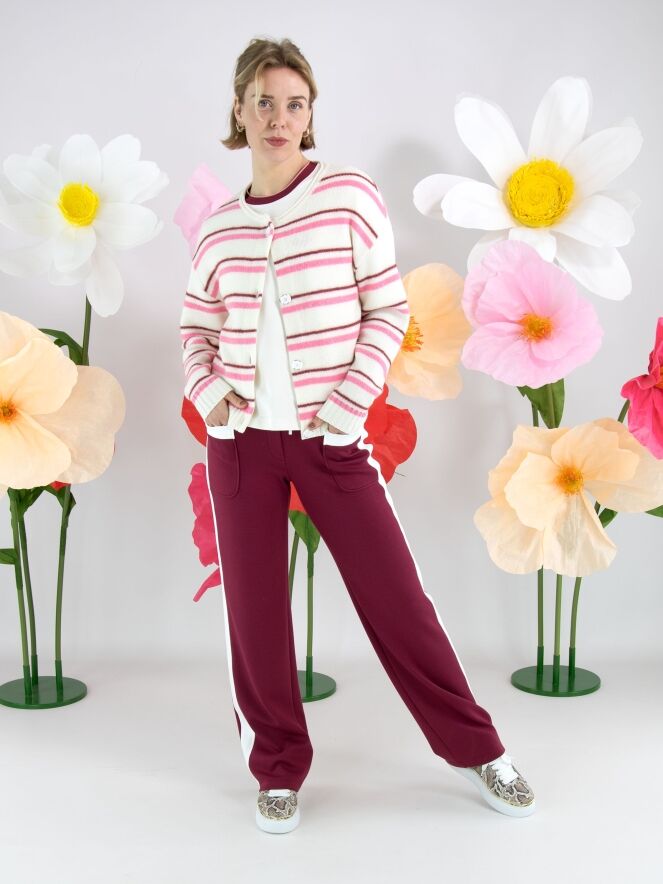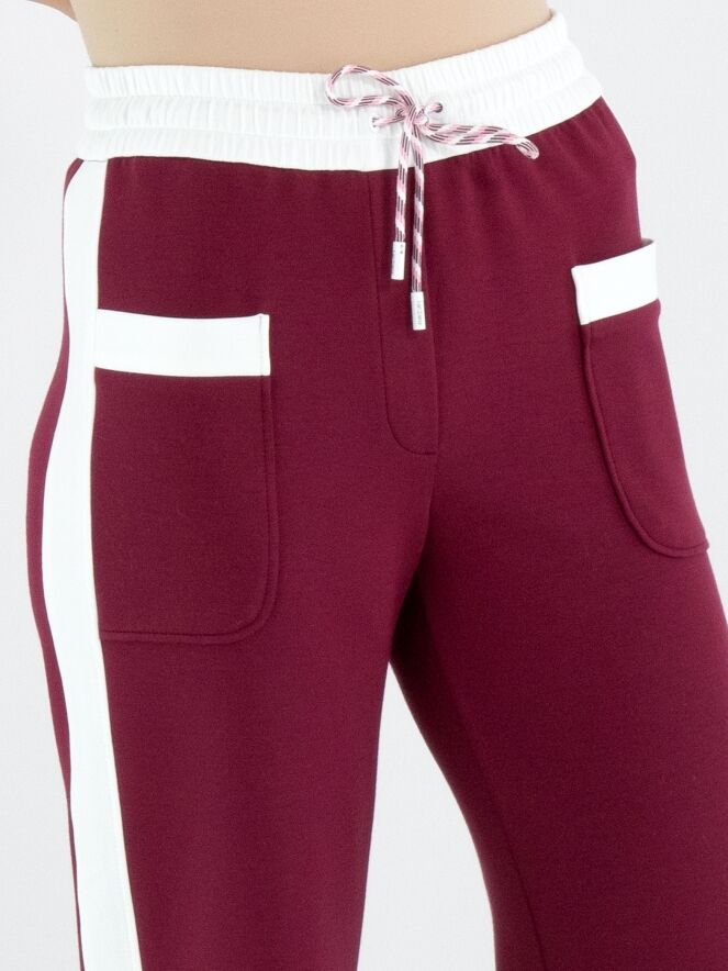 Un pantalon de jogging de Marc Cain en bordeaux. La taille comporte une large bande élastique crème, finement plissée, avec un cordon dans une coulisse. Le long des jambes à coupe droite se trouve une large bande crème sur les côtés. Ce pantalon peut être lavé à 30 degrés.