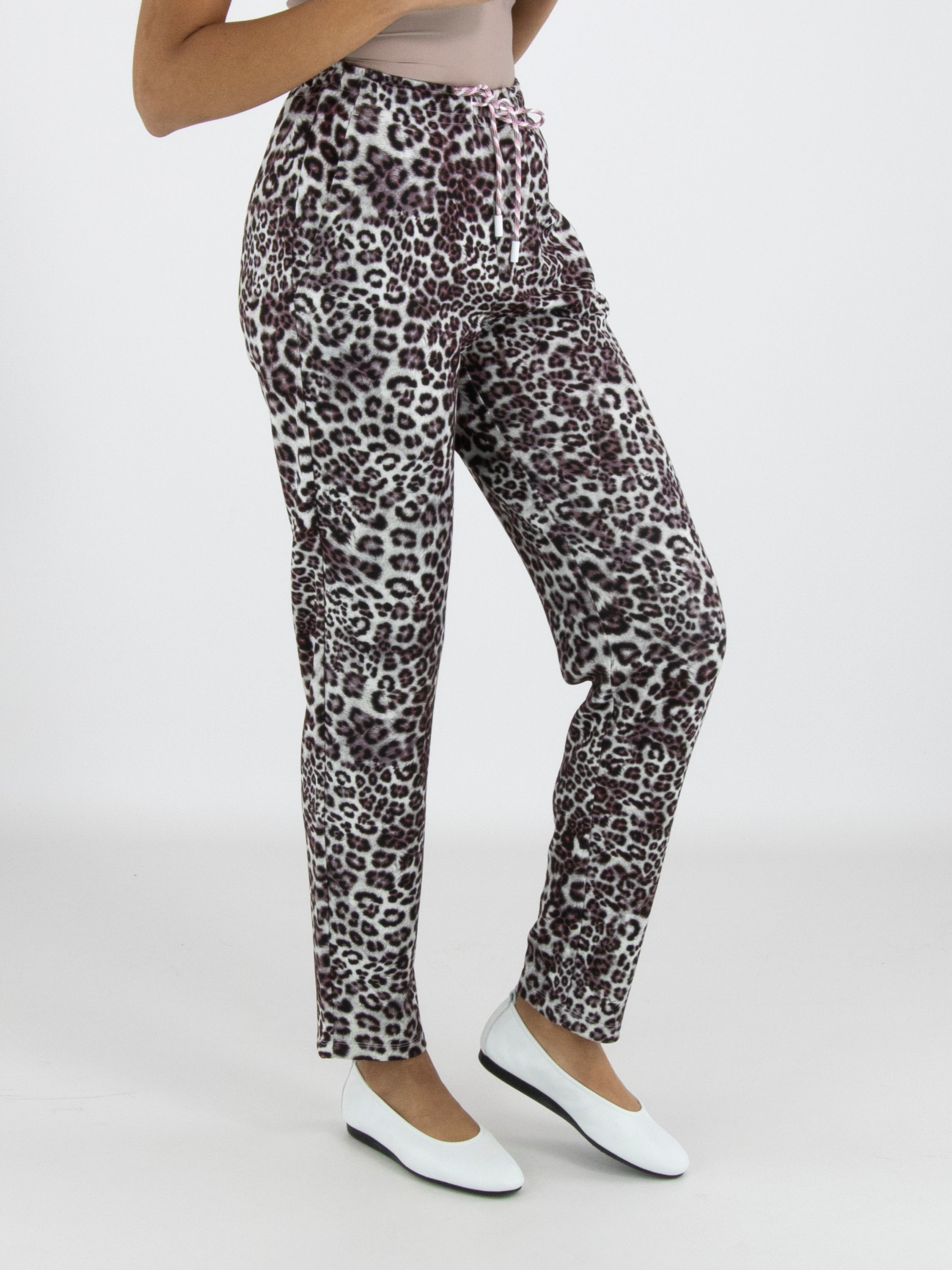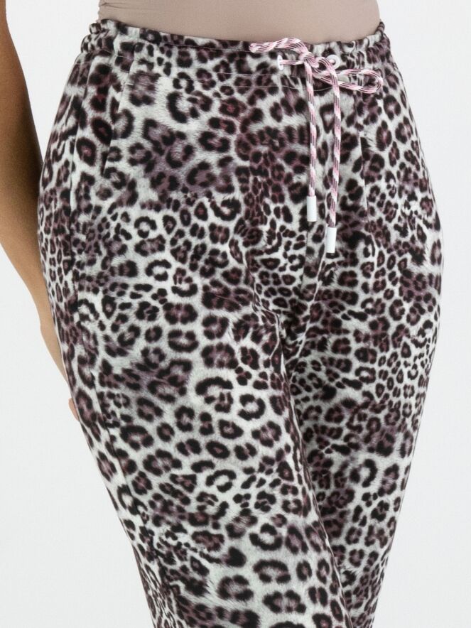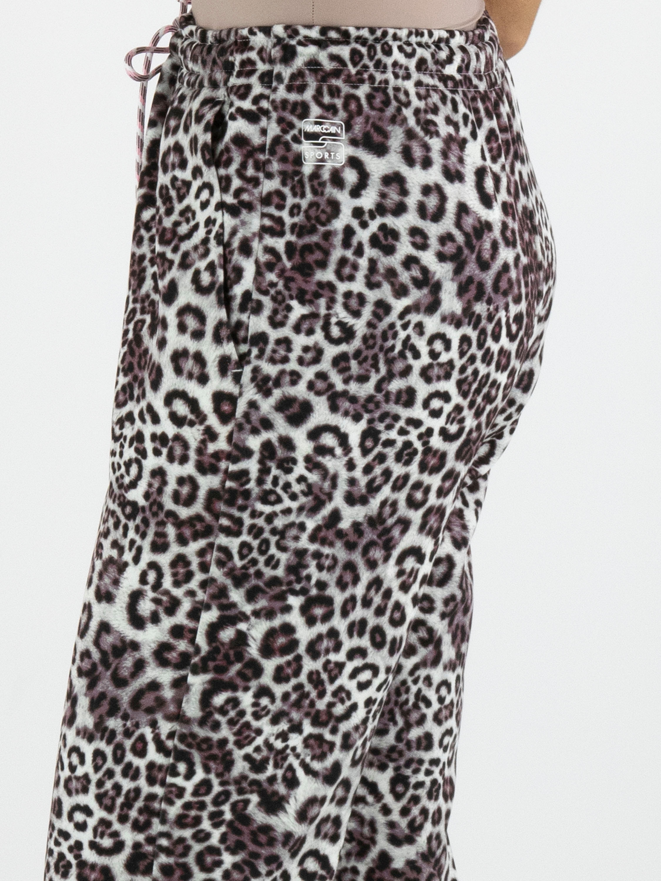 Un pantalon en qualité scuba de Marc Cain avec un imprimé léopard dans plusieurs nuances de gris, bordeaux et blanc. La taille est dotée d’une bande élastique avec un cordon dans une coulisse. Le pantalon possède des poches fendues et peut être lavé à 30 degrés.