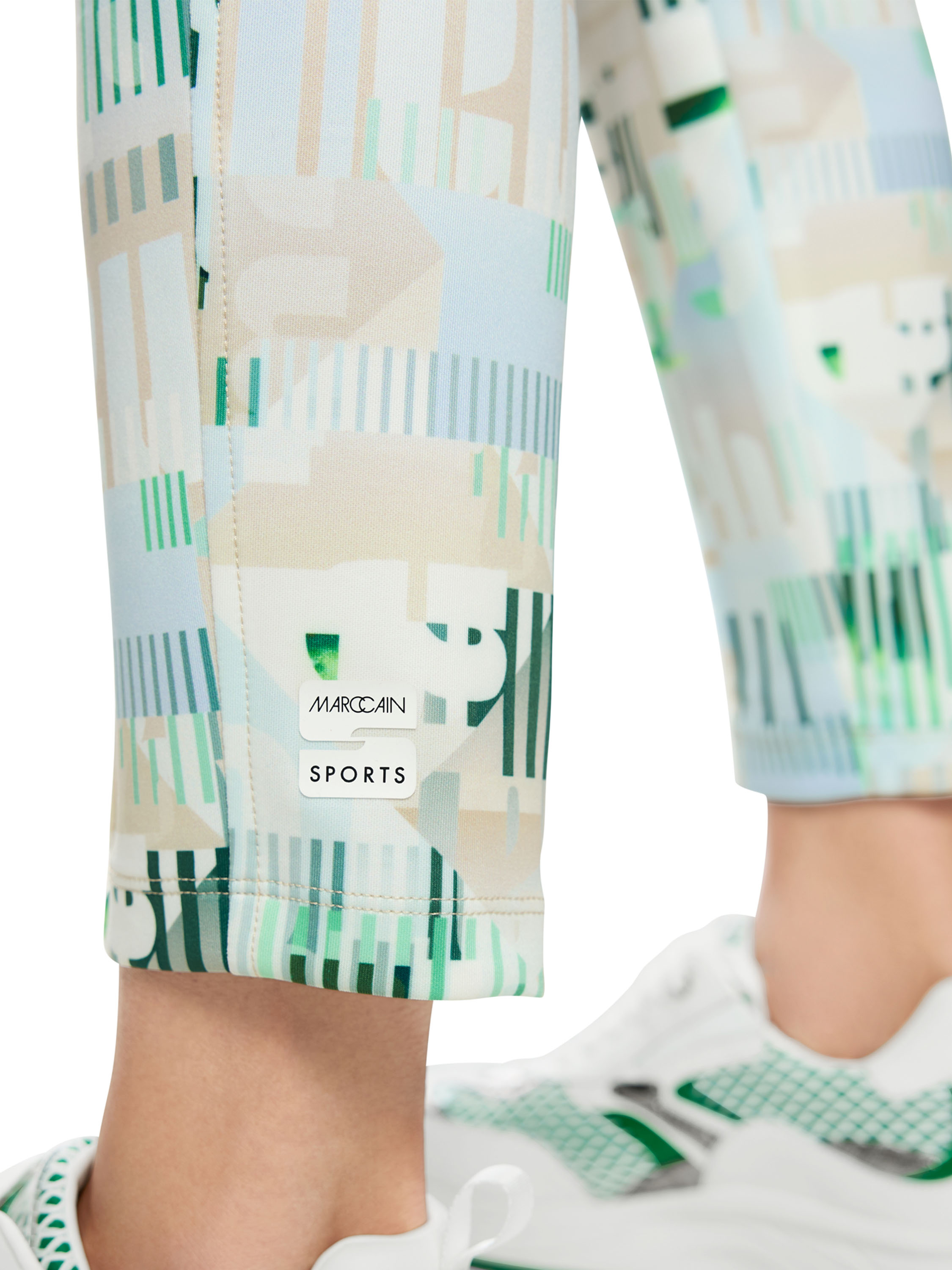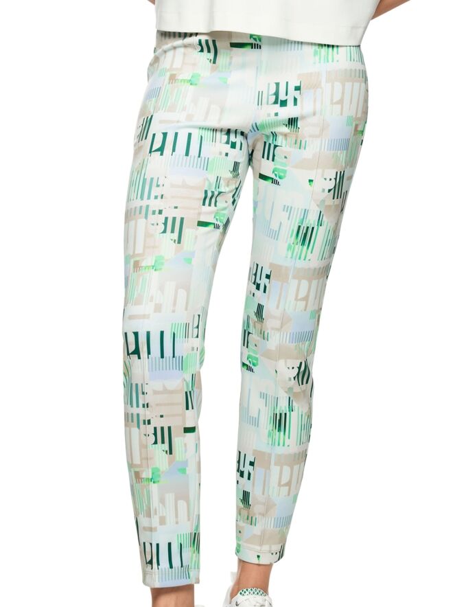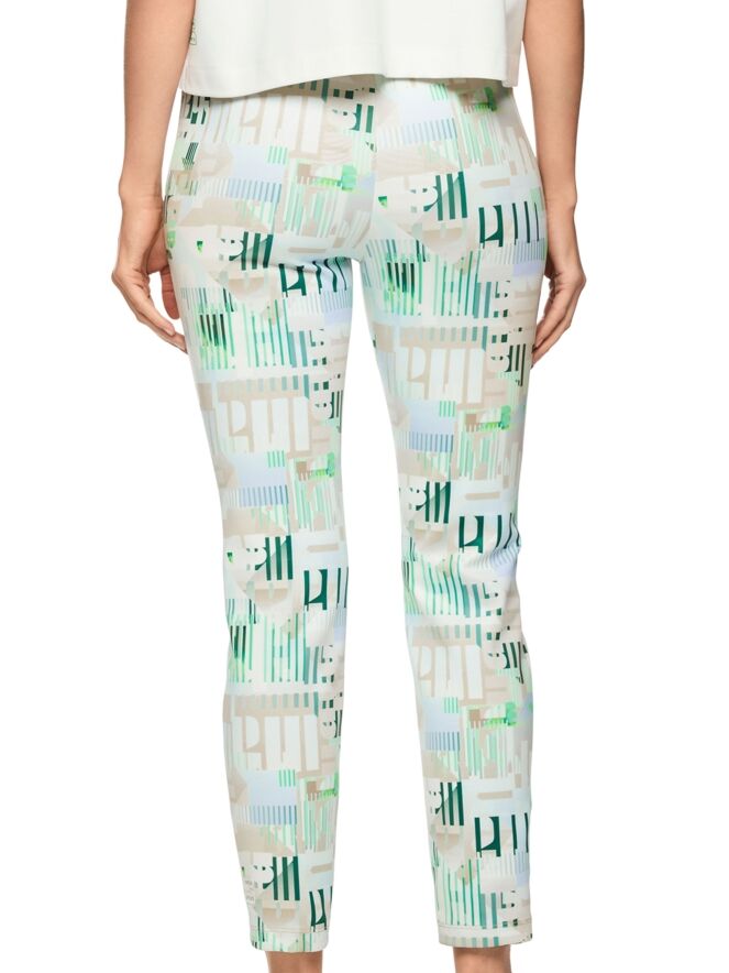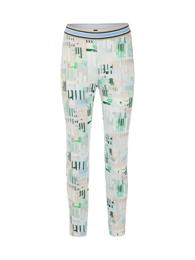Un pantalon de Marc Cain en qualité scuba avec un imprimé graphique de lettres et de rayures dans les tons bleu, sable et vert sur un fond blanc crème. La taille est dotée d’une ceinture élastique à motif rayé dans les tons bleu, sable, blanc et vert foncé. Ce pantalon peut être lavé à 30 degrés.