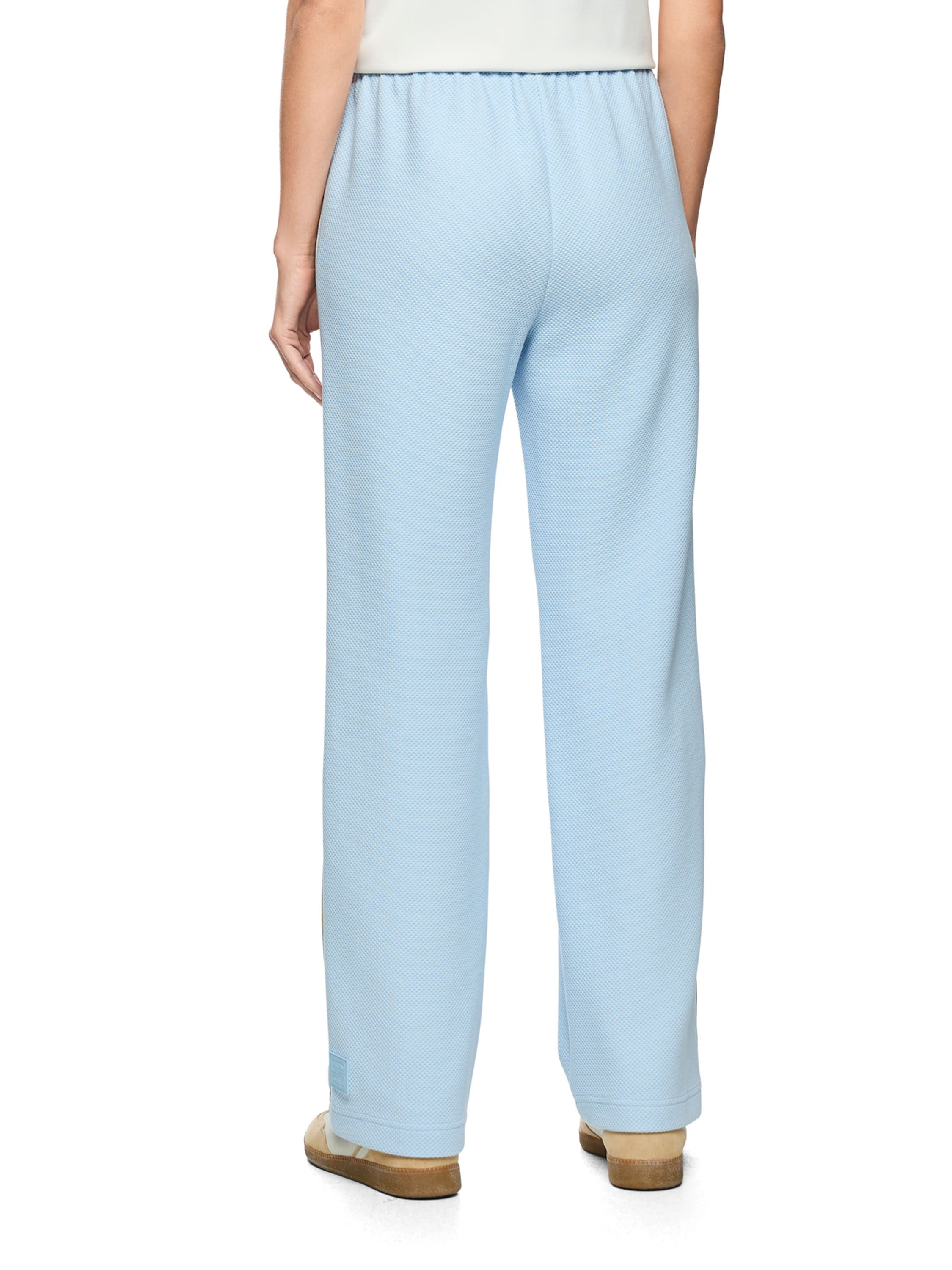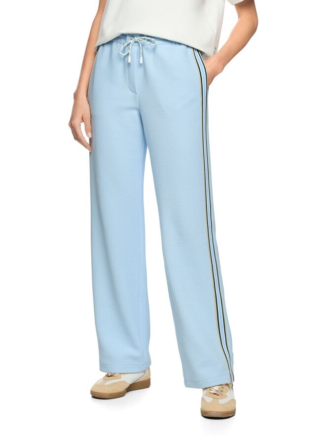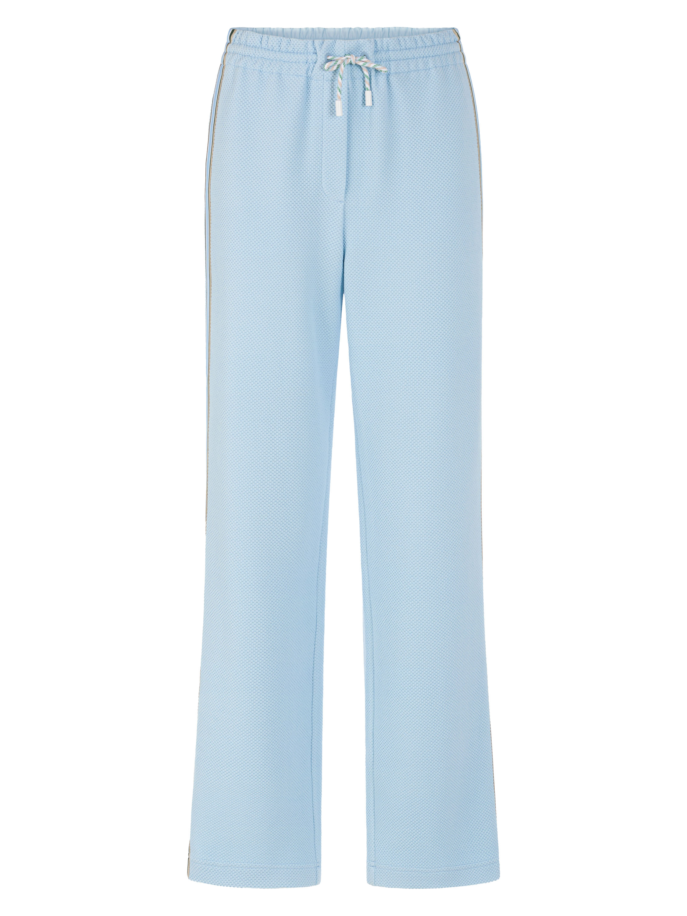 Un pantalon de jogging de Marc Cain en bleu avec une structure grainée. La taille est dotée d’une ceinture élastique plissée avec un cordon inséré dans un tunnel. Le long des côtés se trouve une large bande à rayures dans les tons sable, vert et deux nuances de bleu clair. Le pantalon possède des poches latérales et peut être lavé à 30 degrés.