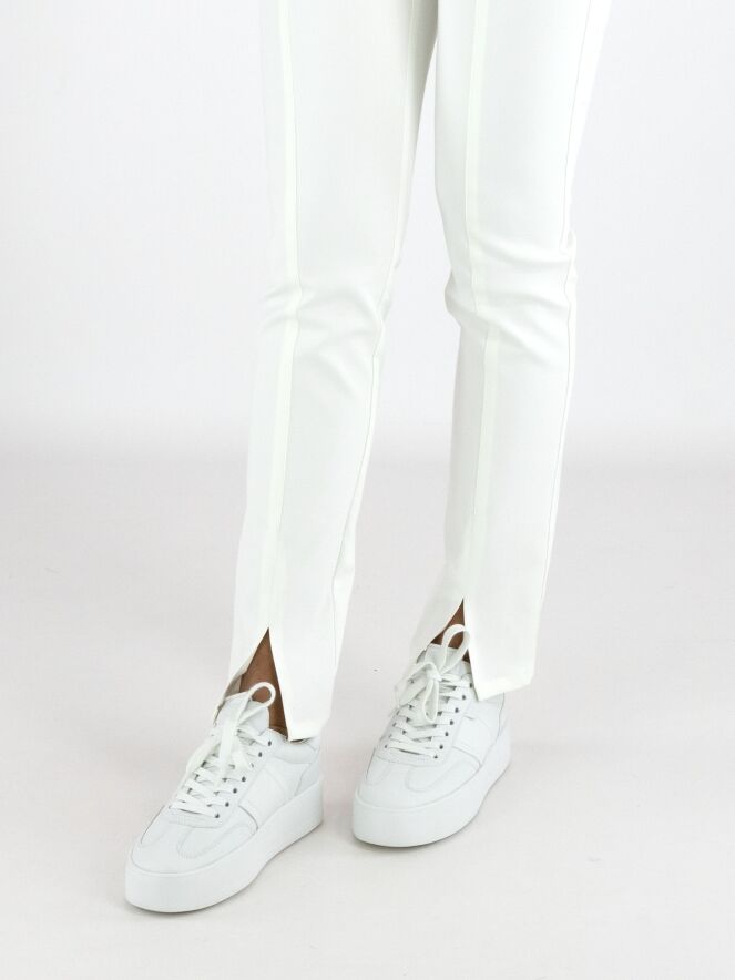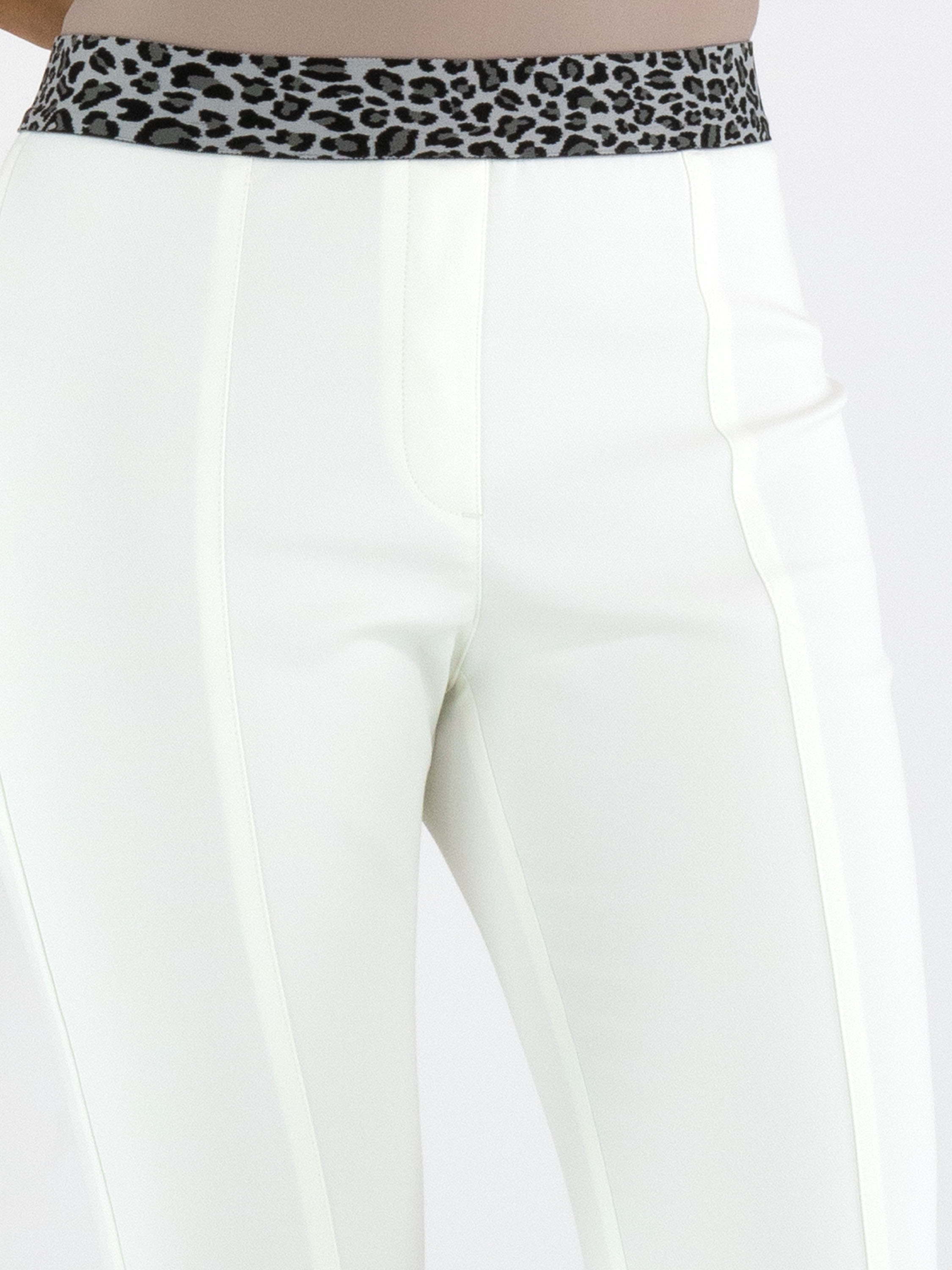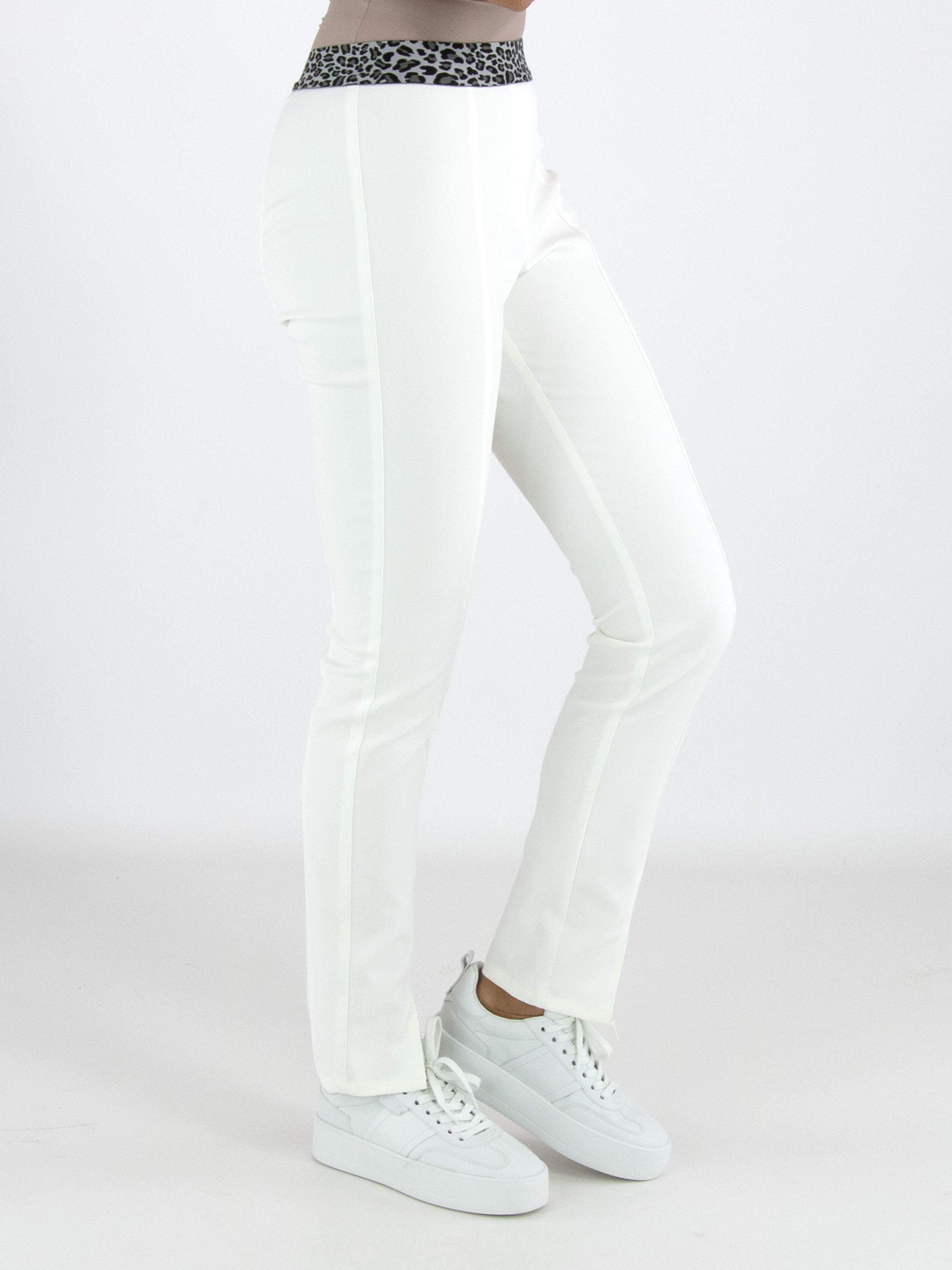 Un pantalon de Marc Cain en blanc cassé uni. La taille est dotée d’une bande élastique à imprimé léopard dans plusieurs nuances de gris et de noir. Une couture traverse le centre des jambes. En bas, sur le côté extérieur, se trouve une petite fente. Ce pantalon peut être lavé à 30 degrés.