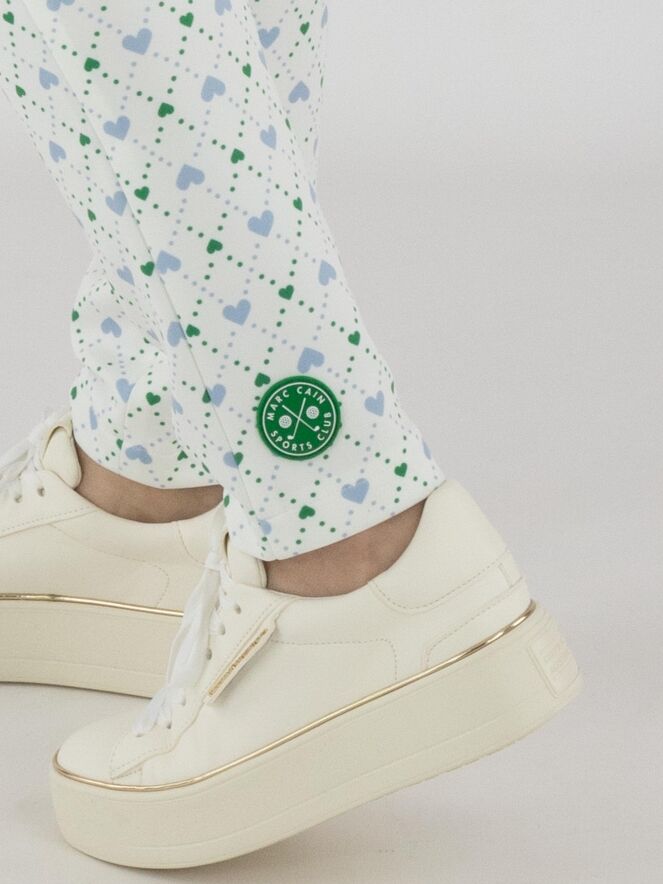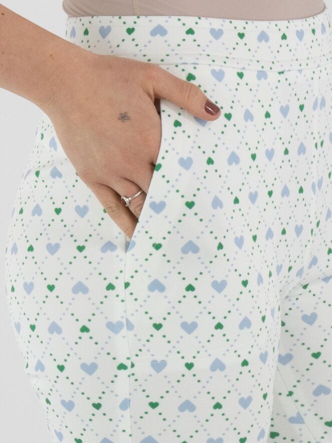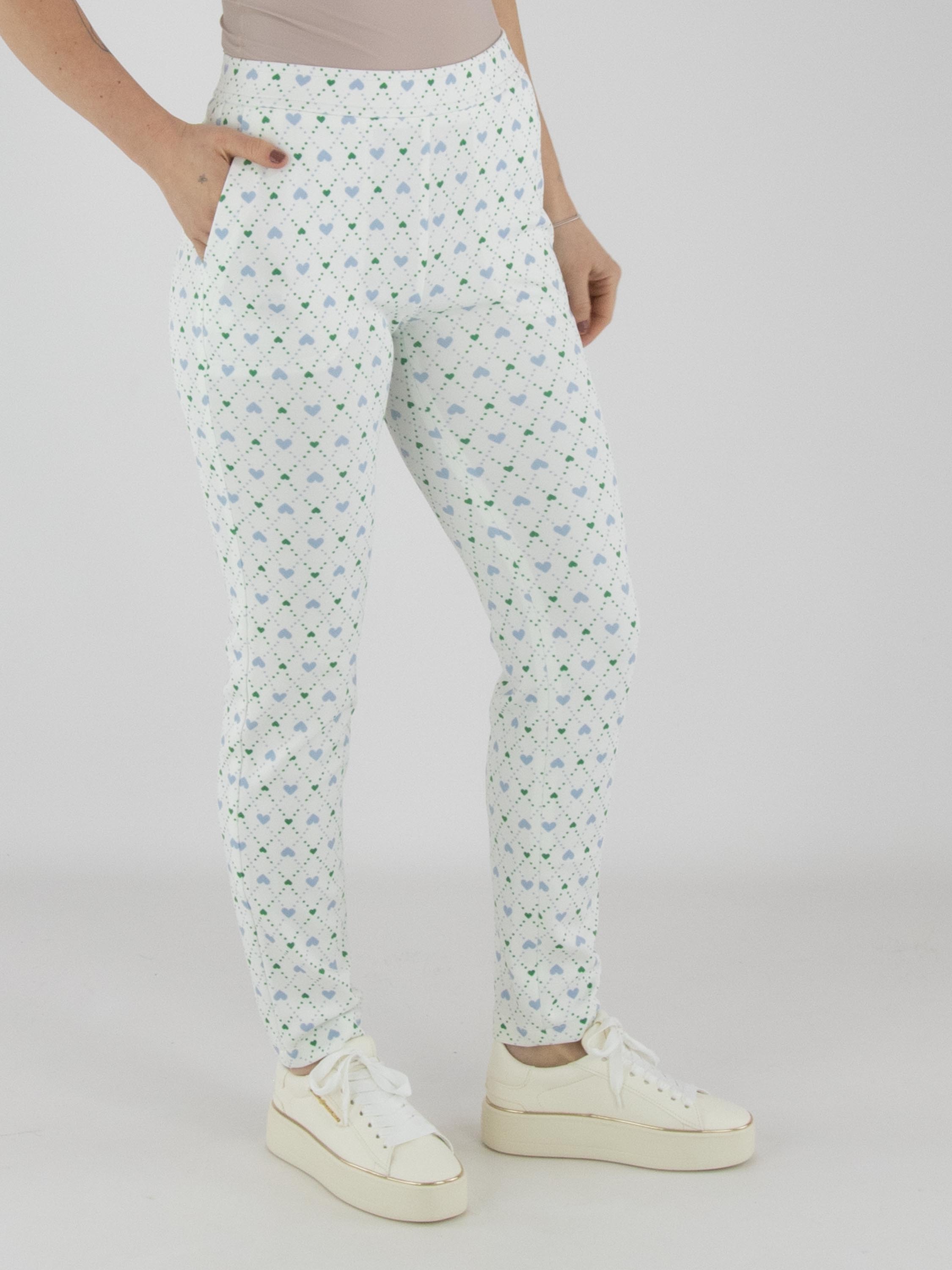 Un pantalon de Marc Cain en qualité scuba avec un imprimé à carreaux agrémenté de pois et de motifs cœur dans les tons bleu et vert foncé sur un fond blanc crème. Le pantalon possède des poches latérales et une taille élastiquée. Ce pantalon peut être lavé à 30 degrés.