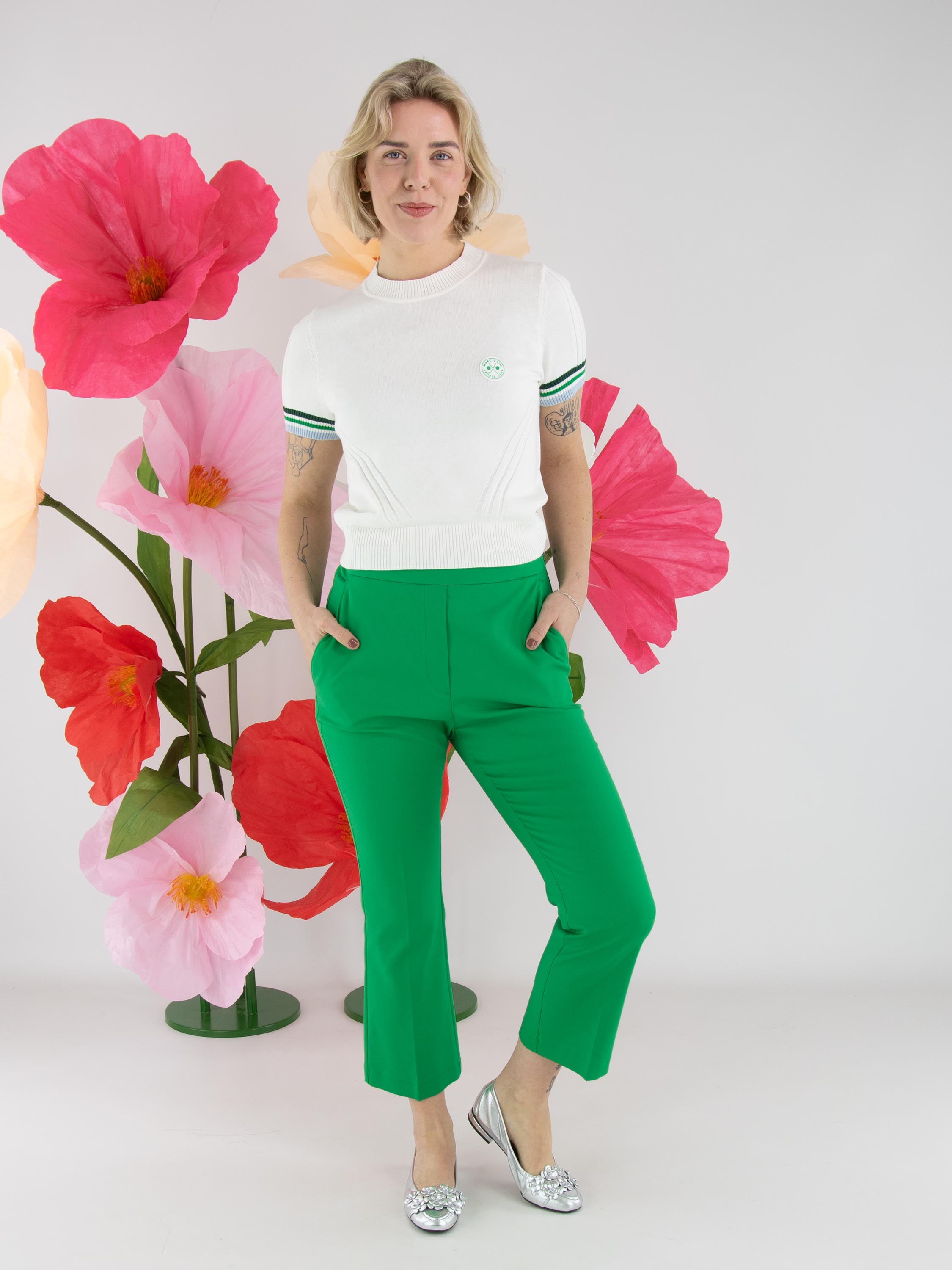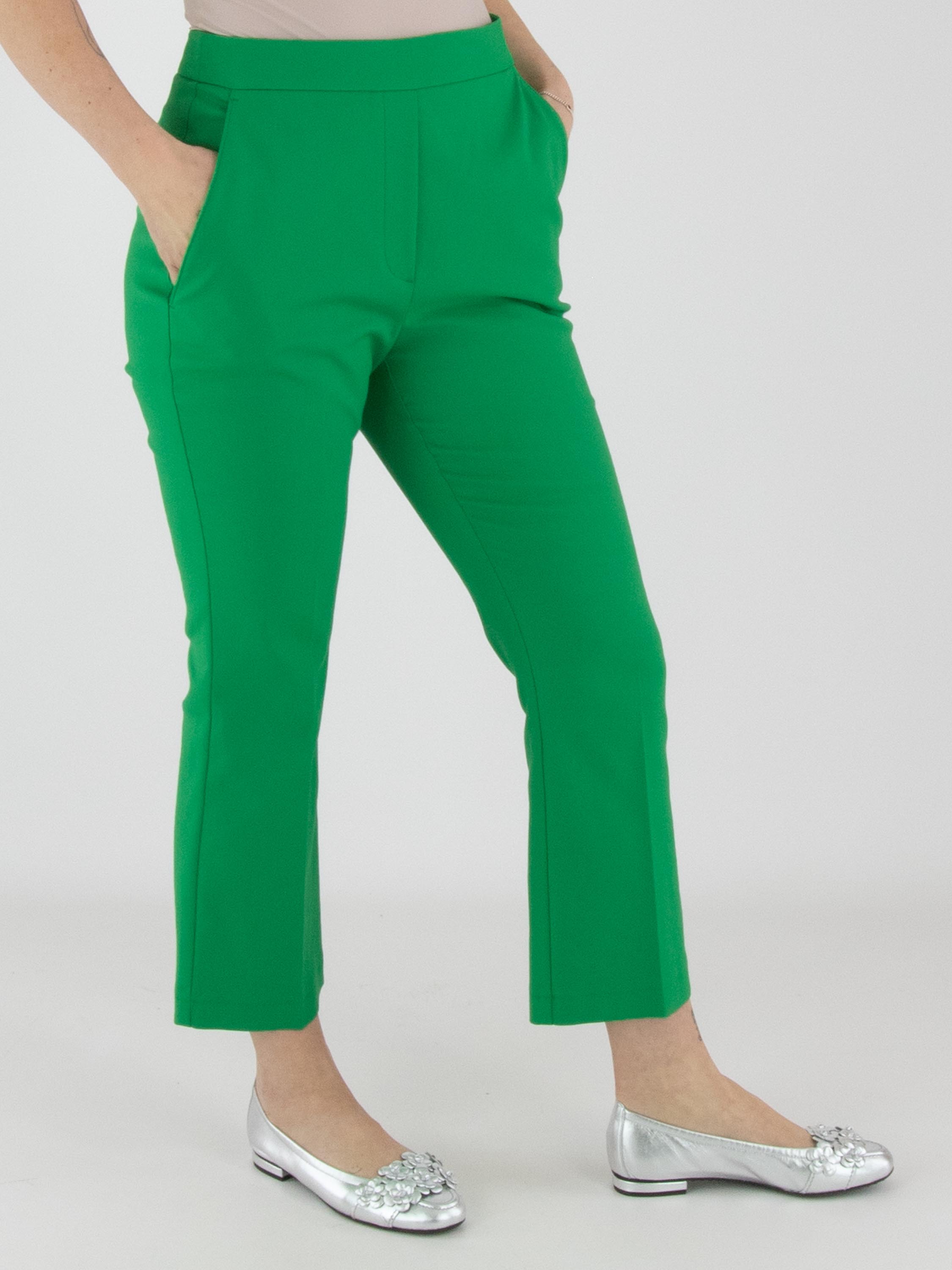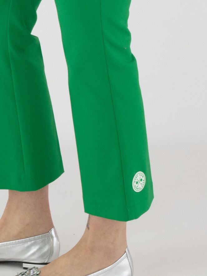 Un pantalon de Marc Cain en vert. Sur le côté gauche, une fermeture éclair descend de la taille jusqu’à la hanche. Un pli marqué court au centre des jambes. Le pantalon possède des poches latérales et peut être lavé à 30 degrés.